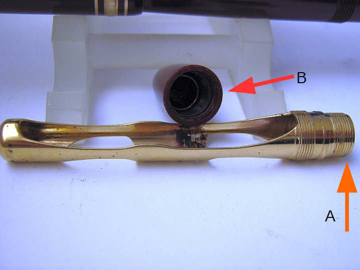 Quello che mi piace meno, nella 147, è il fatto che la vite del portacartucce (A), in metallo, vada ad impanare in una filettatura (B) in "precious resin" (plastica)