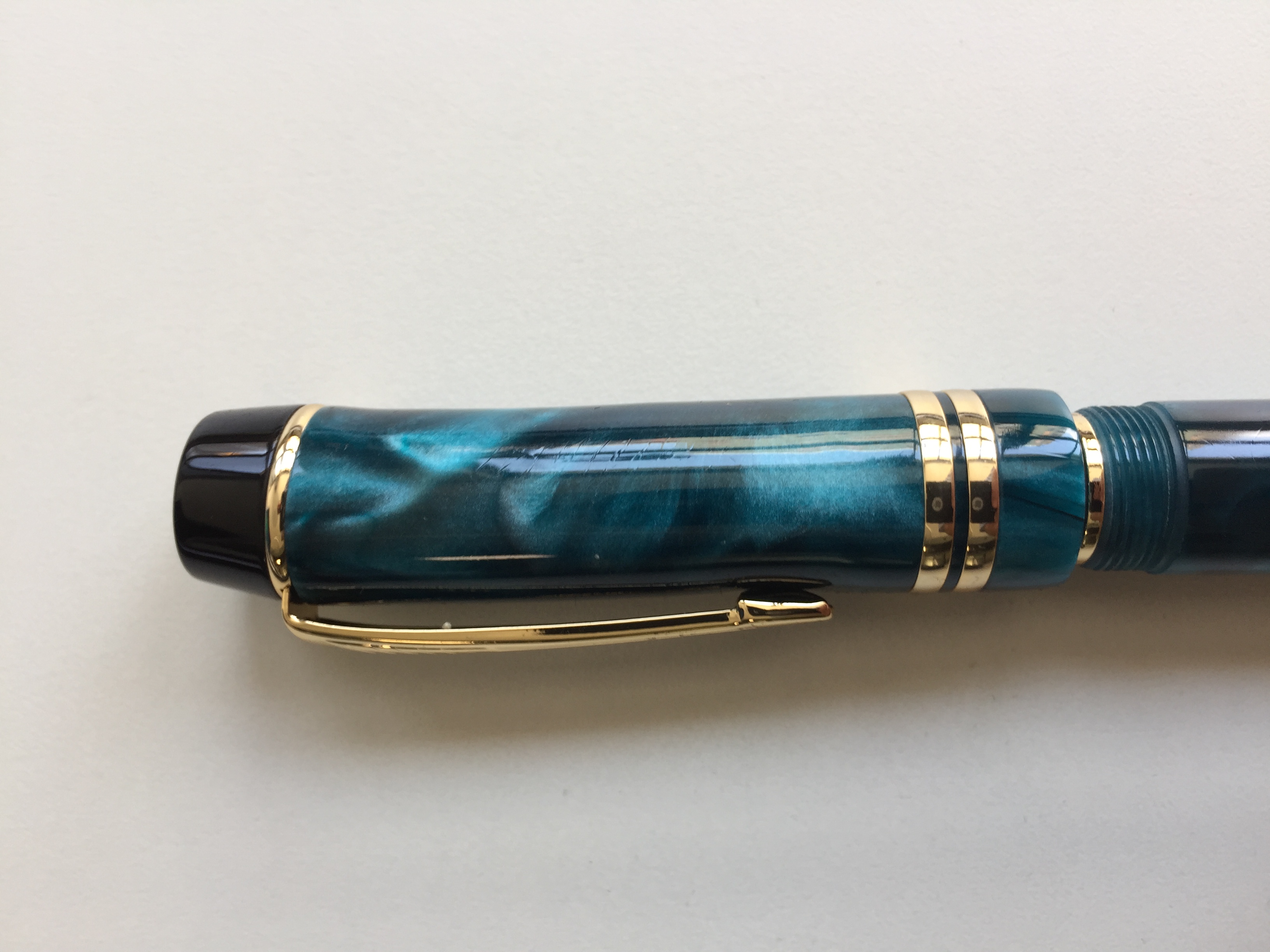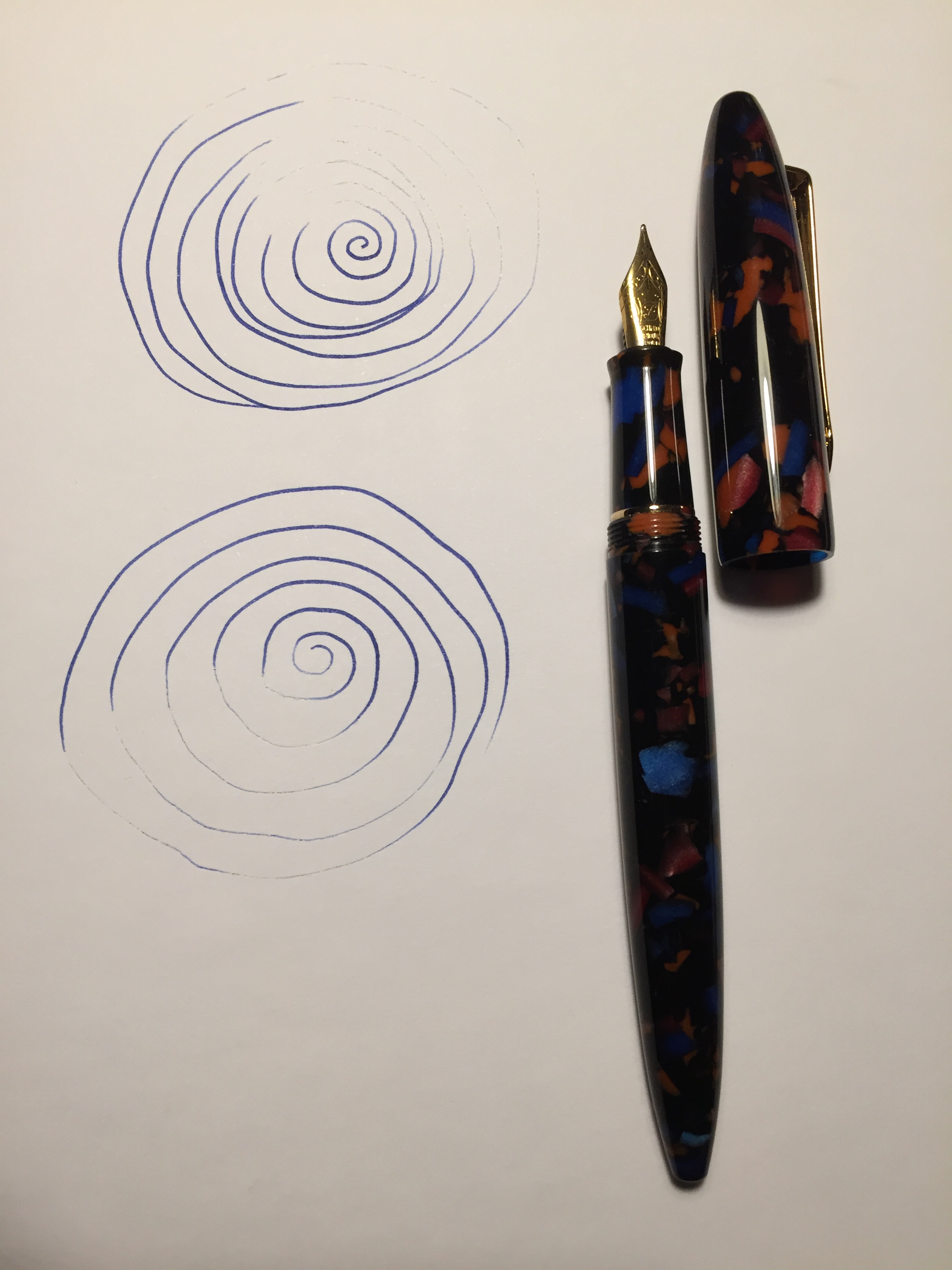si tratta di una Kaco Retrò (lo sfizio non era legato al nome abbastanza evocativo ...). Ho acquistato quella in bluette con fermaglio color rame e pallina color arancio. Viene fornita con una bella scatoletta in plastica non colorata e opaca stile TWSBI che contiene, oltre alla penna, anche converter (più che discreto come qualità) e due cartucce attacco standard. Prezzo "cinese". La penna scrive benissimo con un tratto M abbastanza marcato (questo può dipendere anche dall'inchiostro usato, in questo caso KWZ Spacer nad Wisla o inglesizzando Walk over Vistula che tradotto letteralmente indurrebbe visioni sacre di uomini che camminano sulle acque