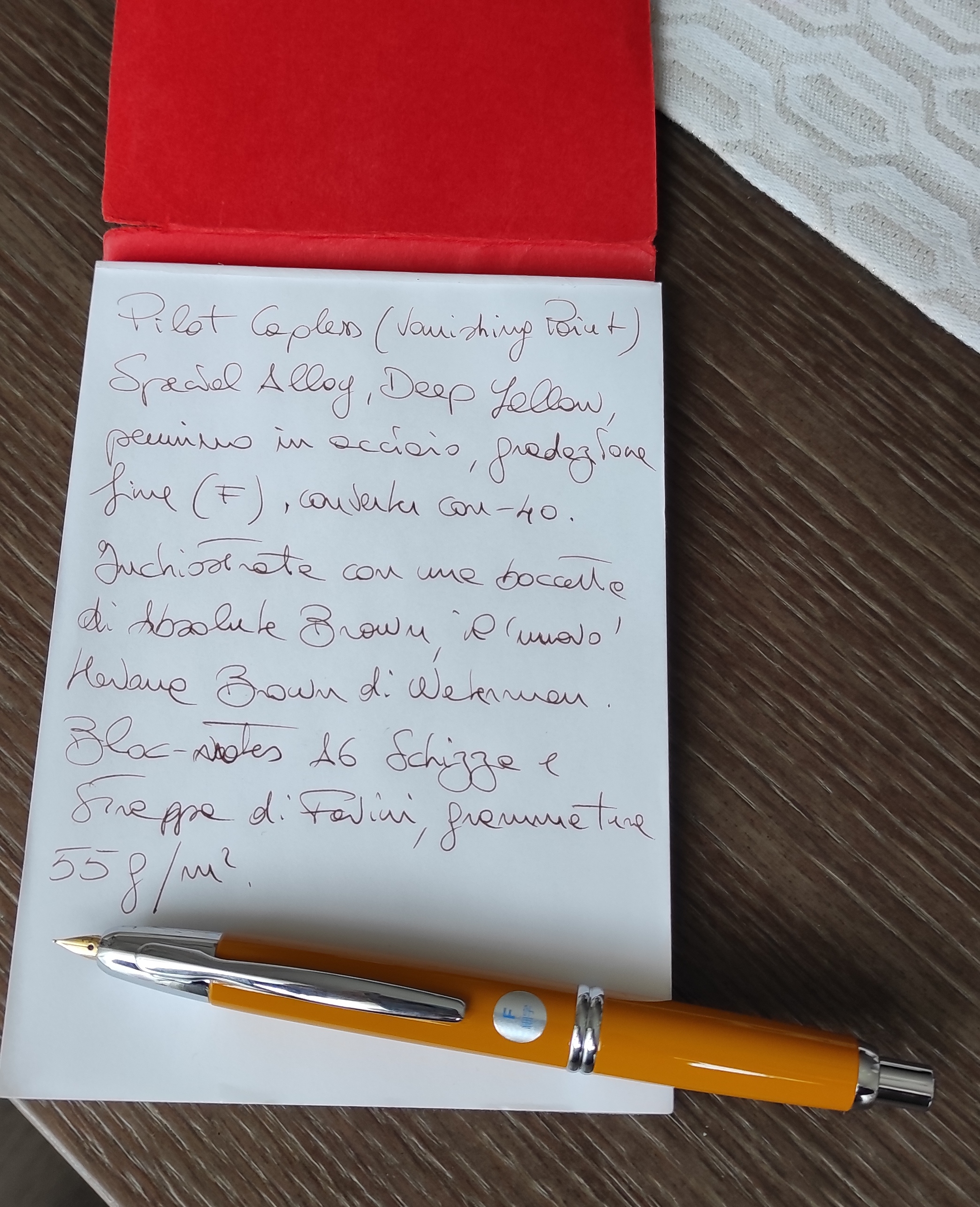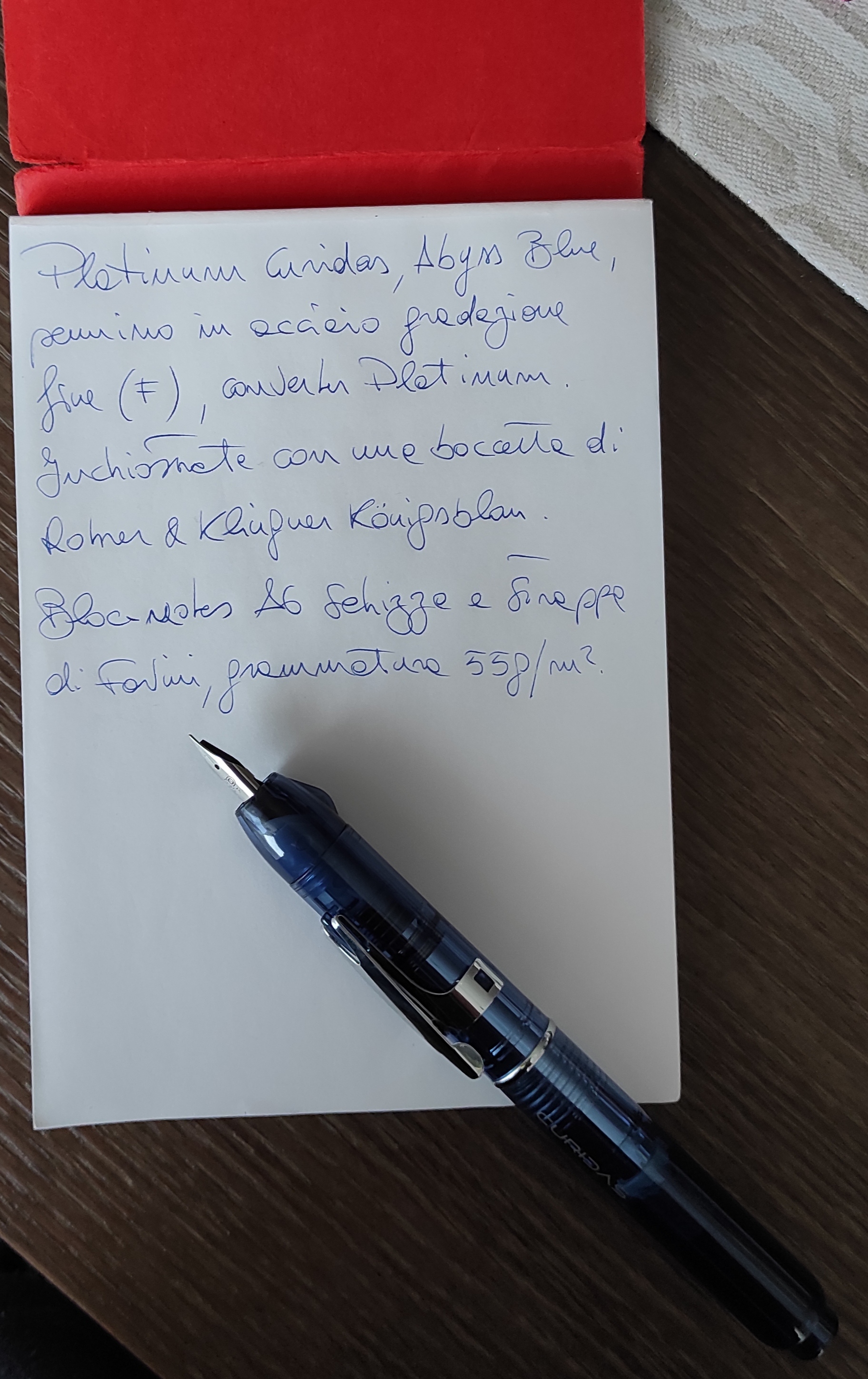 Il pennino Fine, in acciaio dorato, è straordinariamente scorrevole, sono molto colpito, non immaginavo: è sottile come ti aspetteresti da un fine giapponese, l'ho provata subito (ieri sera) con il buon vecchio Absolute Brown di Waterman, che ahimé non è più lo splendido Havana di un tempo ma fa ancora in suo dovere a un prezzo accettabile.