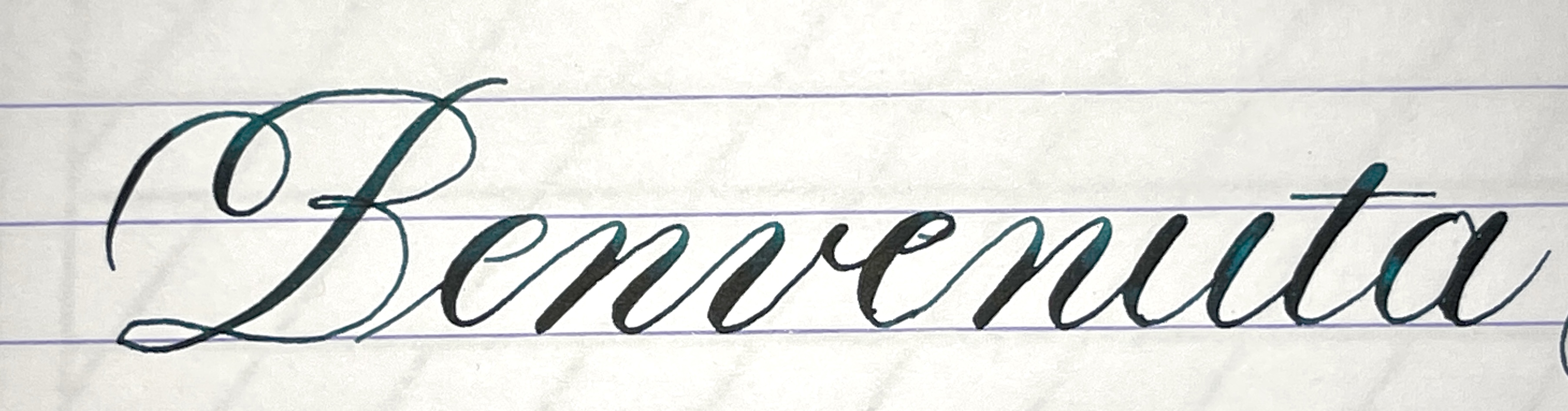 Ho fatto un paio di prove sulle carte peggiori che ho in casa. Di solito scrivo sui quaderni Favorit o su Clairefontaine Trimphe (quella del “Benvenuta” qui sopra) su cui non c’è nessun problema.