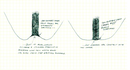 Nel caso del baby-bottom il pennino nasce così di fabbrica e, a causa di una levigatura eccessiva del pennino, in particolare a causa di un eccessivo arrotondamento della punta, l'inchiostro si ferma quel pelo più in alto e non tocca la carta impendendo una scrittura continua e soprattutto le partenze.