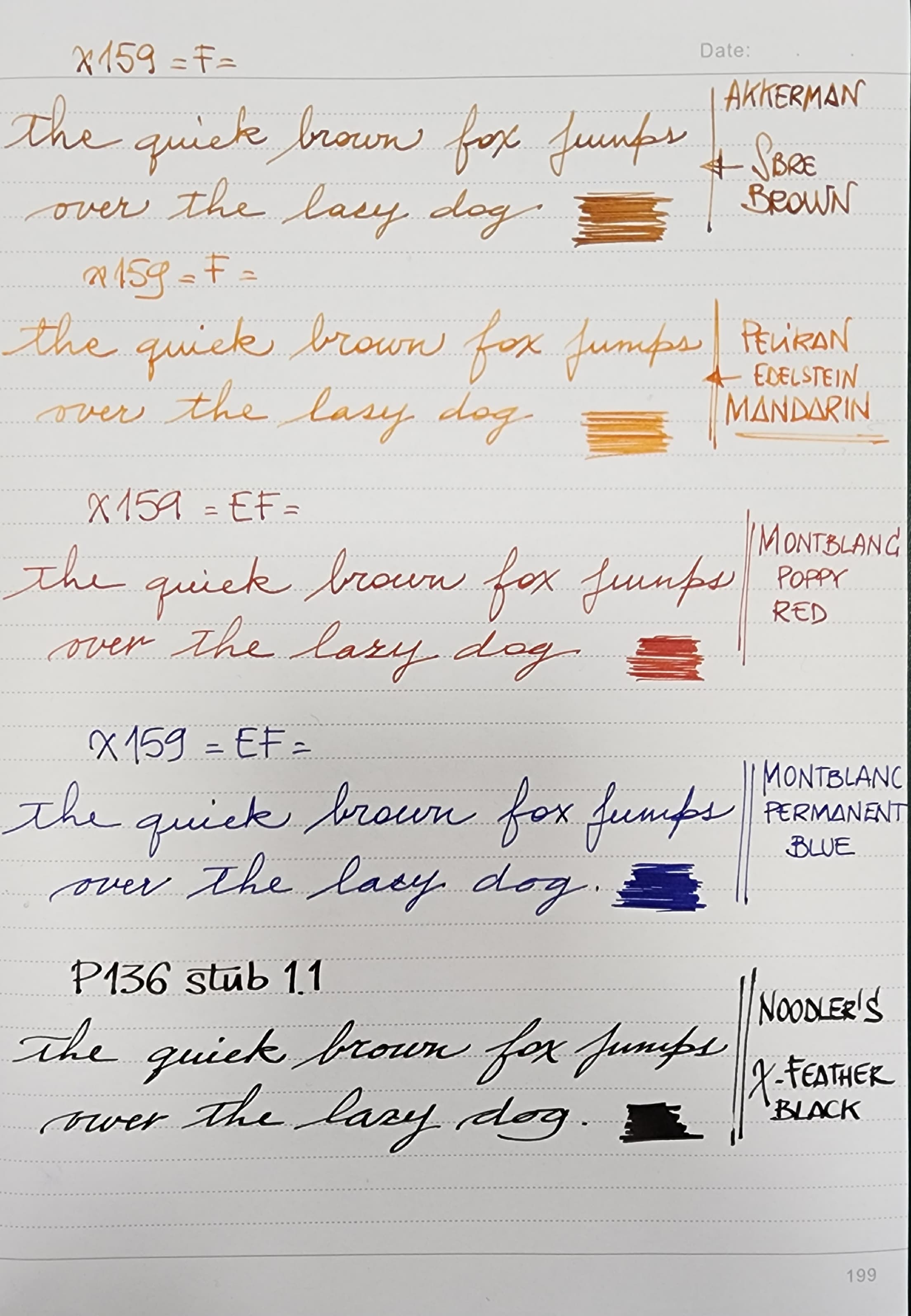 Con le cinesi non si sa mai cosa ti capita (nel senso che a comprarne un'altra non sai se si comporti allo stesso modo), questa però si sta comportando bene, flusso regolare, tratto fine non alla Pelikan, nessuna incertezza, salti, false partenze, anzi parte abbastanza regolarmente anche dopo un fermo abbastanza prolungato. Il pennino è scorrevole e non ha avuto bisogno di metterci mano, è rigido ma non un durissimo chiodo.