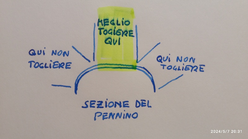 Questo è certo. In più dovresti considerare il secondo fattore. Cioè se la larghezza tra l'apertura nel mezzo e il bordo esterno è CURVA. A seconda del grado di curvatura del tratto in questione avrai maggiore flessibilità. In genere sulla maggior parte dei pennini la curvatura è più pronunciata sui fianchi che non sul dorso del pennino. Tanto che questo risulta quasi piatto. Allora è meglio togliere da lì che non dai fianchi.