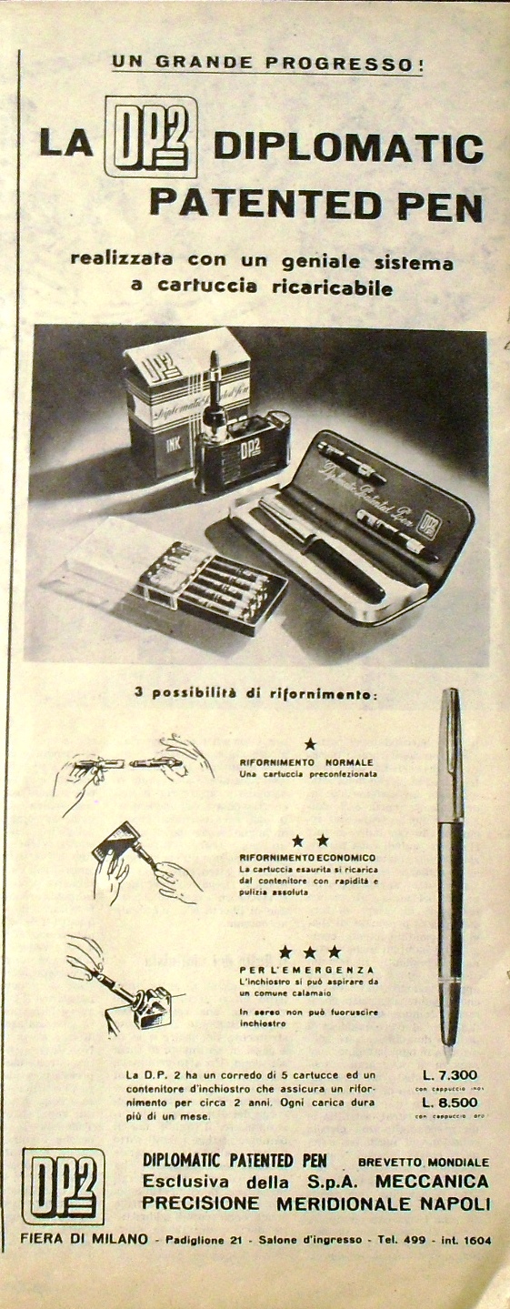 A Casirati ha scritto: lunedì 15 gennaio 2018, 18:13 Un'inserzione pubblicitaria tratta dal numero di "Epoca" del 17 Aprile 1955.DP2 Diplomatic Patented Pen - Epoca 14apr55.jpg
