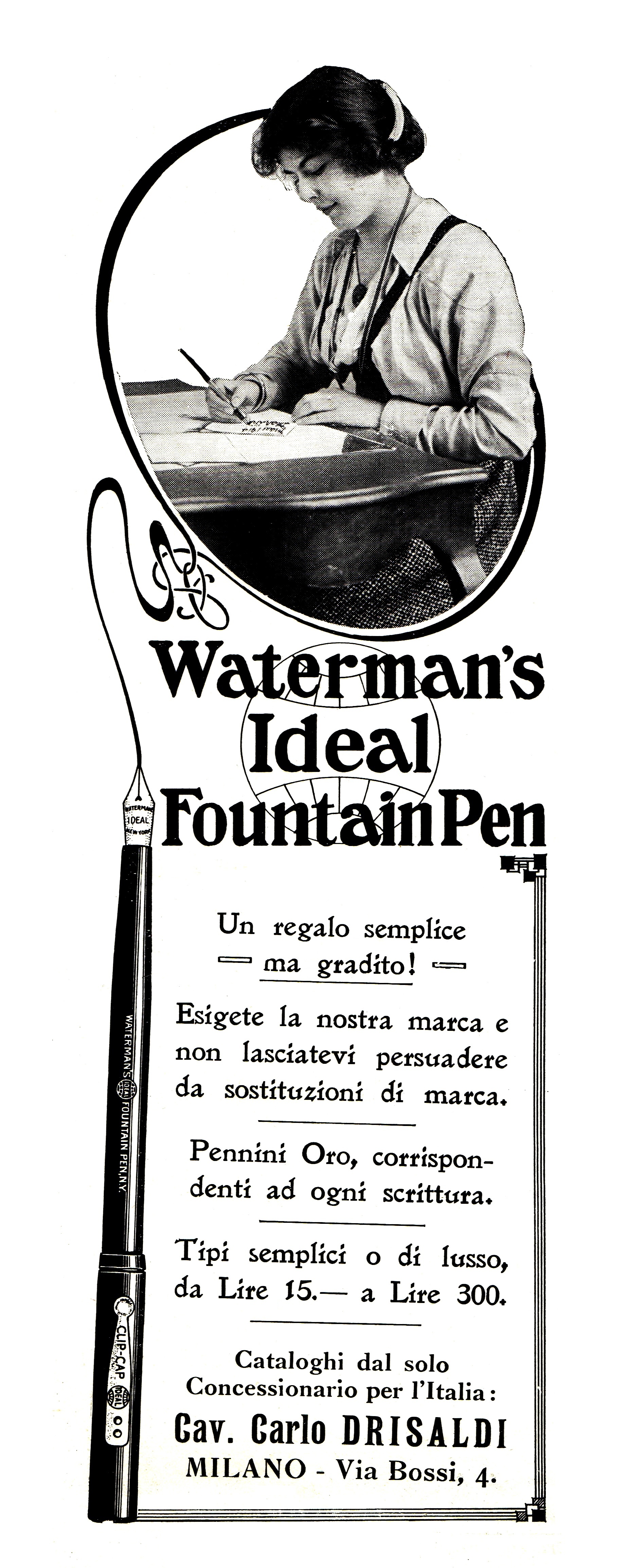 Il Concessionario, Cavalier Carlo Drisaldi di Milano, specifica di essere il “solo Concessionario per l’Italia”, e ciò forse anche perché proprio negli stessi mesi Riccardo Amisani di Torino, già rappresentante Williamson, provava ad accreditarsi come Rappresentante Waterman almeno per il Piemonte (https://www.fountainpen.it/File:1915-12 ... misani.jpg), dopo l’avvenuta revoca per motivi geopolitici della concessione nazionale alla “tedesca” Hardtmuth, avvenuta l’anno precedente dopo lo scoppio delle ostilità…