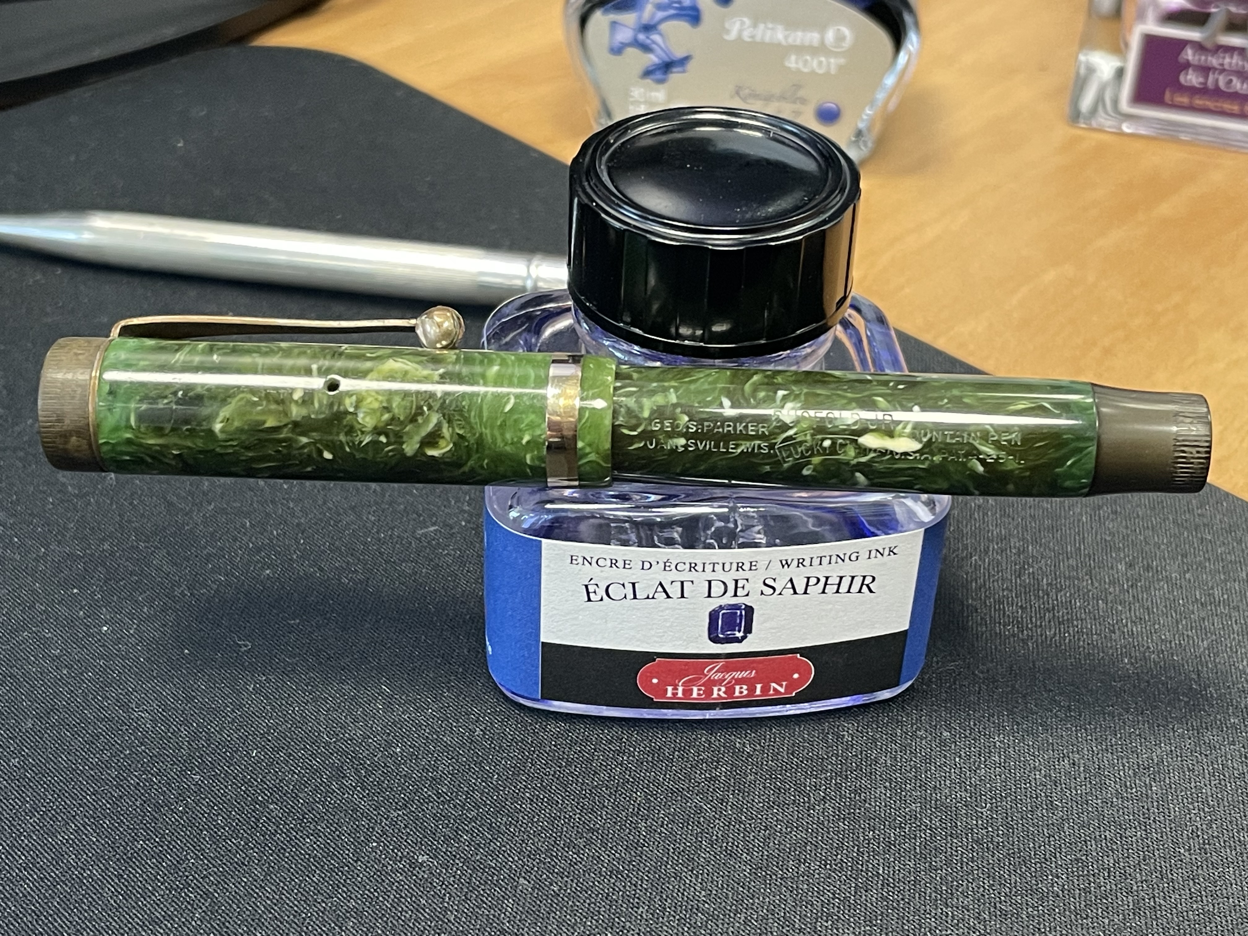 Penol President (in stile Duofold Junior) in celluloide, pennino Fine flessibile. A pulsante di fondo.