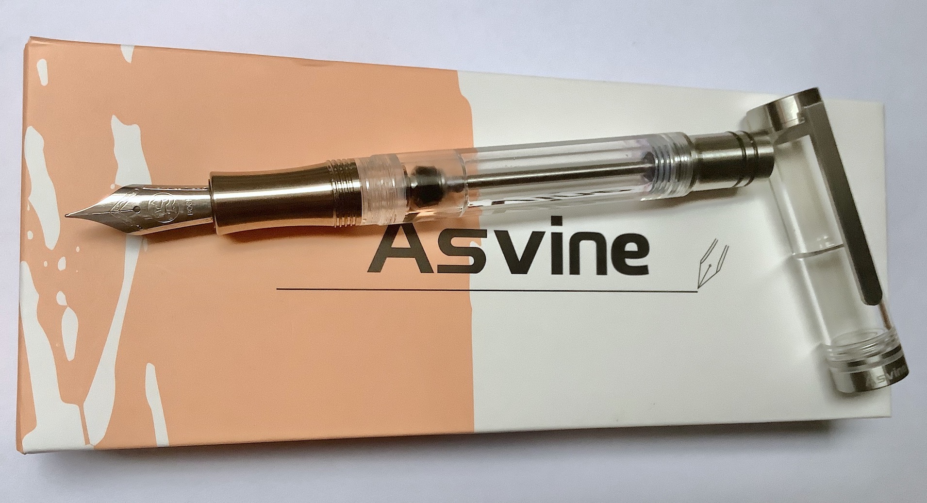 Ottima la presa sulla sezione ed ottimo anche il pennino Bock #6 (quello di Asvine che monta come alternativa , è forse troppo piccolo rispetto alle dimensioni del copro penna e visivamente un po' si perde). Metalleria in titanio o lega di titanio , vallo a sapere...