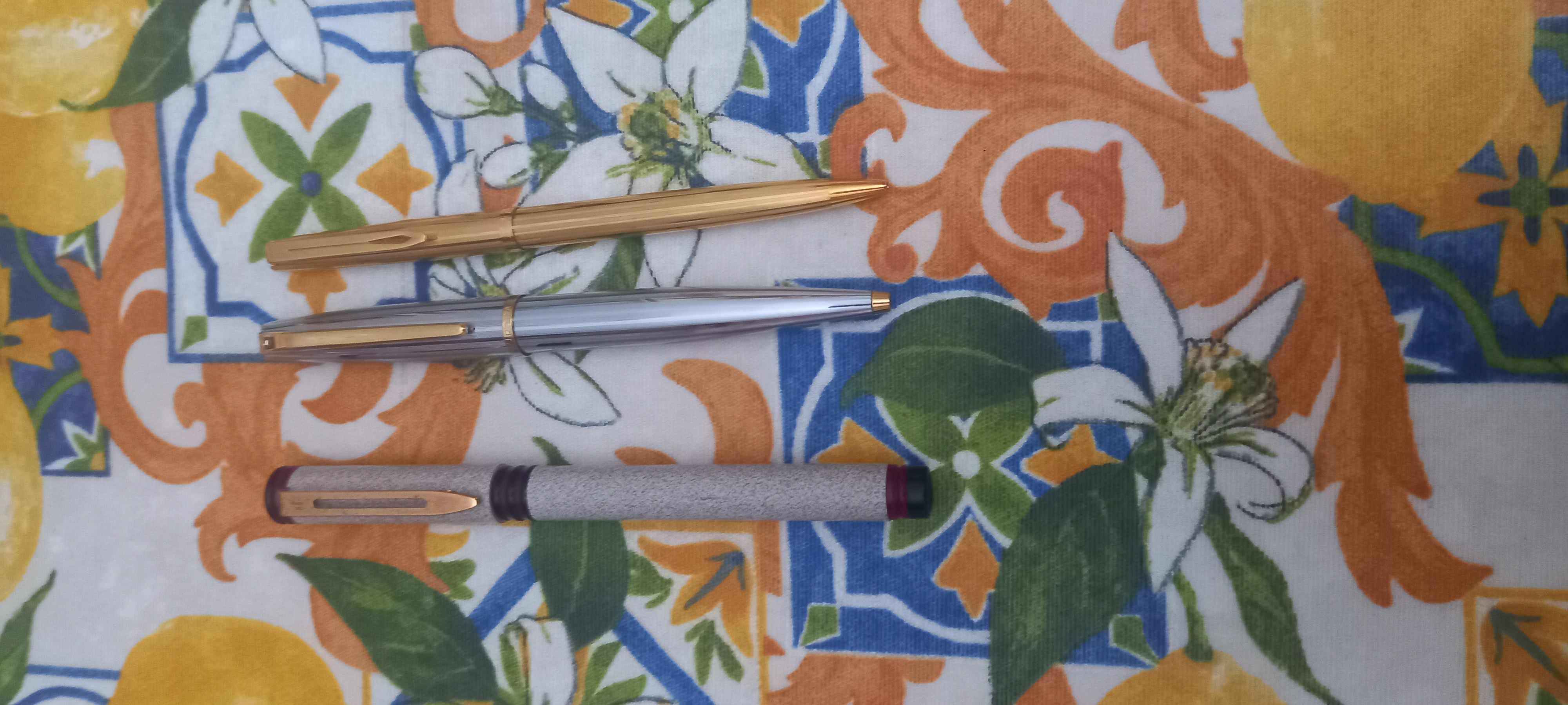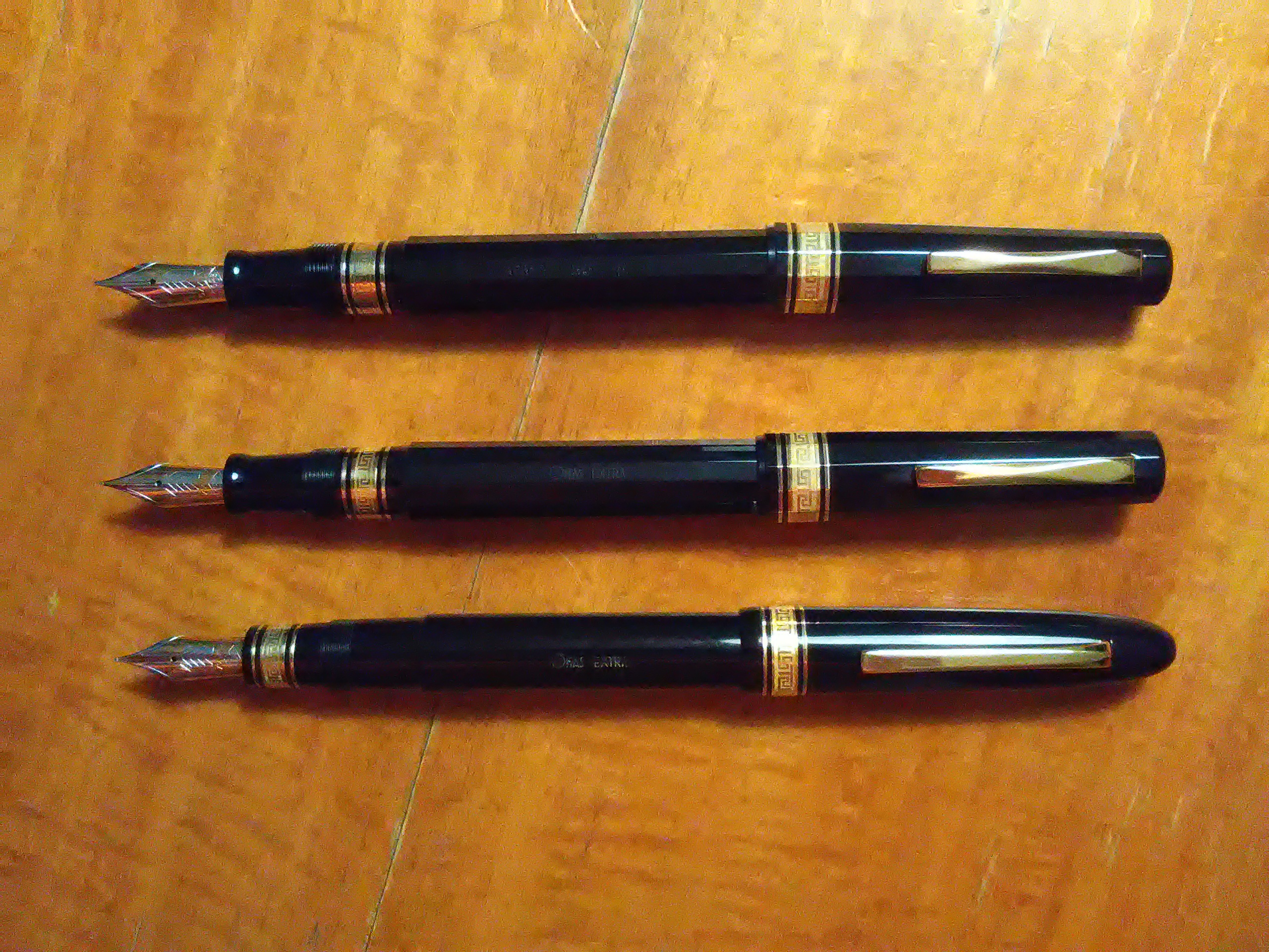 Al centro l'ultima arrivata, la 557 extra, sopra e sotto le sorelline 557 F e Extra Ogiva, tutte con pennino F. La prospettiva inganna l'Ogiva è la più grande.