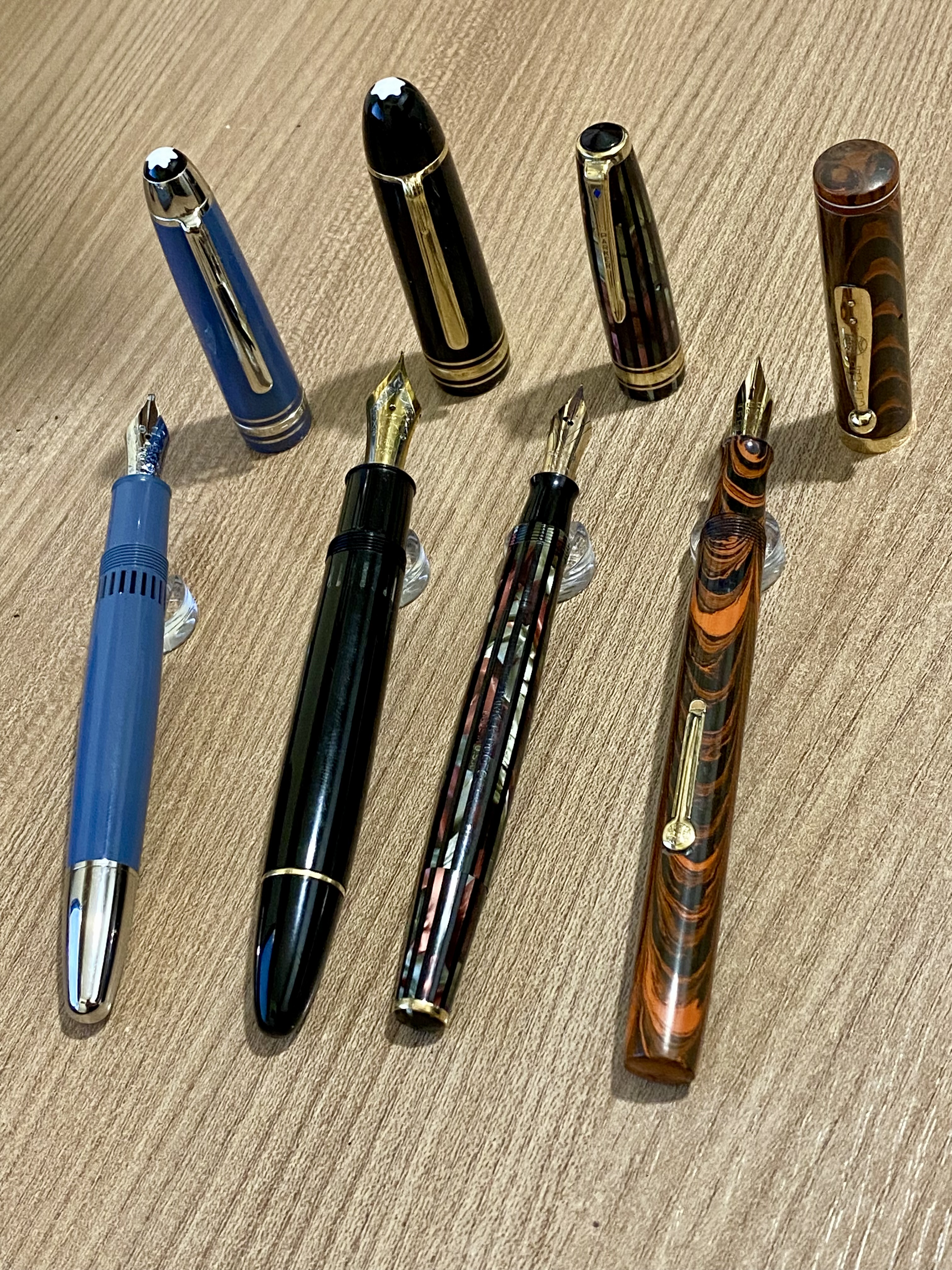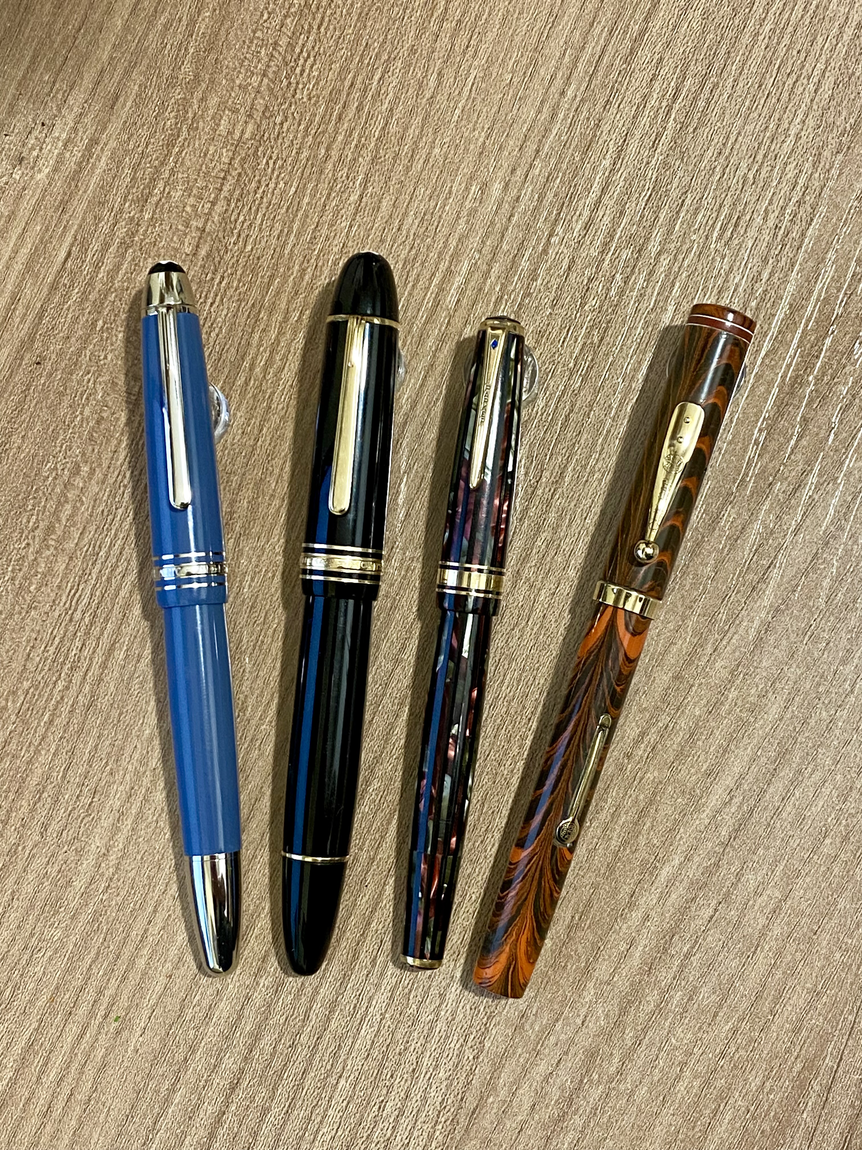 Da sx: Montblanc LeGrand Glacier, Montblanc 149 prima versione in resina con pistone friction fit, Parker Duofold con sistema Vacumatic nota anche come Duovac, Waterman 7 Red band.La Parker e la Waterman sono spettacolari!