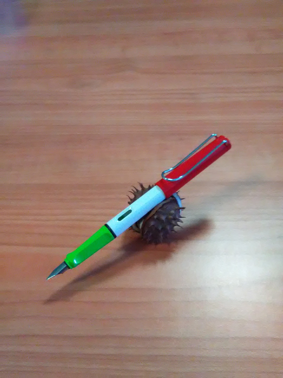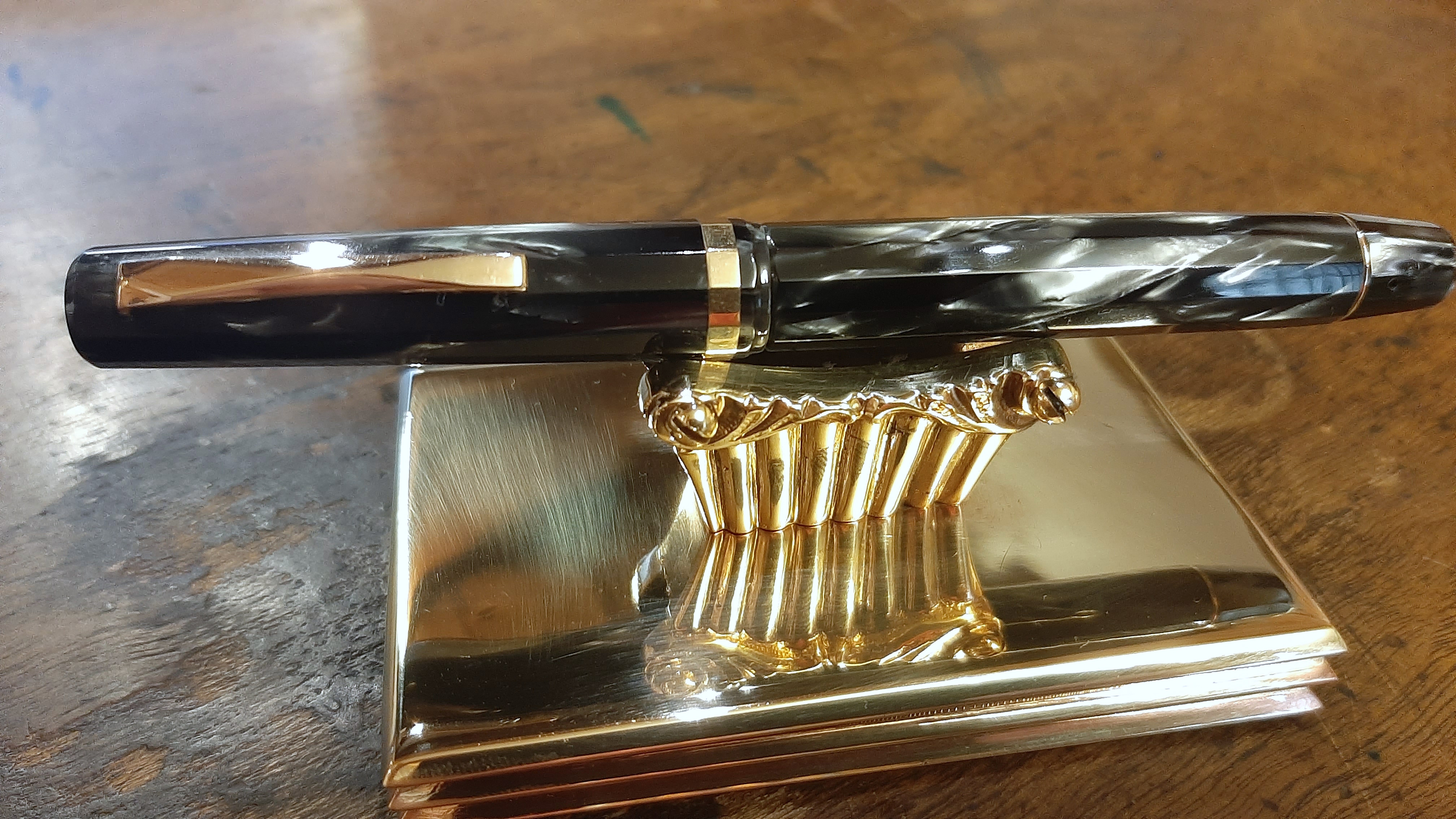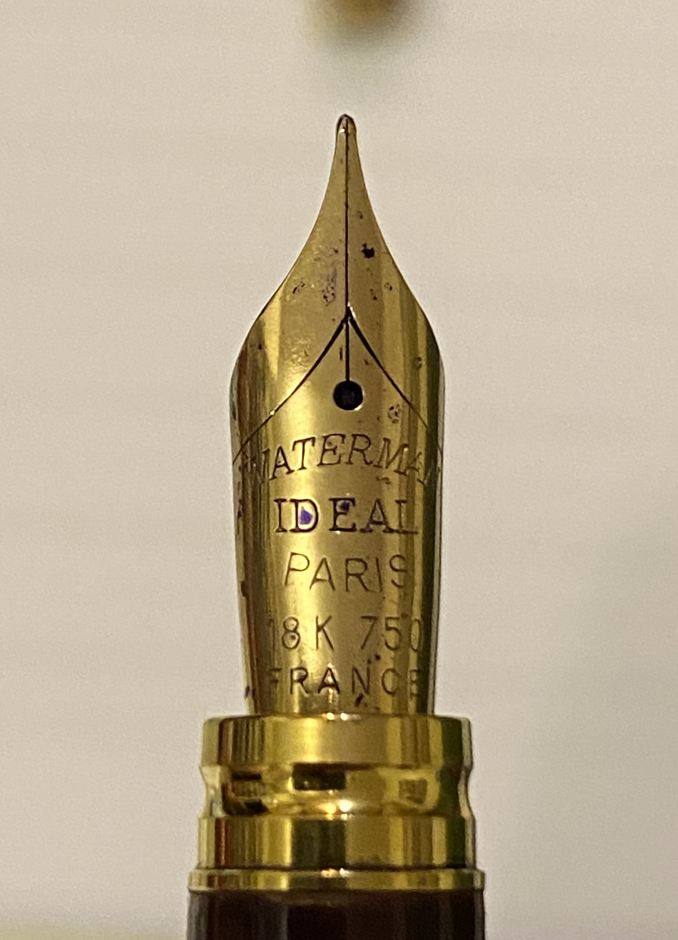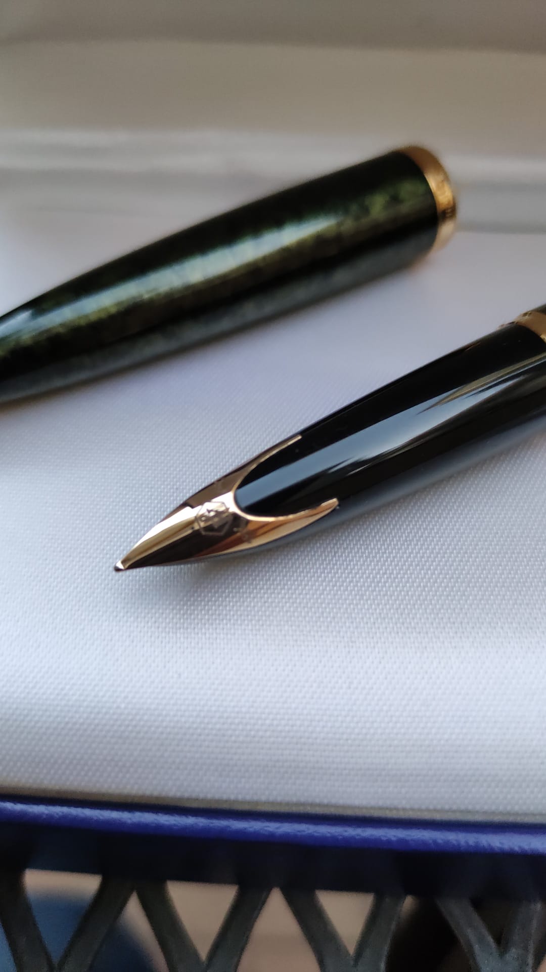 Ha un bellissimo pennino a 18 Kt che ho dovuto un pochino allargare con la pellicola fotografica e poi dare una pulita profonda all'alimentatore. Ora per quanto mi pare scrive bene!