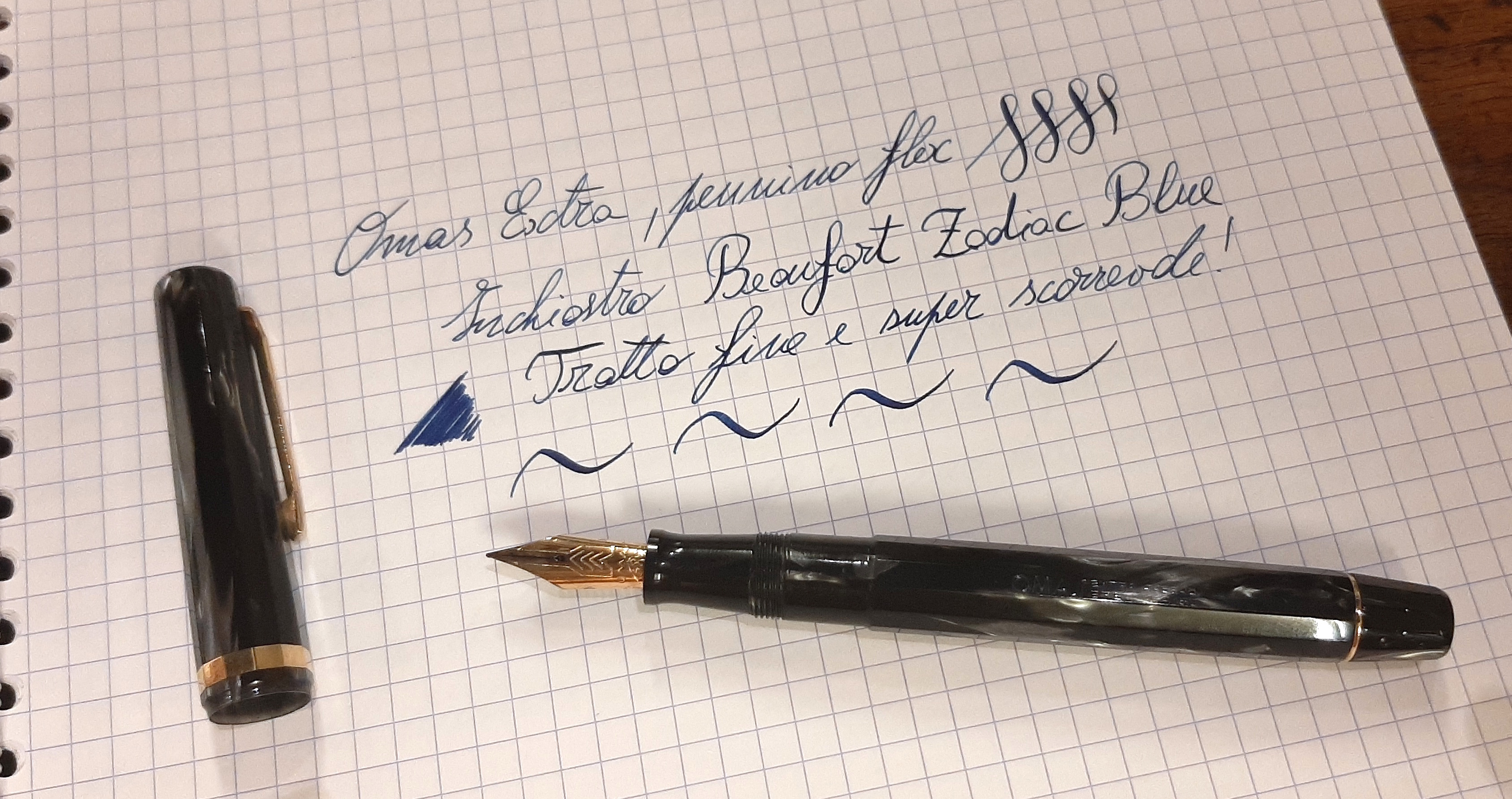Uso spesso il Beaufort Zodiac Blue, inchiostro poco conosciuto che mi piace molto, ha una tonalità che si discosta dai blu comuni e lo trovo molto affidabile e sicuro anche per penne vintage con finestrelle in celluloide.