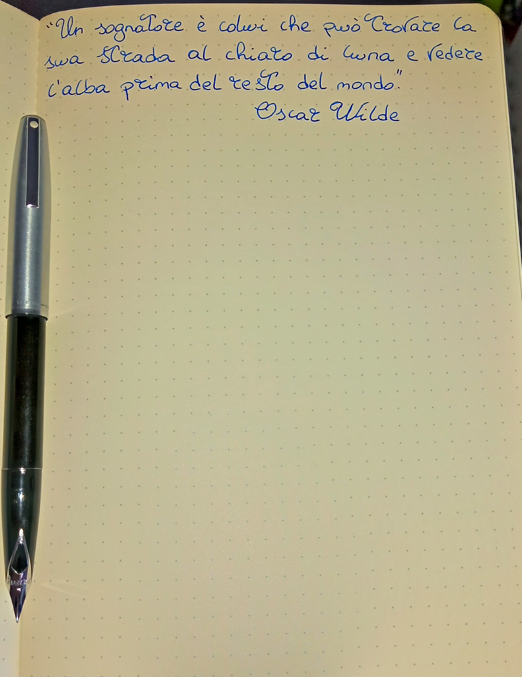 Confesso che non ho saputo resistere, lavata ed asciugata in fretta, mi sono subito cimentata in una serie di prove veloci prima di scrivere sul quadernino Rhodia una frase di Oscar Wilde...