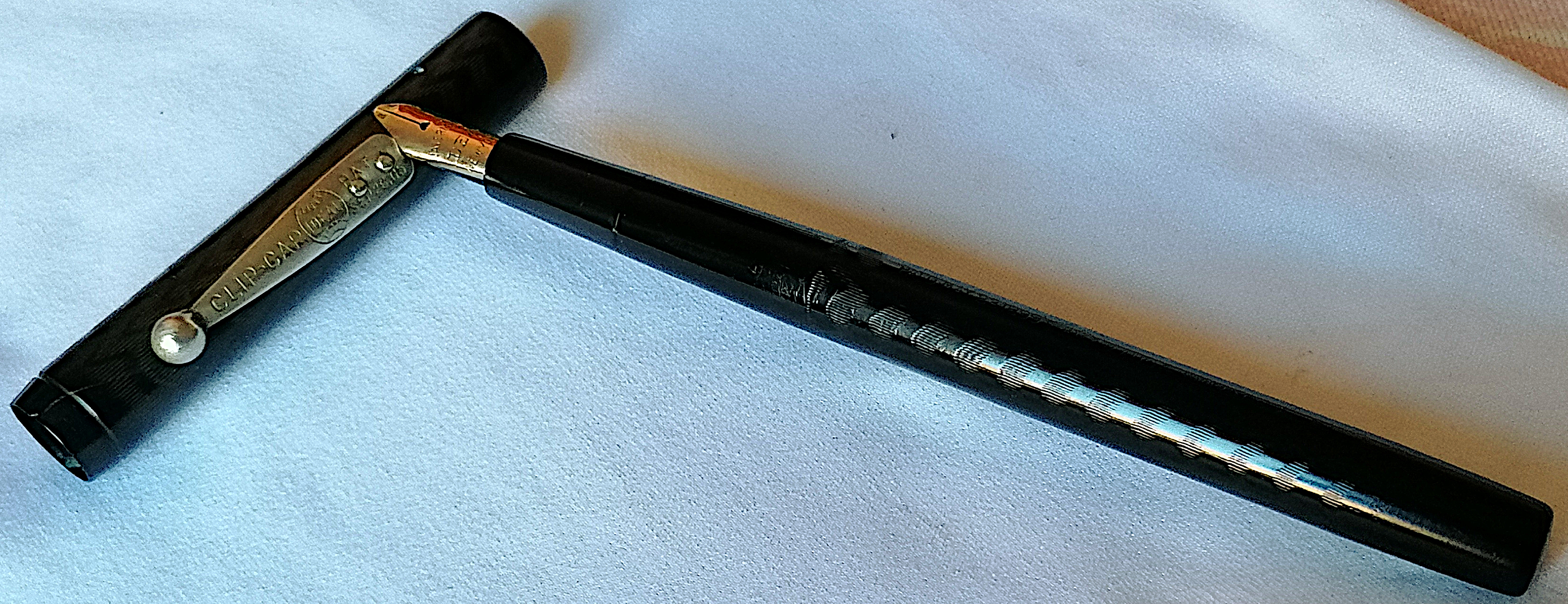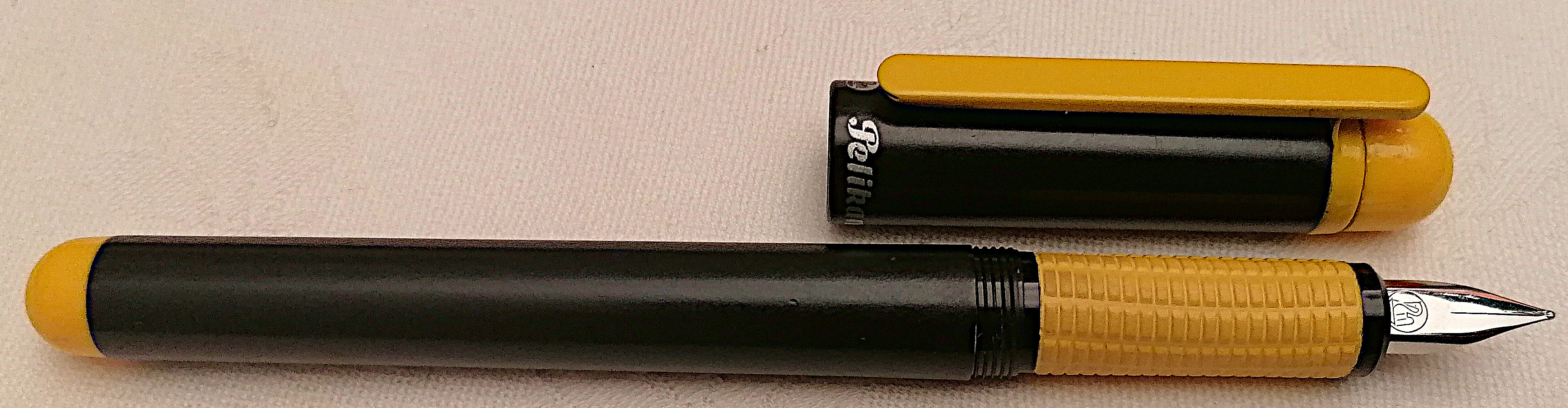 In breve: penna a cartucce, chiusa lunga 13.0 cm, cappuccio ad avvitamento, grip in gomma gialla (sembra una pannocchia di granoturco!), classico pennino Pelikan in acciaio che è spesso presente sulle Pelikano.