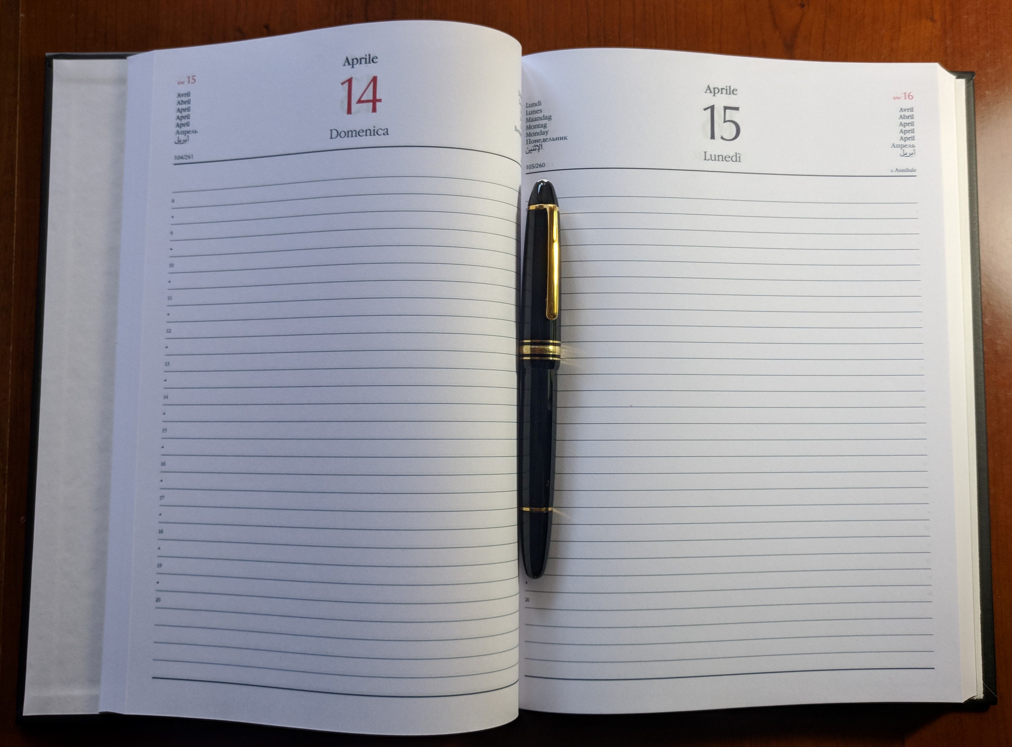 La qualità della carta è buona, ci sono le domeniche a pagina intera ed è di ampio formato misurando 24,5 x 18 cm. Preferendo ed utilizzando i pennini EF, non ho mai avuto problemi di bleed-through ma anche con il pennino F della Lamy Safari (che come sappiamo di Fine ha ben poco