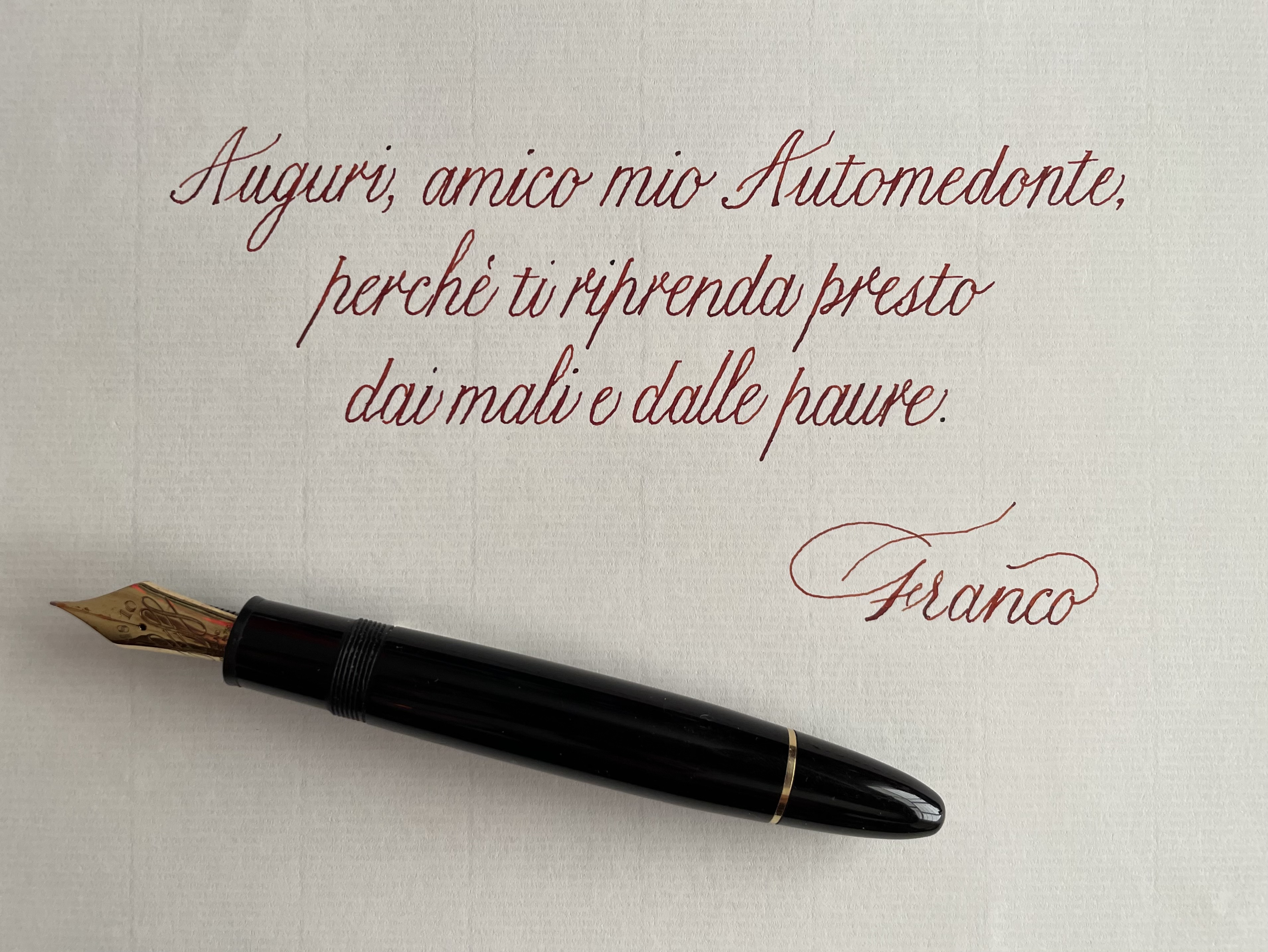 Ieri quando finalmente mi hanno dimesso l’ho trovata a casa che mi aspettava ed è stato un piacere caricarla d’inchiostro e scrivere qualche cosa con la nuova penna mi ha molto aiutato per il morale
