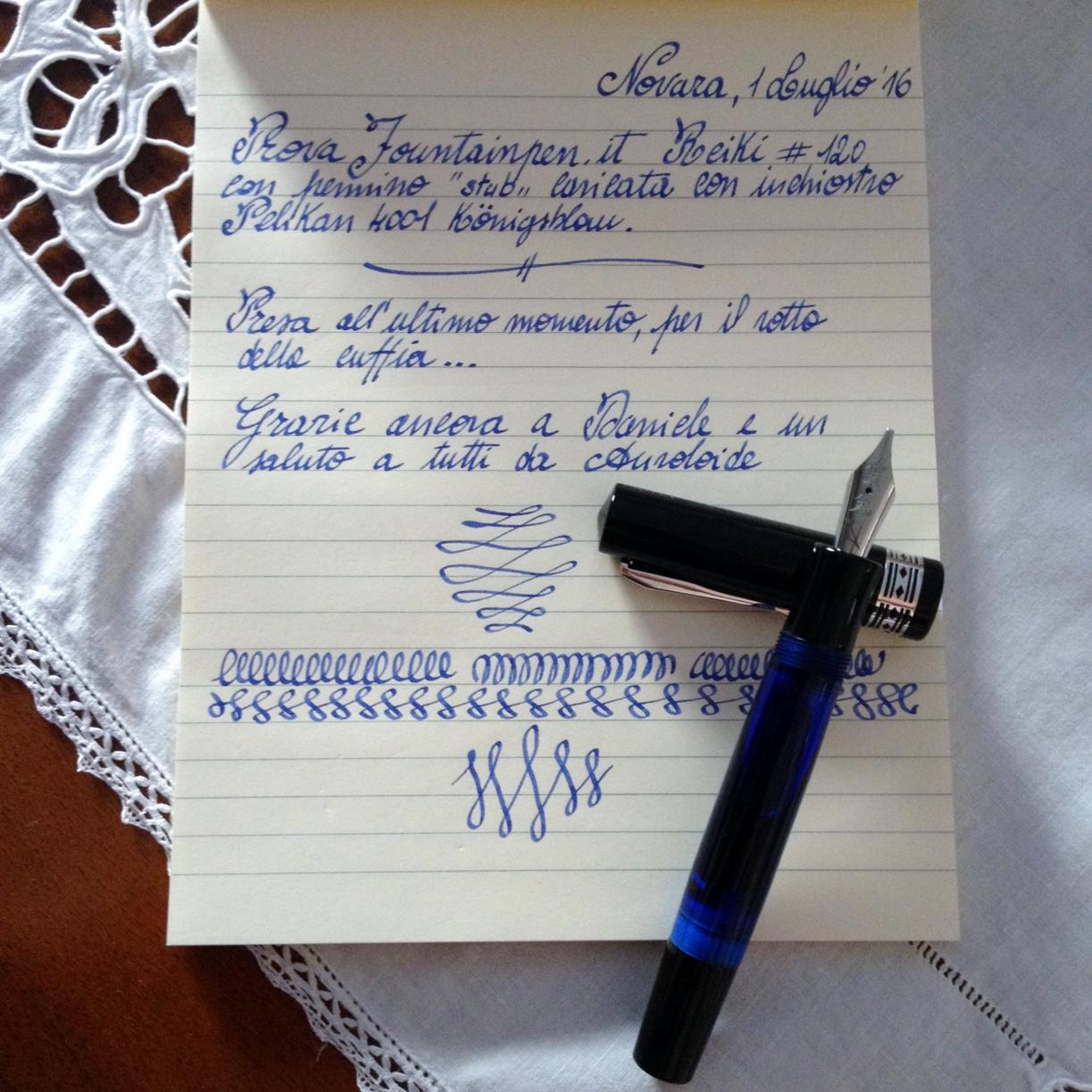 . L'ho caricata velocemente con Pelikan 4001 Königsblau e testata "sulla carta del formaggio" senza problemi, successivamente ho buttato giù due righe per il forum su Rhodia, il mio pennino stub è come me lo aspettavo : morbido e senza incertezze, sono sicuro che dopo un pò di assestamento saprà darmi grandi soddisfazioni come tutti i Bock.