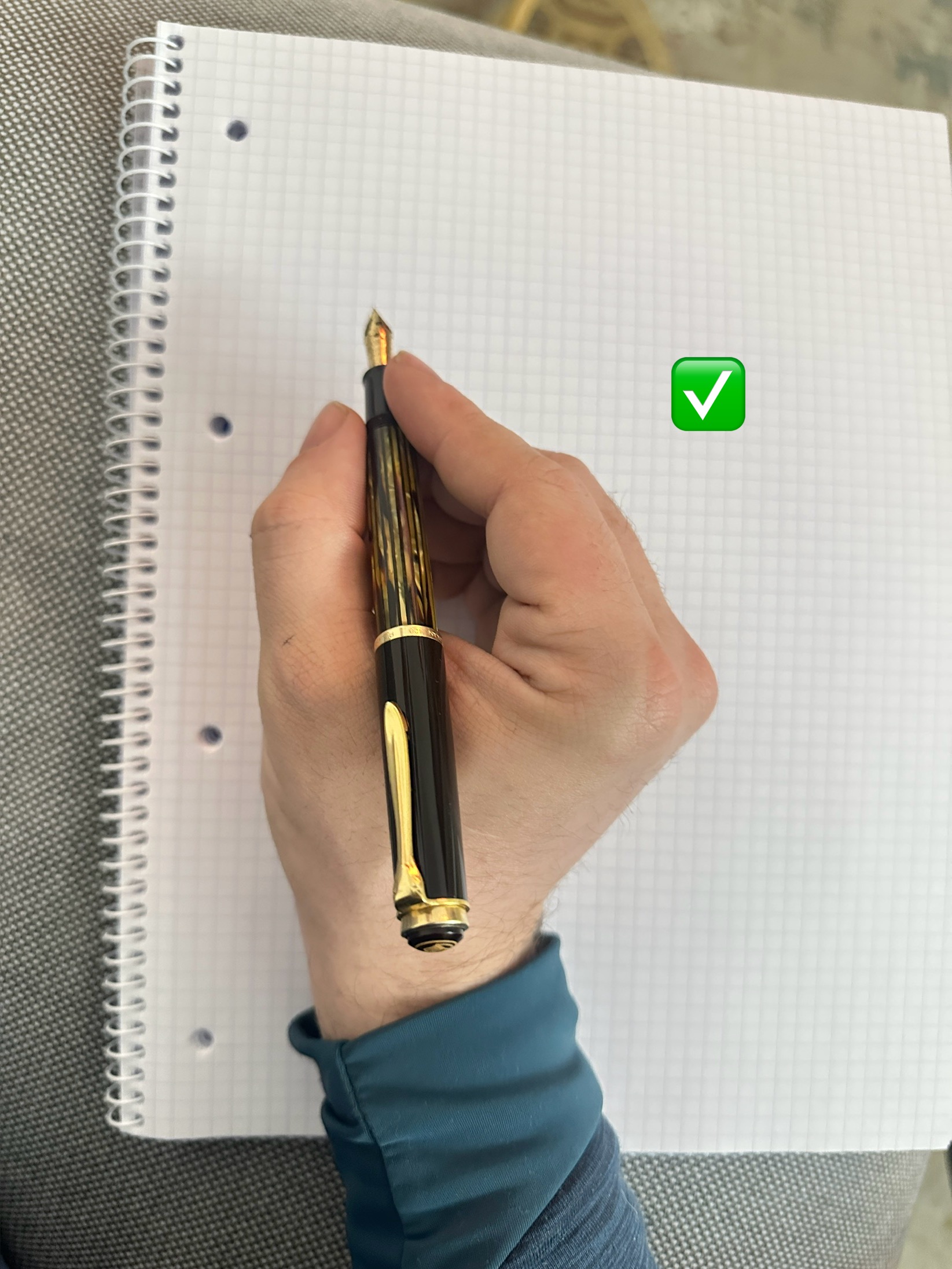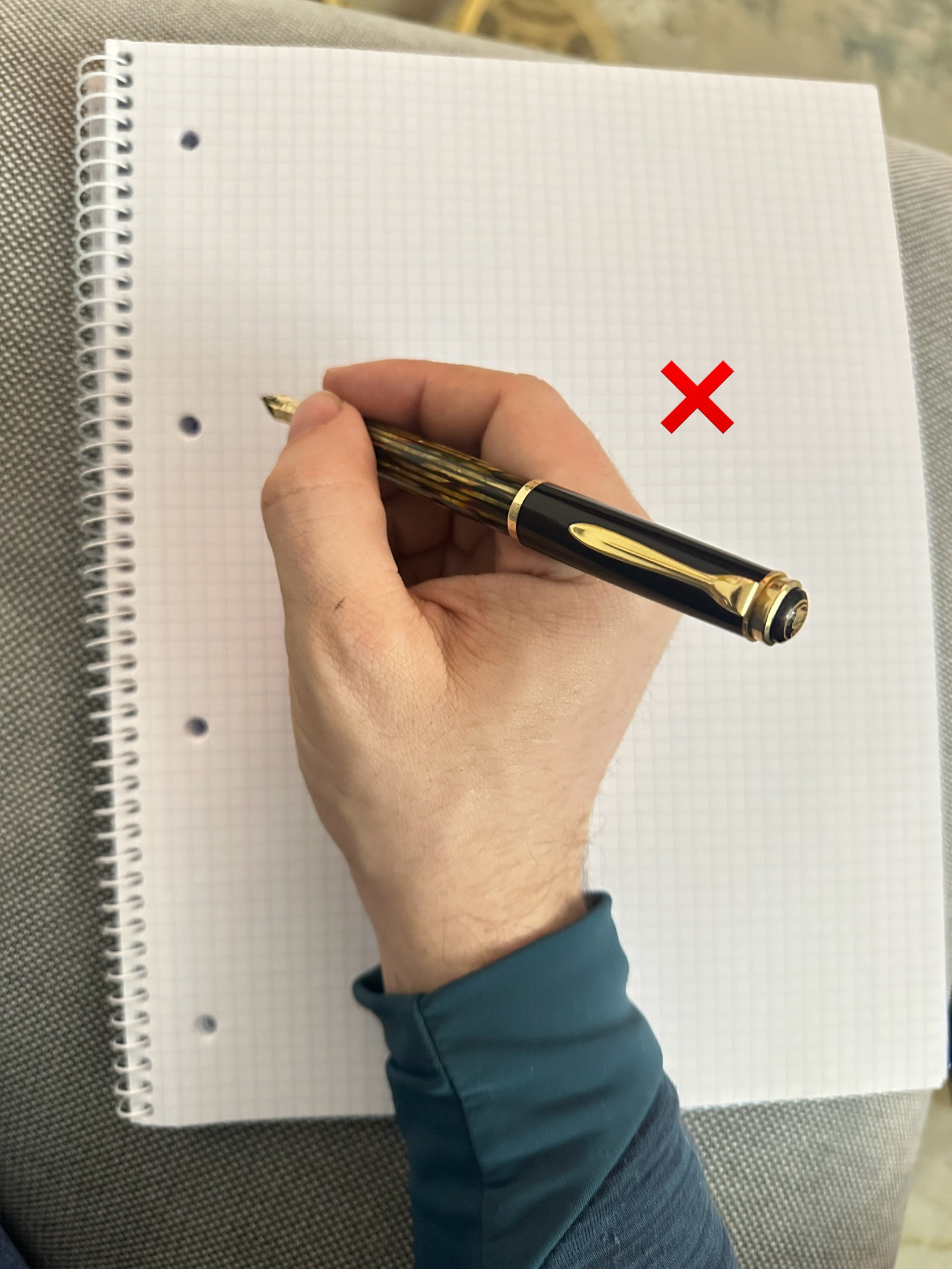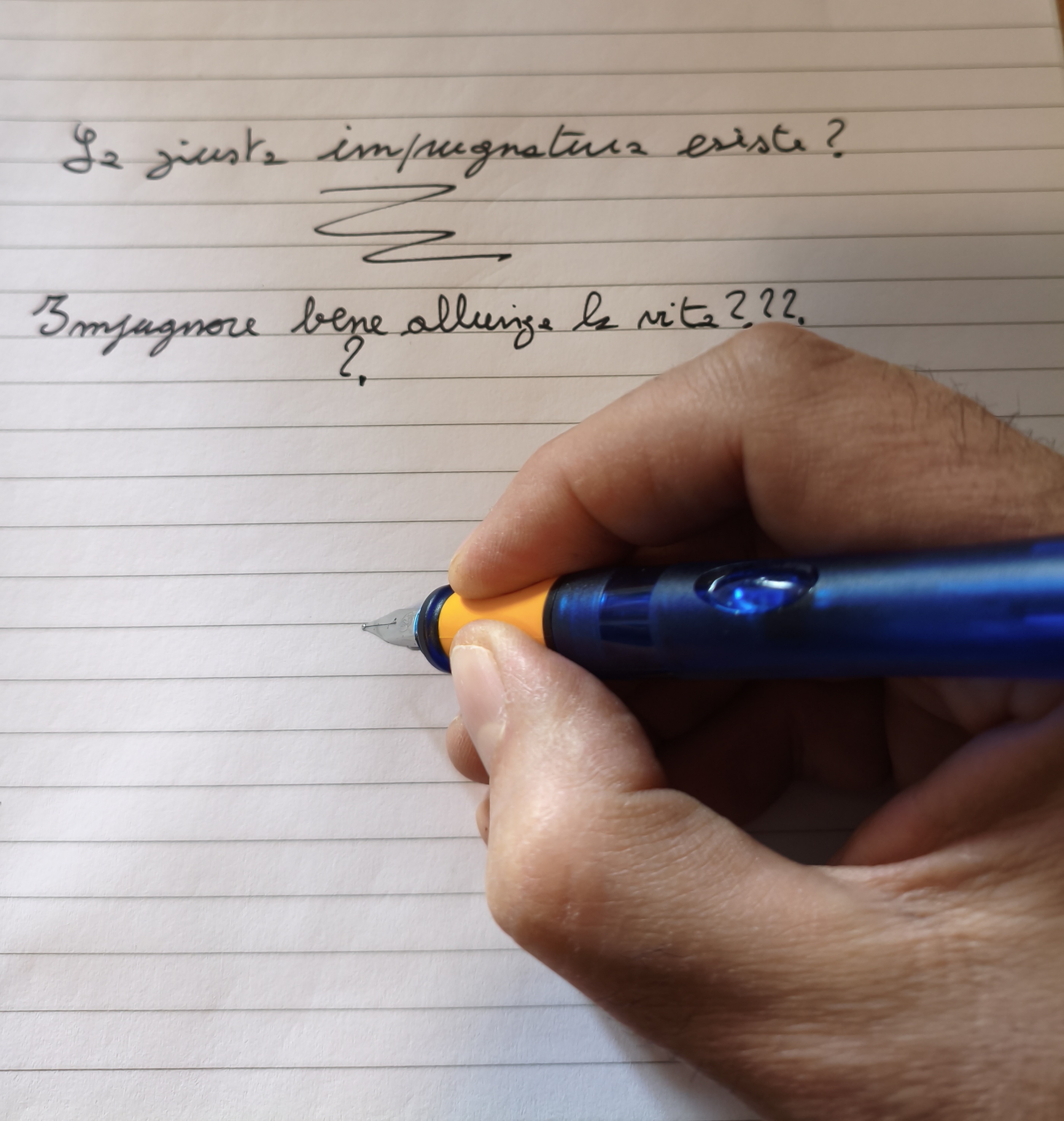 Quella corretta per antonomasia è quella a triangolo equilatero, quindi con pollice e medio contrapposti, indice appoggiato sopra in posizione arretrata. Offre massimo controllo su pennino e pressione, ma in un primo momento può risultare meno spontanea.