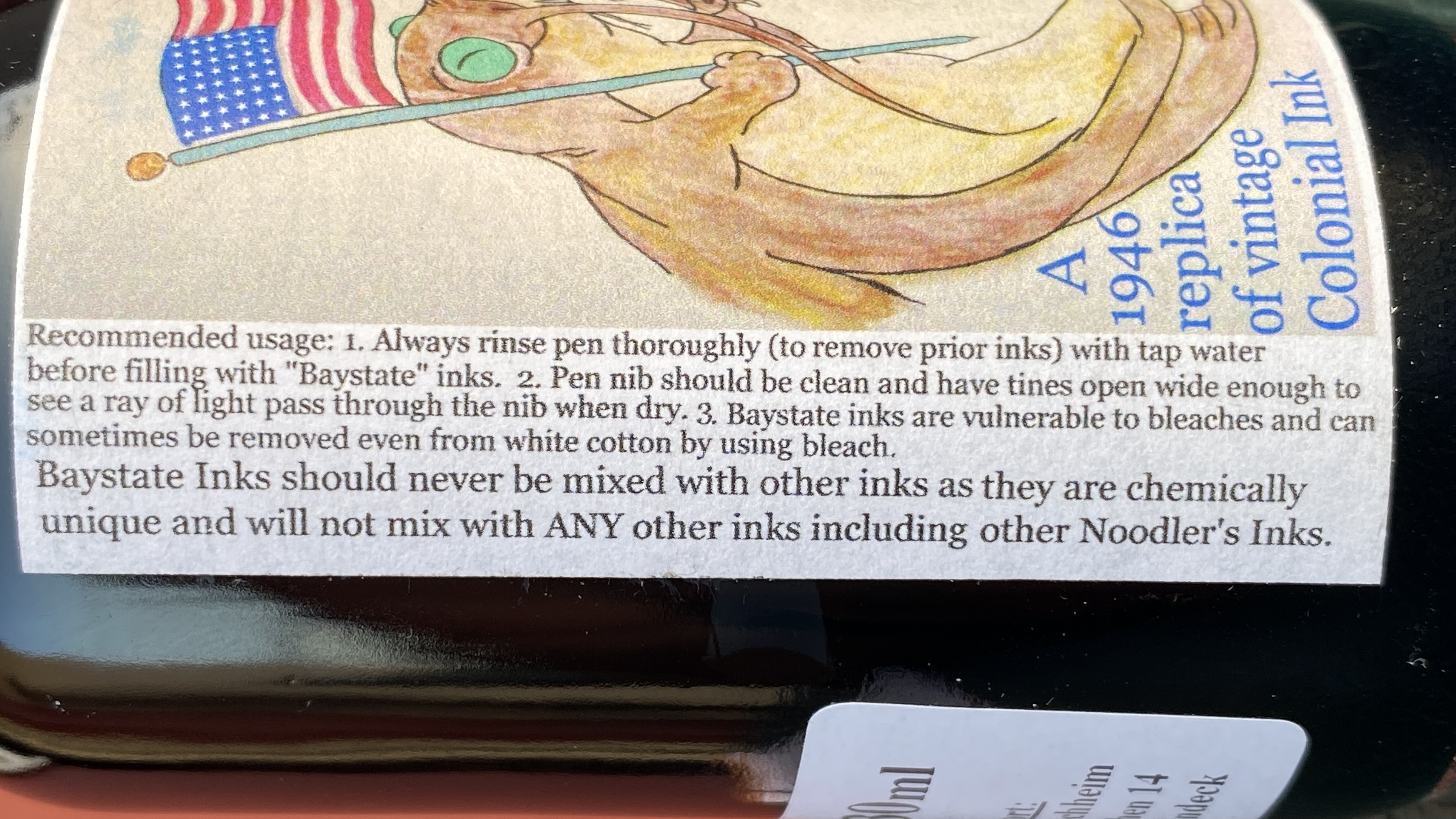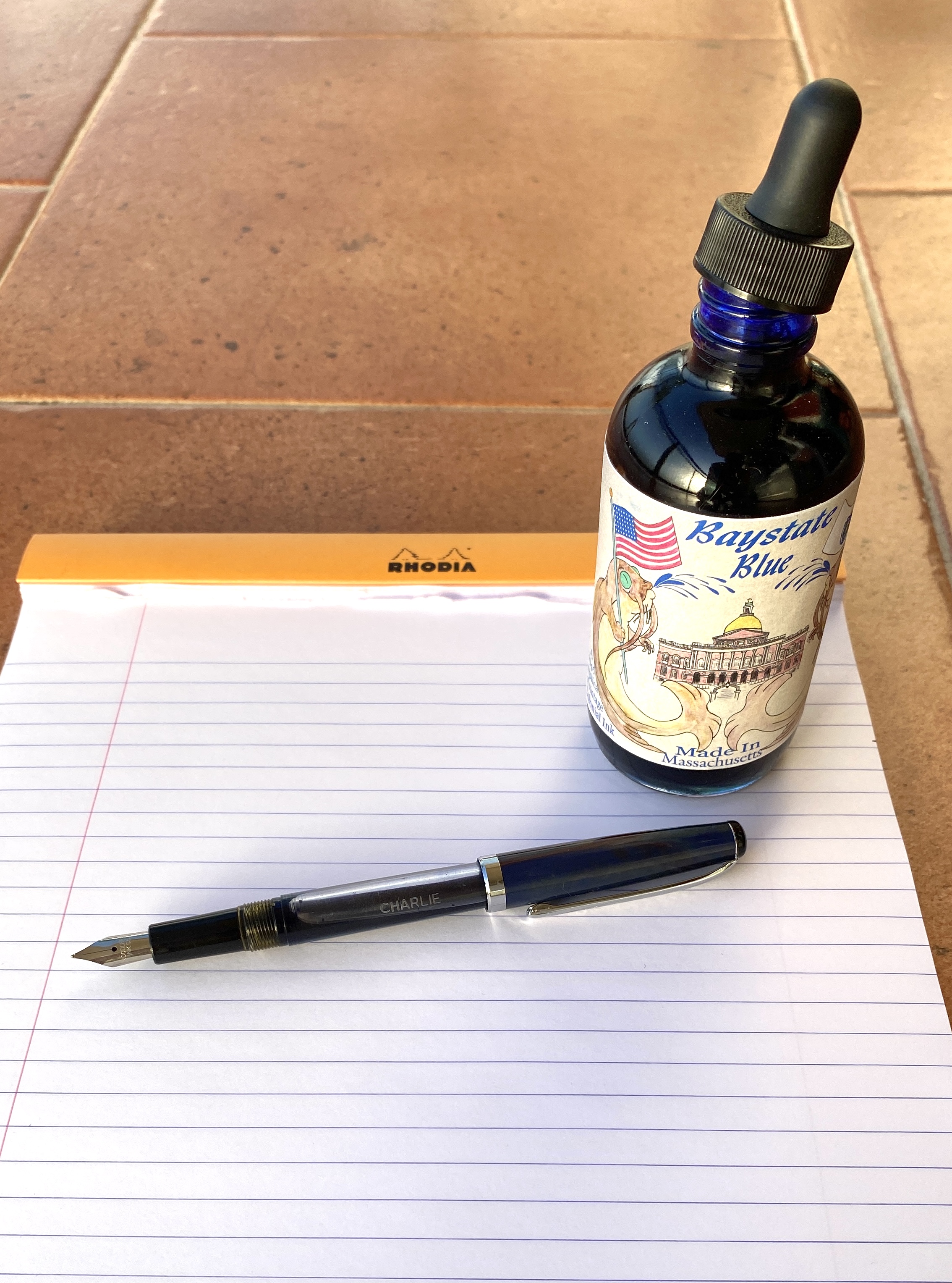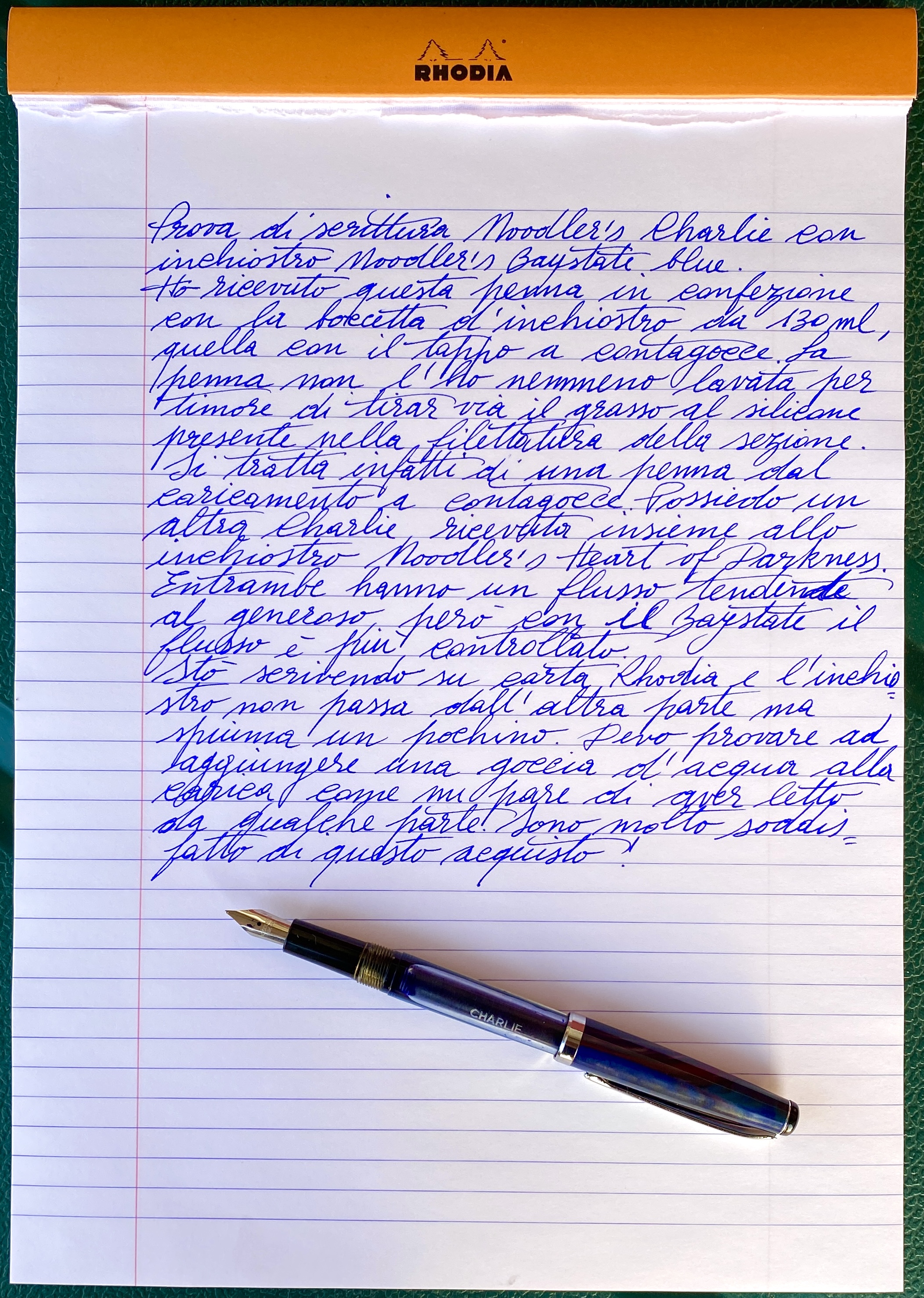 Arrivato oggi il famoso… (o famigerato? ) Noodler’s Baystate blue. Ho comprato la bottiglia da 130ml, quella con il tappo a pipetta contagocce. La confezione conteneva anche la piccola Charlie, la stilo eyedropper minimalista di casa Noodler’s. Lo userò con la penna in dotazione, mi pare infatti si sposino alla perfezione. Di Charlie ne ho due ed entrambe hanno flusso abbastanza generoso ma con il Baystate risulta più controllato rispetto a quanto non lo sia con l’ Heart of darkness.