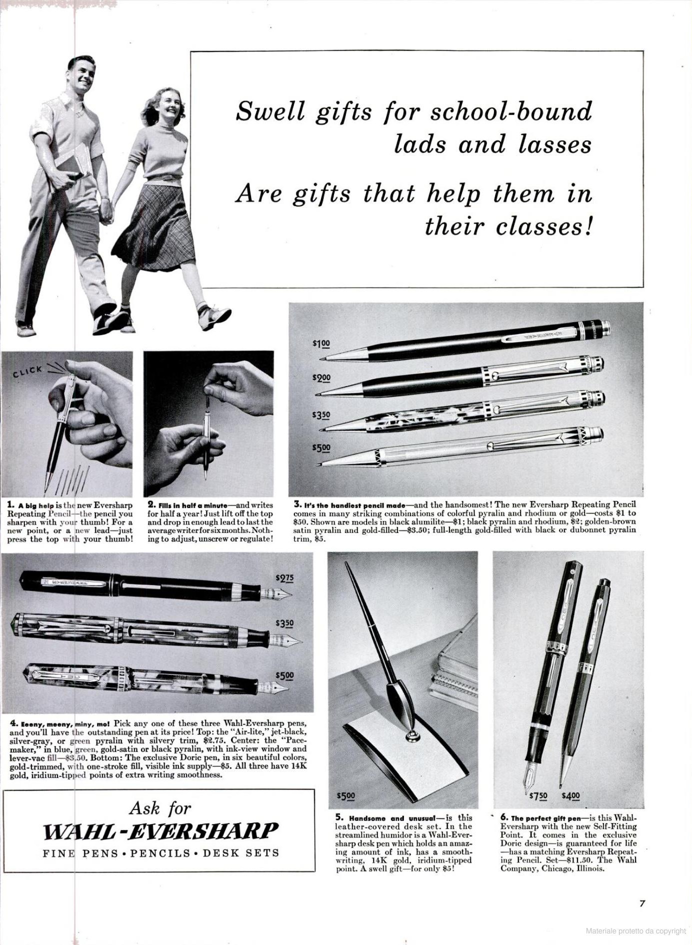 La seconda (18 settembre) si ispira invece all'inizio dell'anno scolastico e al ritorno tra i banchi, occasione in cui il miglior "regalo di benvenuto" sono certo una matita ed una penna Wahl-Eversharp. Anche qui, tra le altre, compaiono due Doric. In questo caso, mi sembra si tratti di due della prima generazione, ma dotate di caricamento "Lever Vac" (ancora a levetta ma con trasparenza per vedere l'inchiostro).
