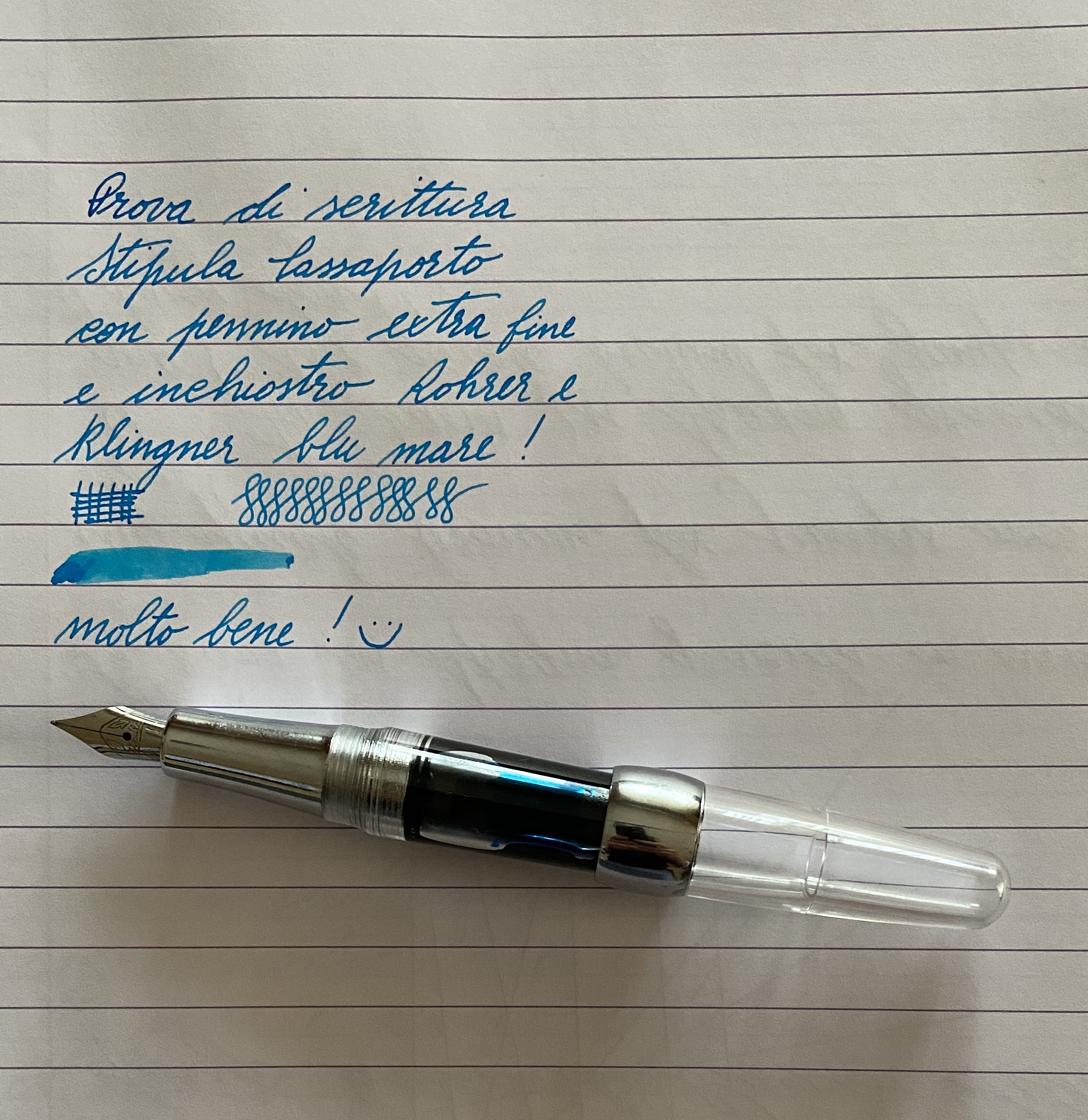 Ciao, ho comprato una Stipula Passaporto trasparente, per portarla in giro senza troppi patemi, si tratta infatti di una penna economica. L’ho presa con pennino extra fine per scrivere in taccuini A6 e il tratto è effettivamente abbastanza sottile. Ha cominciato a scrivere bene fin da subito con un flusso abbastanza bagnato. Le filettature sono precise fortunatamente. Ho letto di qualcuno che lamentava filettature difettose. Ve la mostro all’opera, con inchiostro Rohrer e Klingner blu mare. Ne approfitto per chiedere alcune informazioni che non sono riuscito a trovare. Il pennino lo produce Stipula come su altre penne del brand ?