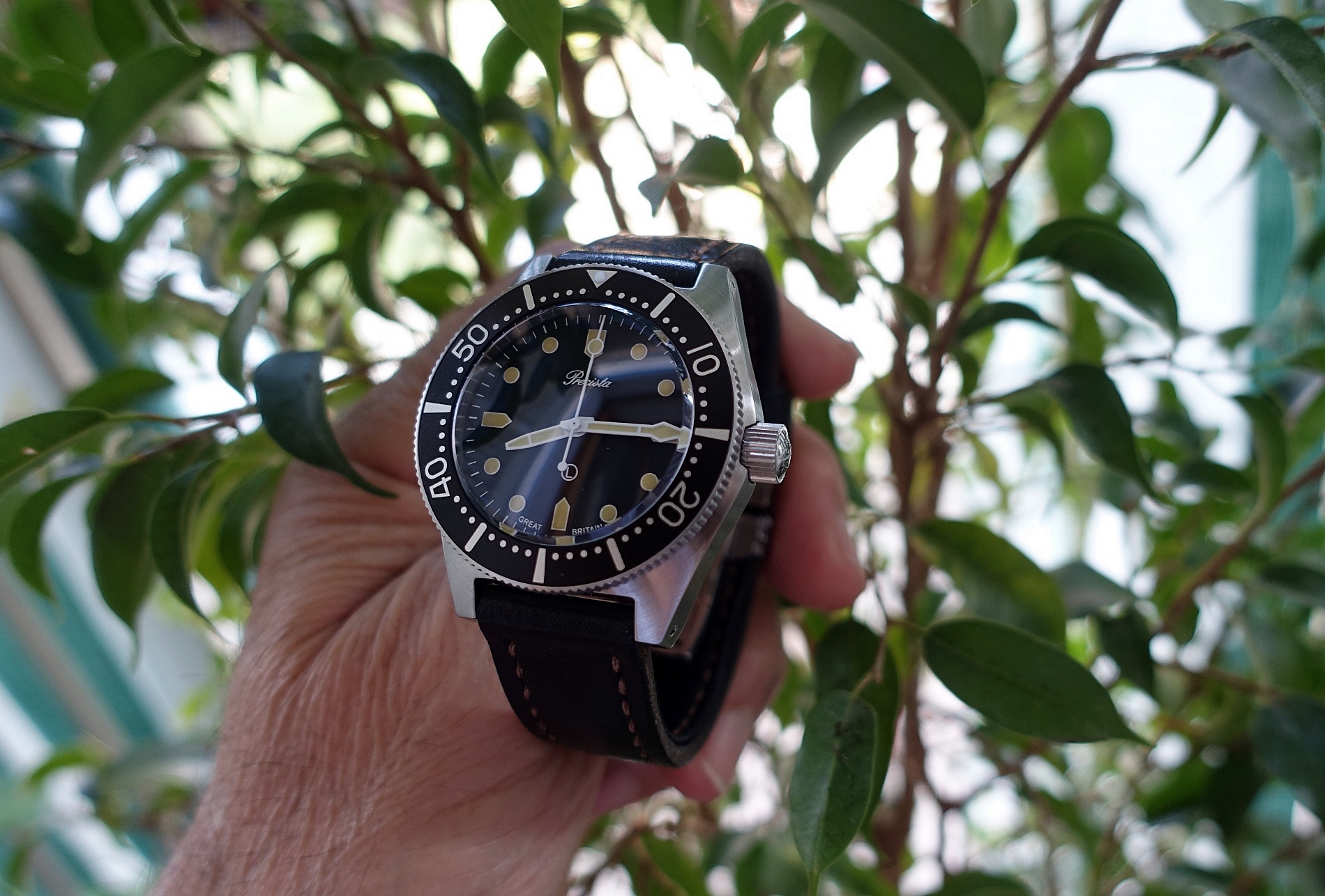 Avia Marino automatic, fondello a scatto ad alta pressione, ghiera con inserto in bakilite, bel quadrante soleil con sfere ed indici al trizio a cui ho abbinato un cinturino nato in tinta.