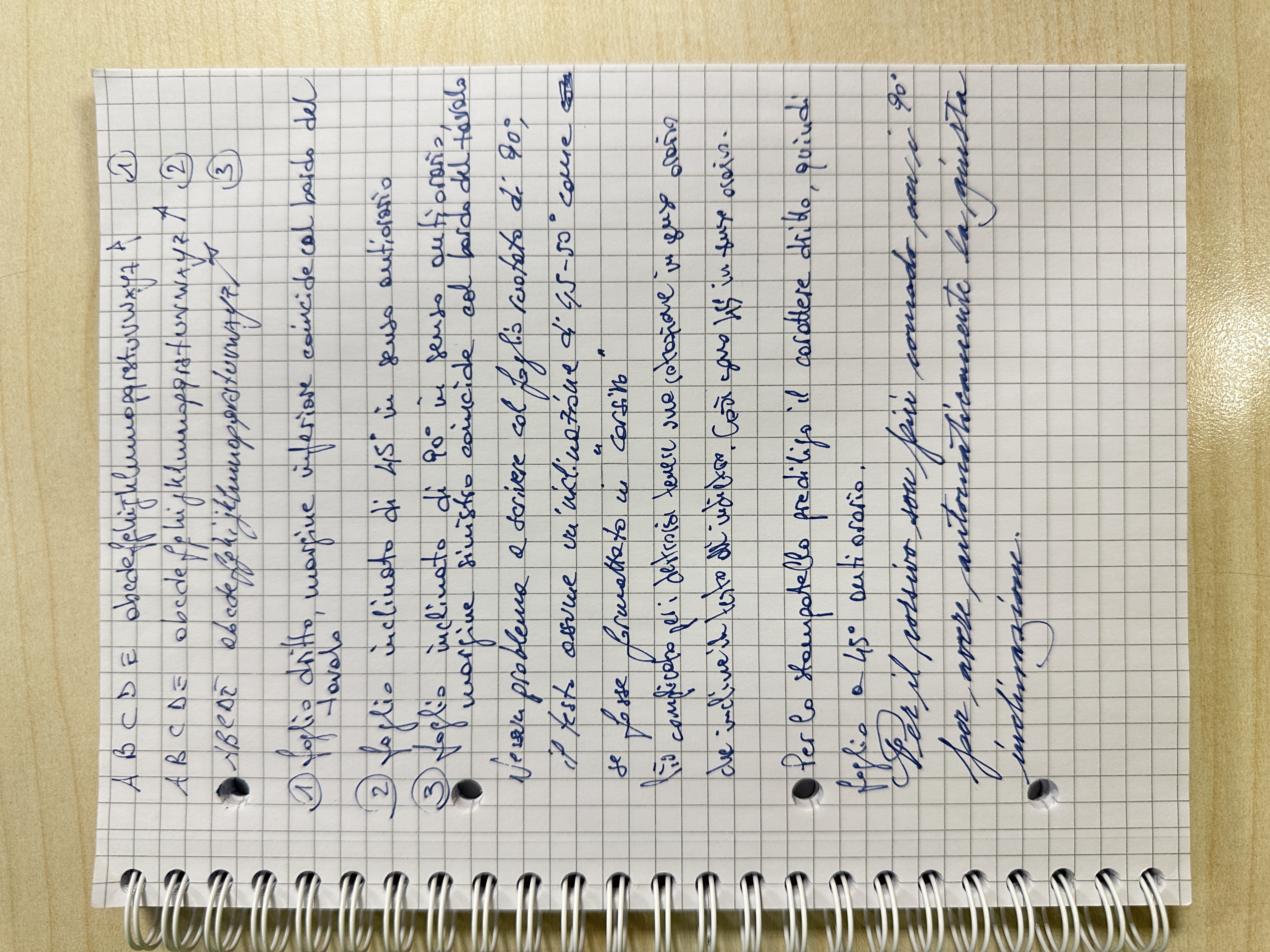 Peraltro non è vero che tenendo la penna così il pennino punti verso sinistra, il pennino può essere ruotato un poco volendo in modo che quando fai il tratto discendente il movimento sia parallelo al tratto. Inoltre puoi puntare perfettamente perpendicolare al foglio, girando il foglio.
