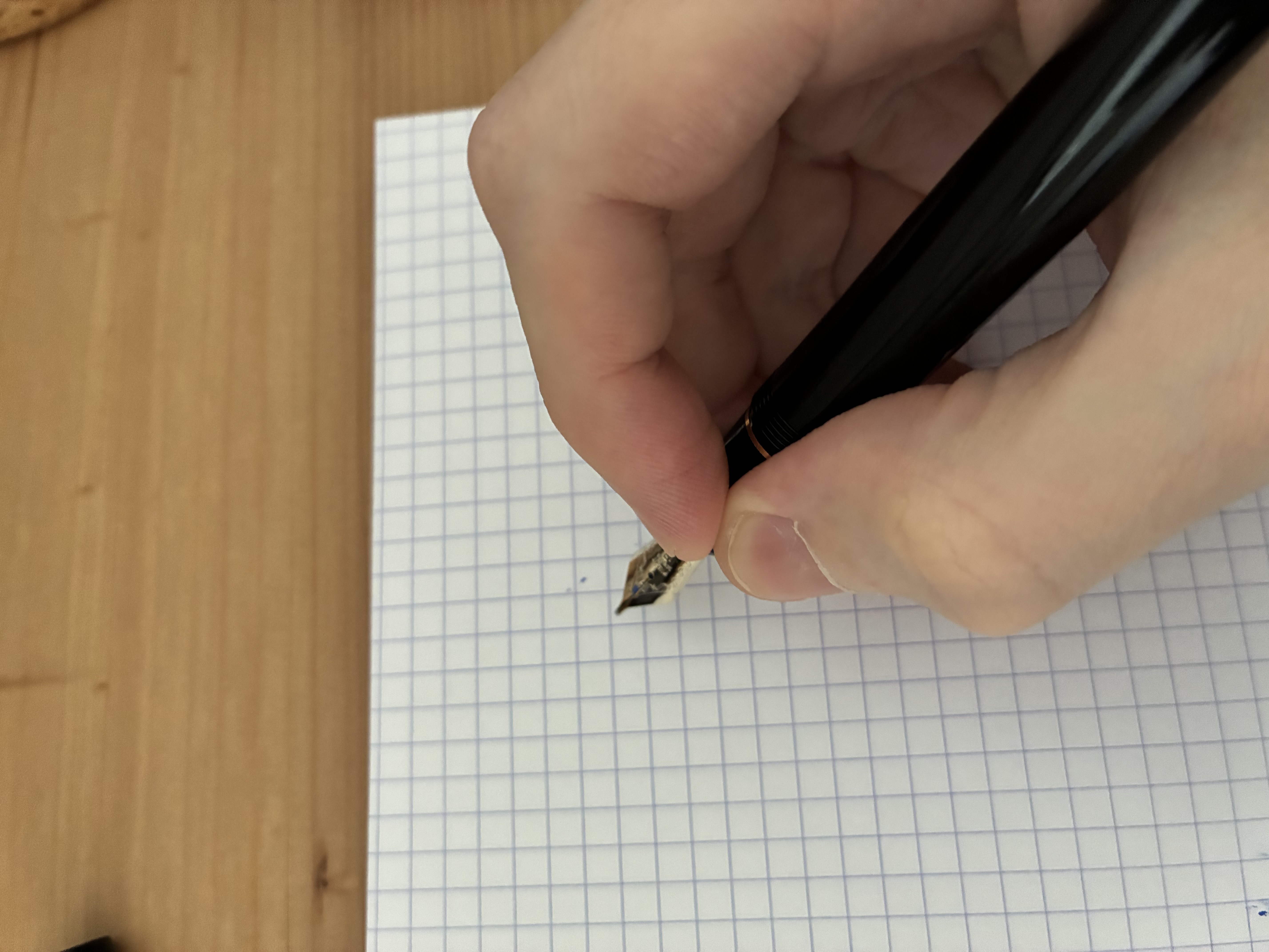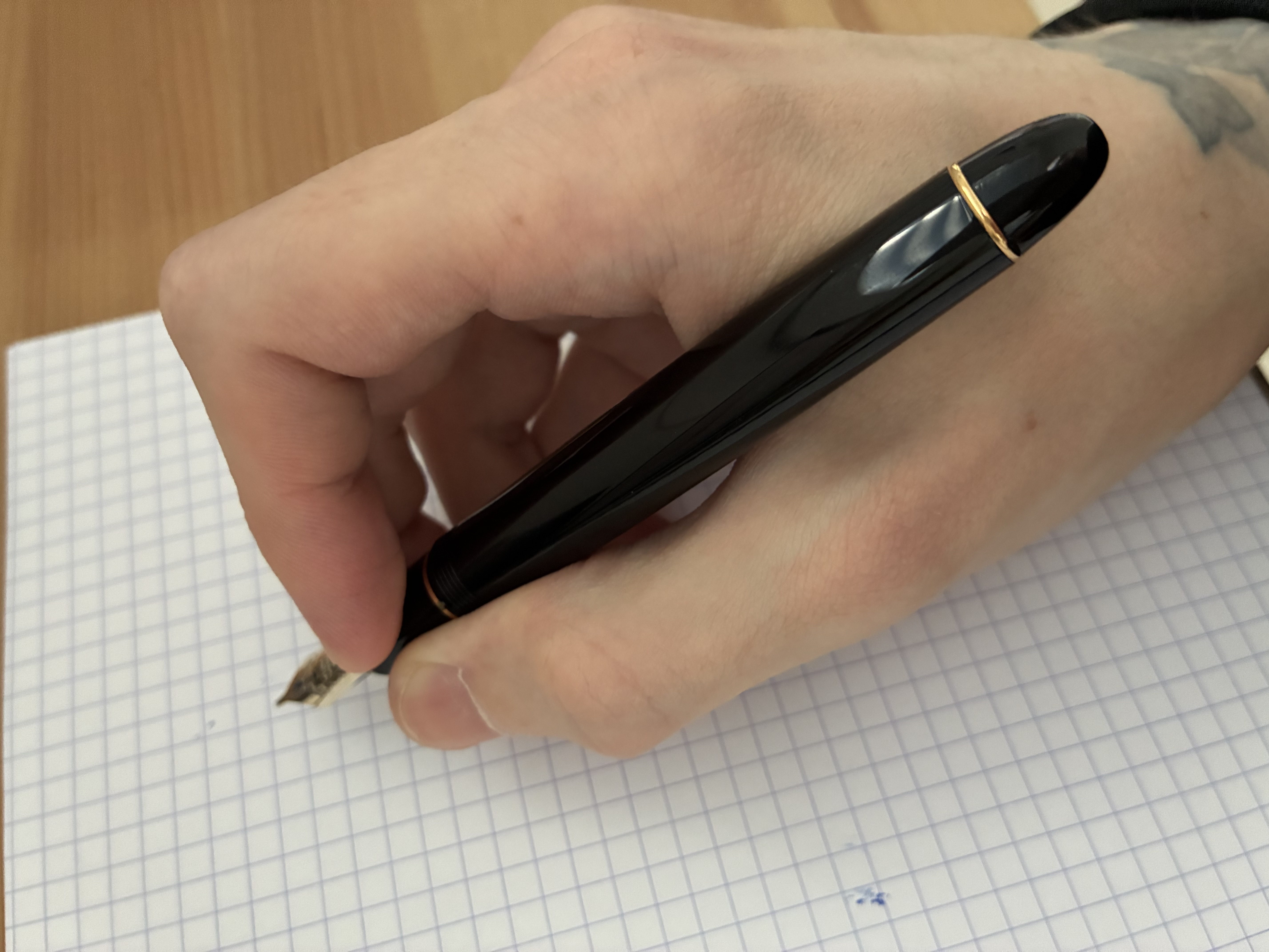 Quello che noto in queste ultime foto è che tutti impugnate in modo che il pennino punti verso sinistra e non dritto davanti. Il fusto della penna dovrebbe appoggiarsi alla base del pollice, non dell’indice, in modo che la fenditura tra i rebbi sia allineata col braccio e i tratti verticali delle lettere (tirando la penna verso di me faccio il tratto discendente e sfrutto automaticamente l’eventuale morbidezza del pennino). Altrimenti la maggior parte dei tratti (quelli verticali) vengono fatti con un movimento laterale del pennino