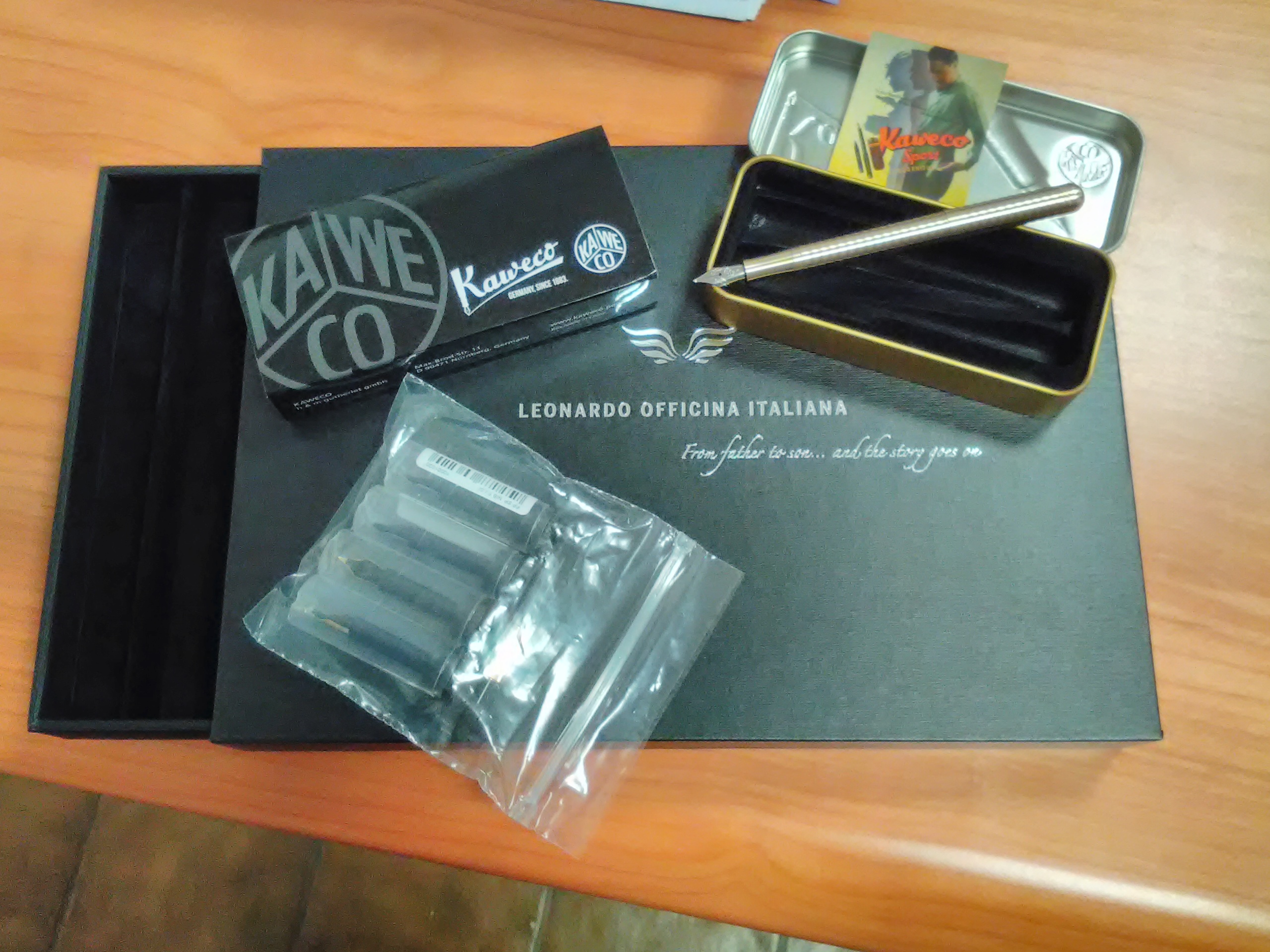 un contenitore Leonardo, una Kaweco Wave M, alcuni pennini di ricambio, sarà che per lavoro sono sempre in mezzo agli idraulici ma l'odore dell'ottone mi piace.