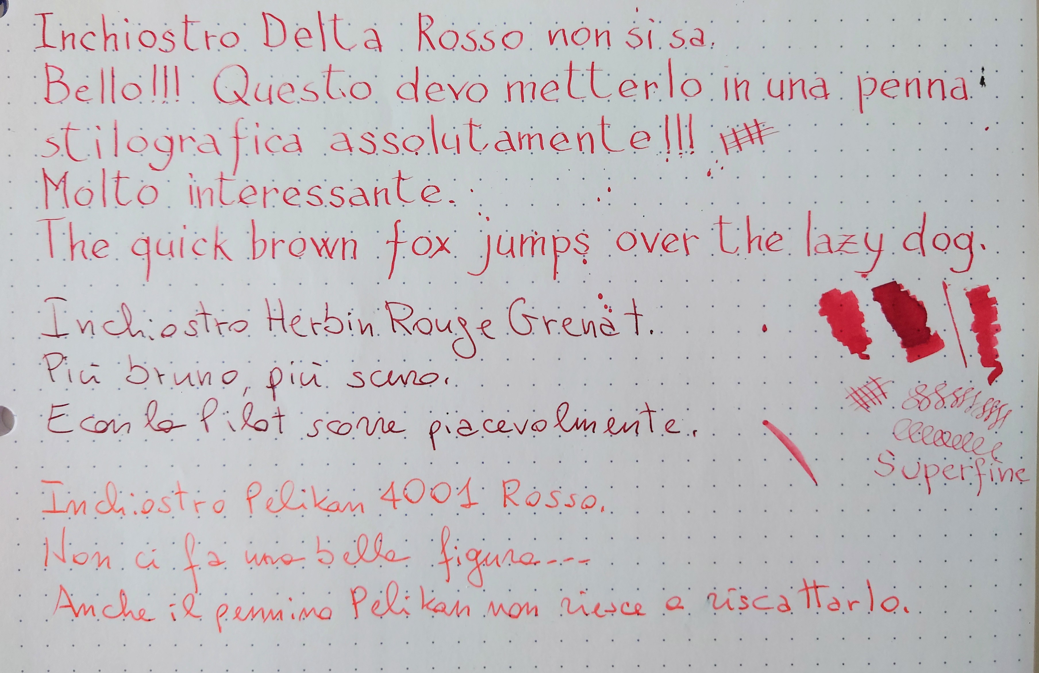 Bello! Per confronto, ho scritto due righe con Herbin Rouge Grenat, che ho nella Pilot Lightive M (Bello pure lui!) e con il Pelikan 4001 Brilliant Red (quasi arancio, poco interessante), che ho in una Pelikan scolastica in metallo dal nome sconosciuto.