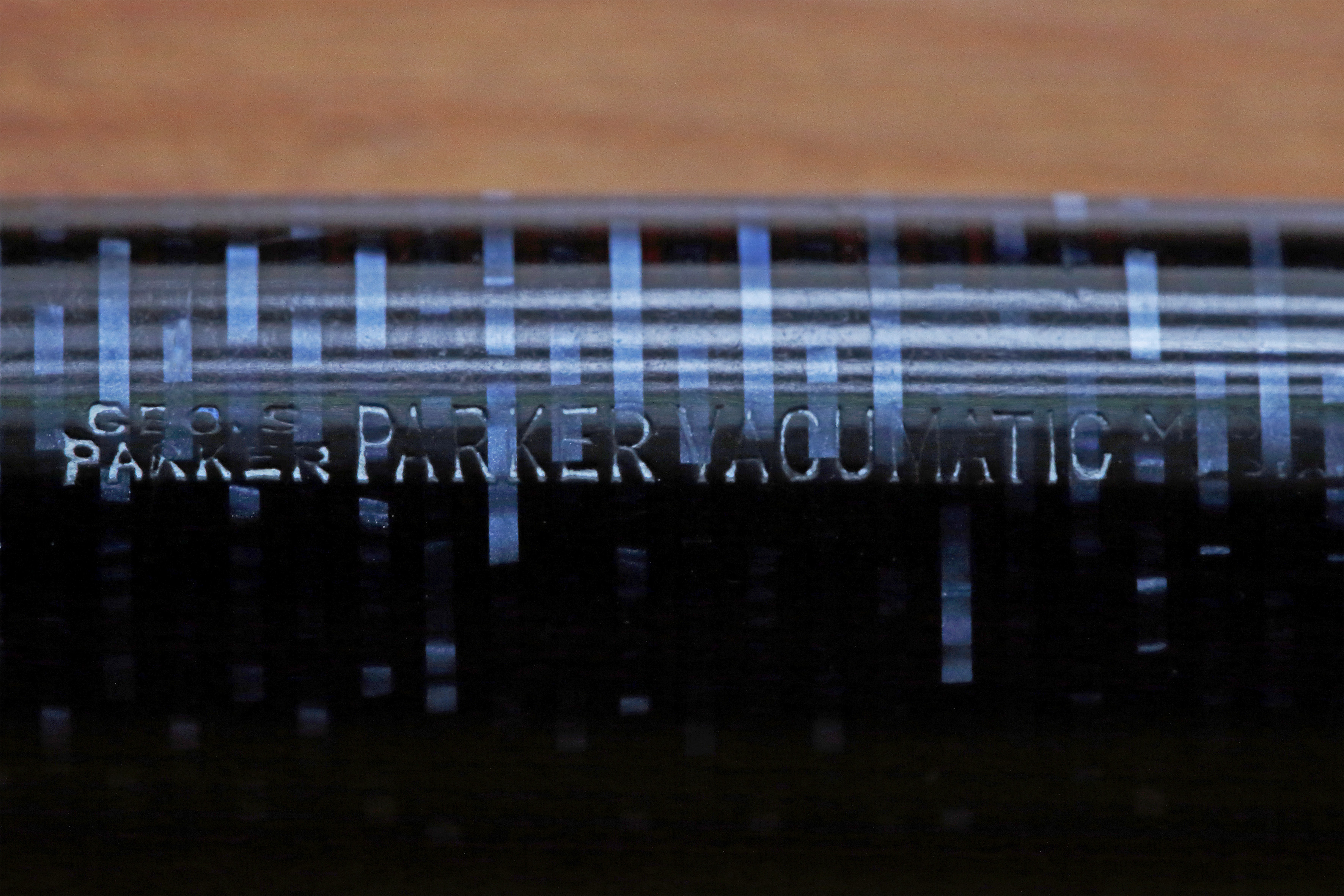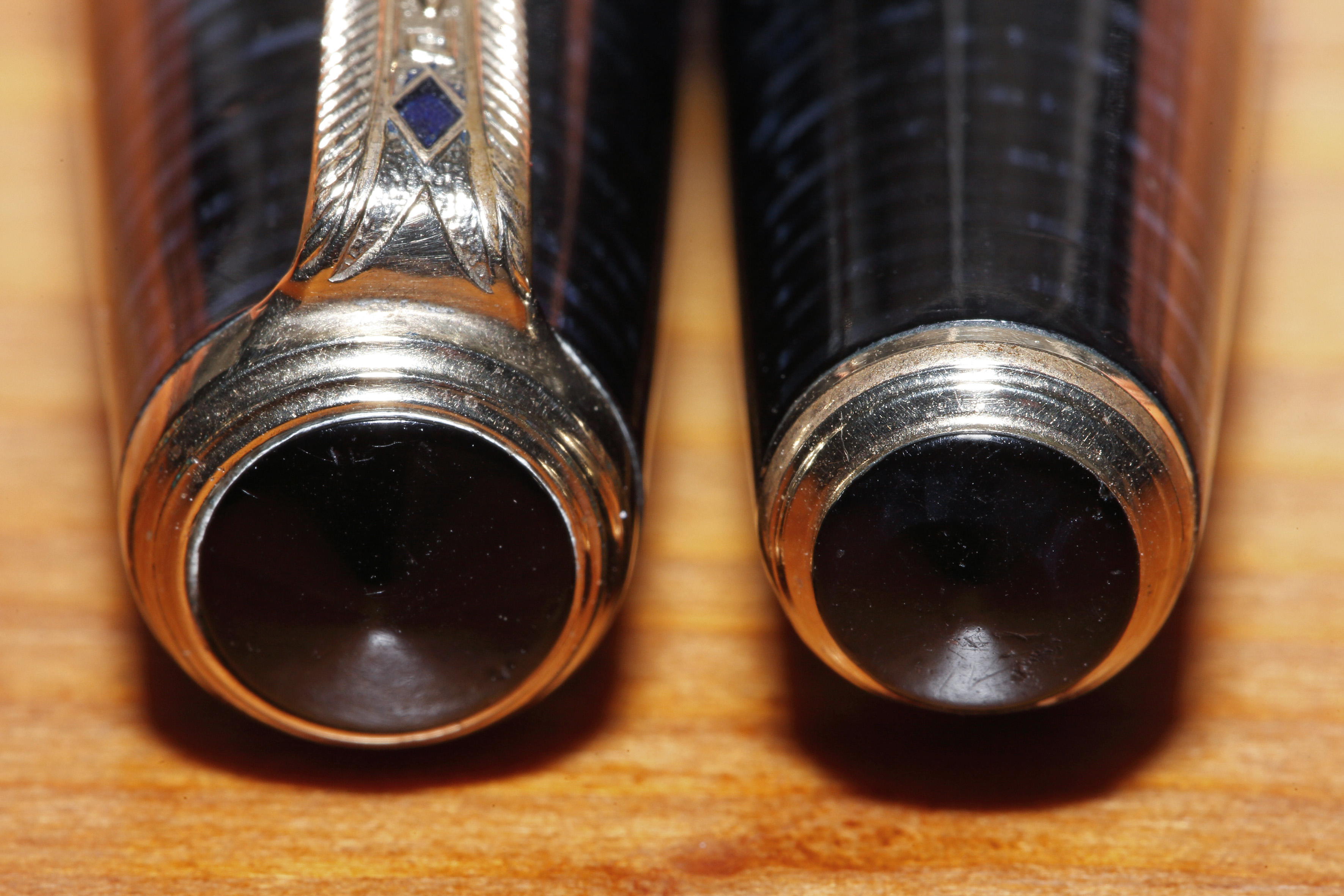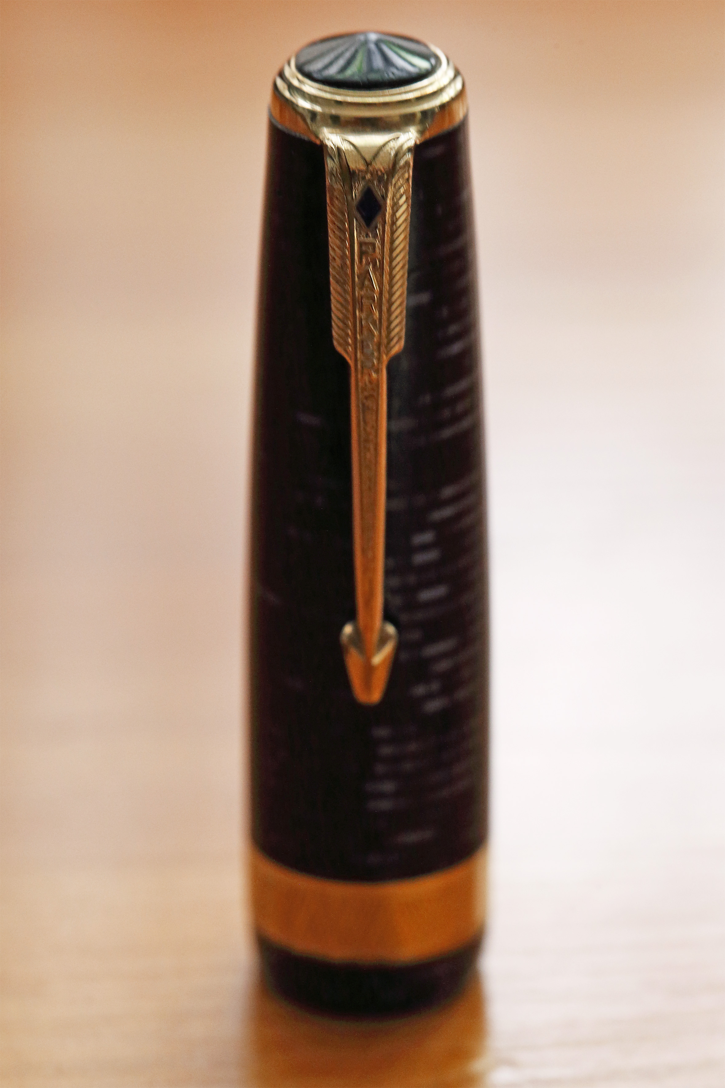 Veniamo alla penna: Parker Vacumatic Maxima del 1941 fabbricata in USA colore azure blue pearl celluloide laminata; II generazione, Blue Diamond, caricamento speedline, 2 gioielli; pennino originale leggermente flex su feed A. Allego alcune foto. Saluti.