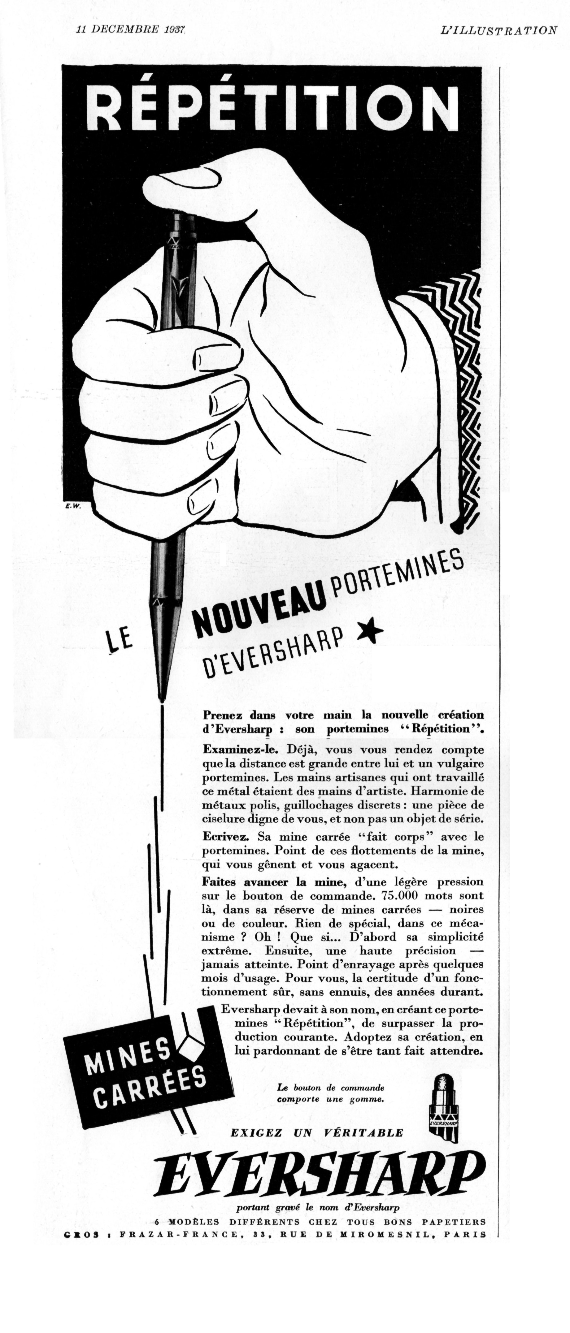 EVERSHARP - Repeating pencil. 1937-12-11. L'Illustration - Anno 95, n. 4945, pag. XV