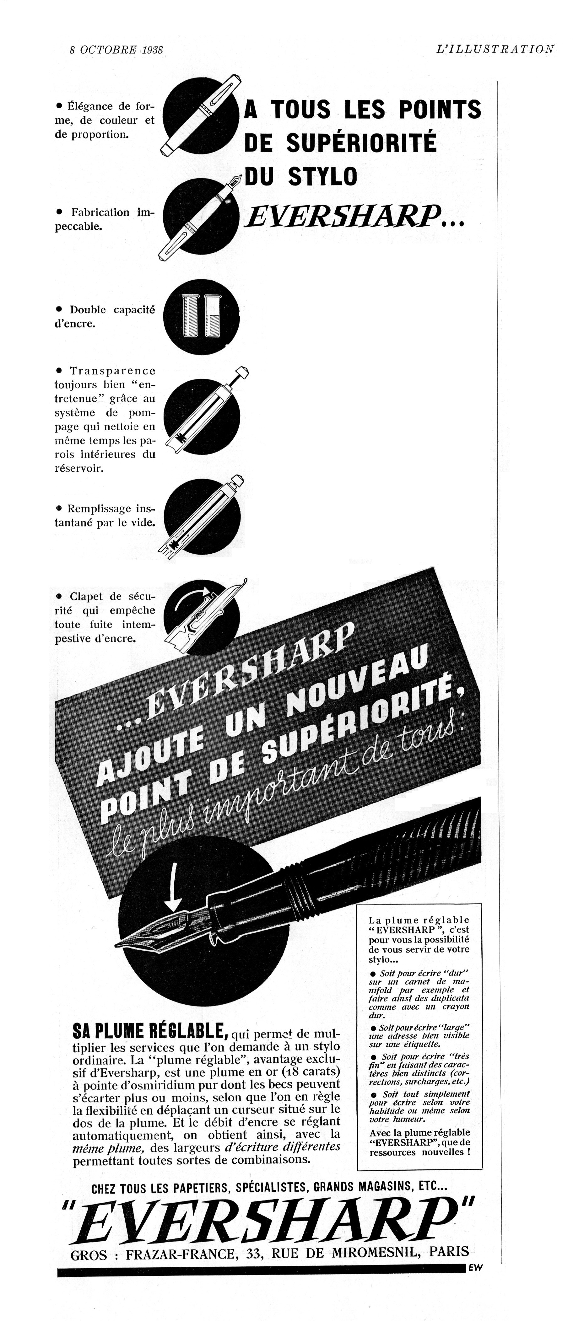 EVERSHARP -  Adjustable nib (Doric II). 1938-10-08. L'Illustration. Anno 96, n. 4988, pag. XXVII