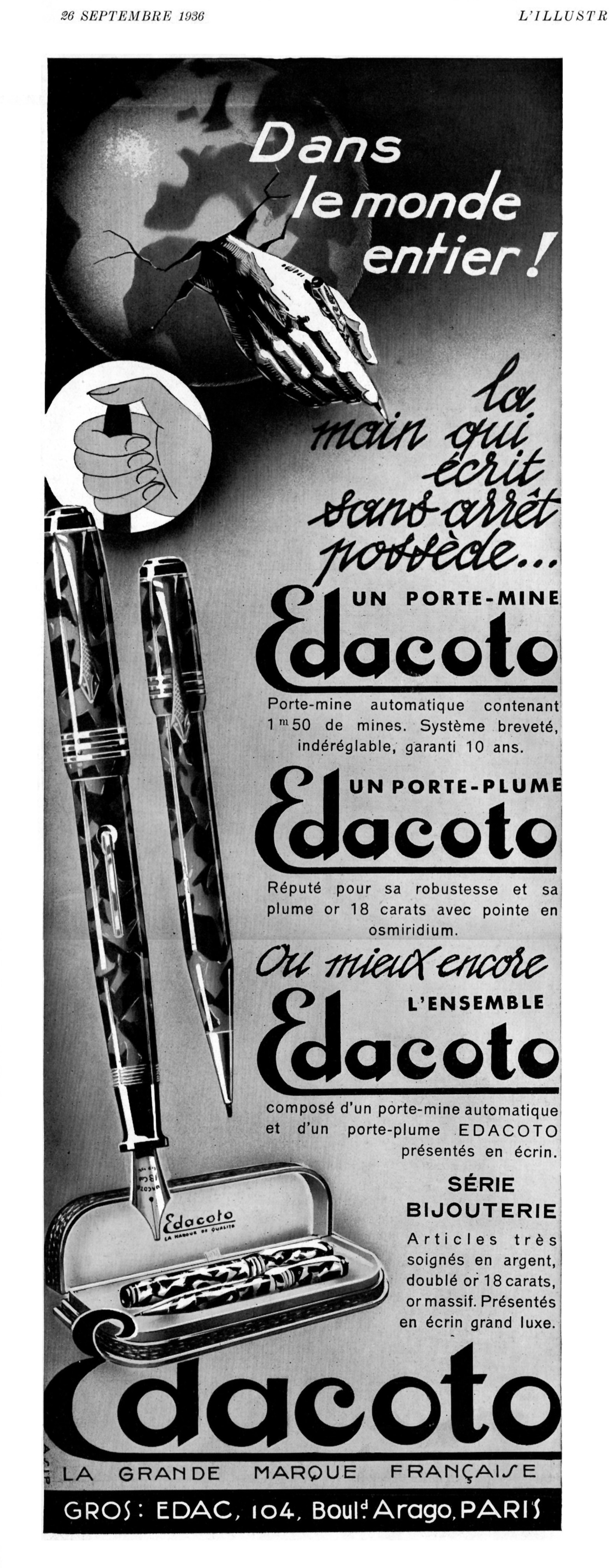 EDACOTO - Stilografica a leva e portamine - 1936-09-26. L'Illustration. Anno 94, n.4882, pag.VII