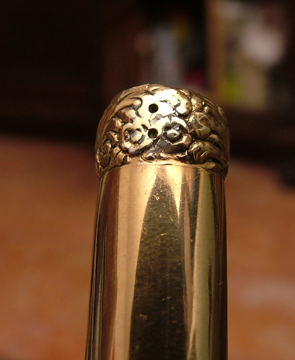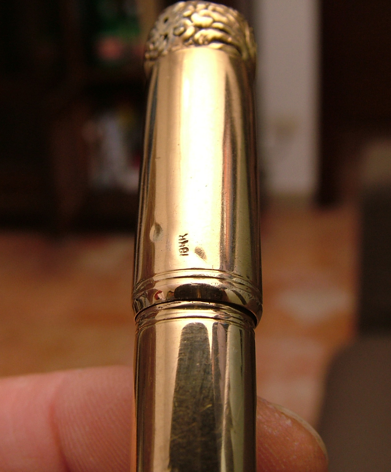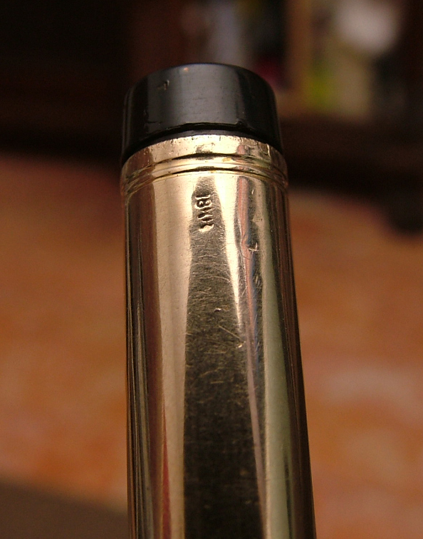 Vedendo la leggera ammaccatura sotto i fori della clip presuppongo che quello sia il punto della fine della clip, la penna è completamente priva di qualunque intarsio, è completamente liscia, tranne il pezzo superiore del cappuccio dove era fissata la clip e la parte inferiore in ebanite con la quale si effettua la rotazione per l'uscita del pennino.
