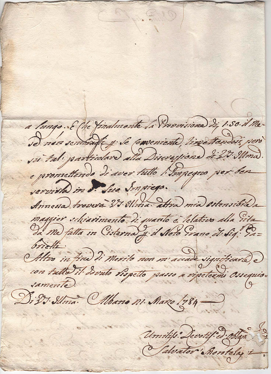 Una lettera del tardo Settecento è un ritrovamento importante. Catapulta all'istante in un mondo molto diverso da quello di oggi, a partire dagli strumenti di scrittura: la penna d'oca, una grafia corsiva molto gradevole esteticamente, fluente, tipica di chi è avvezzo a scrivere a mano, l'inchiostro ferrogallico che comincia ad ossidarsi, passando ormai dal nero pieno a vari toni di marrone.