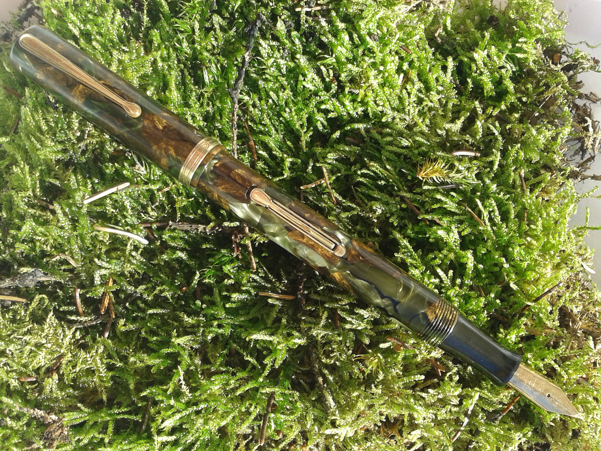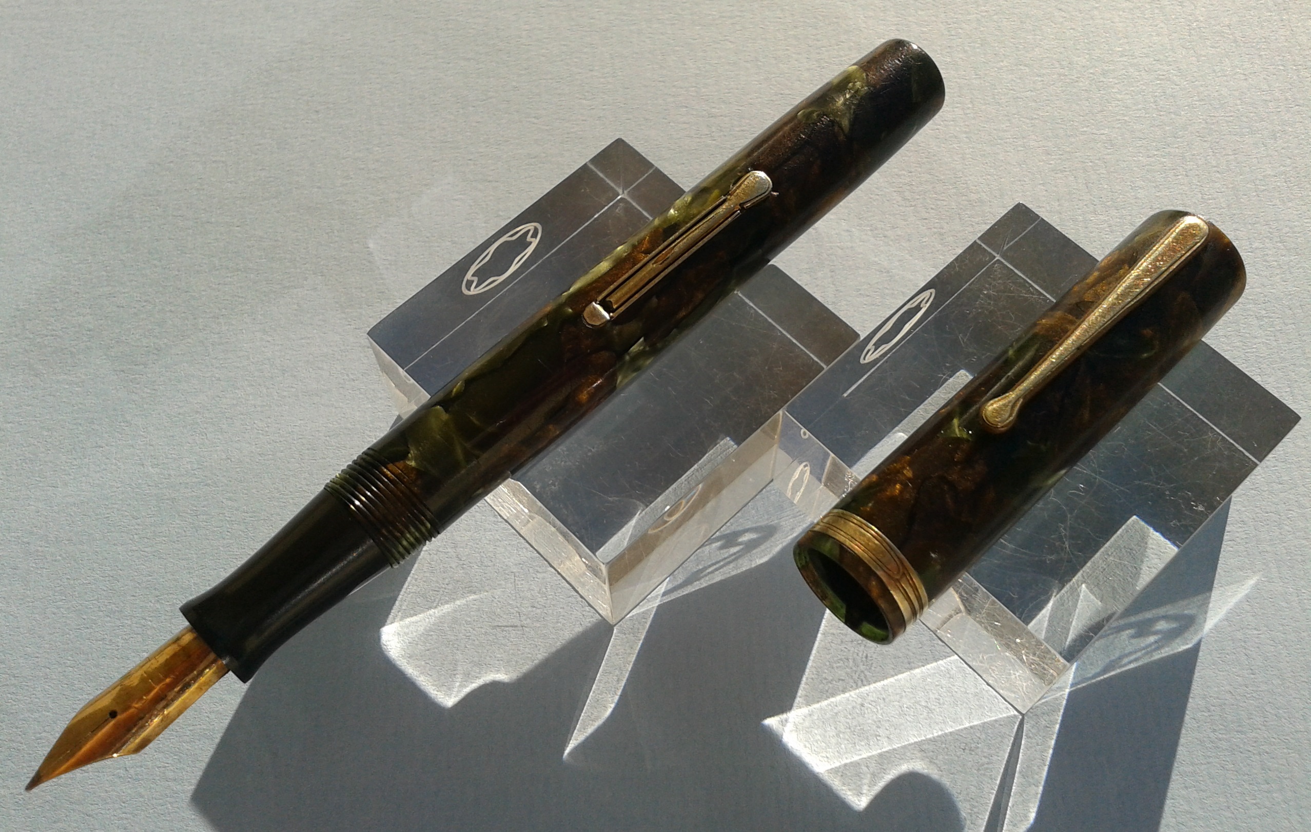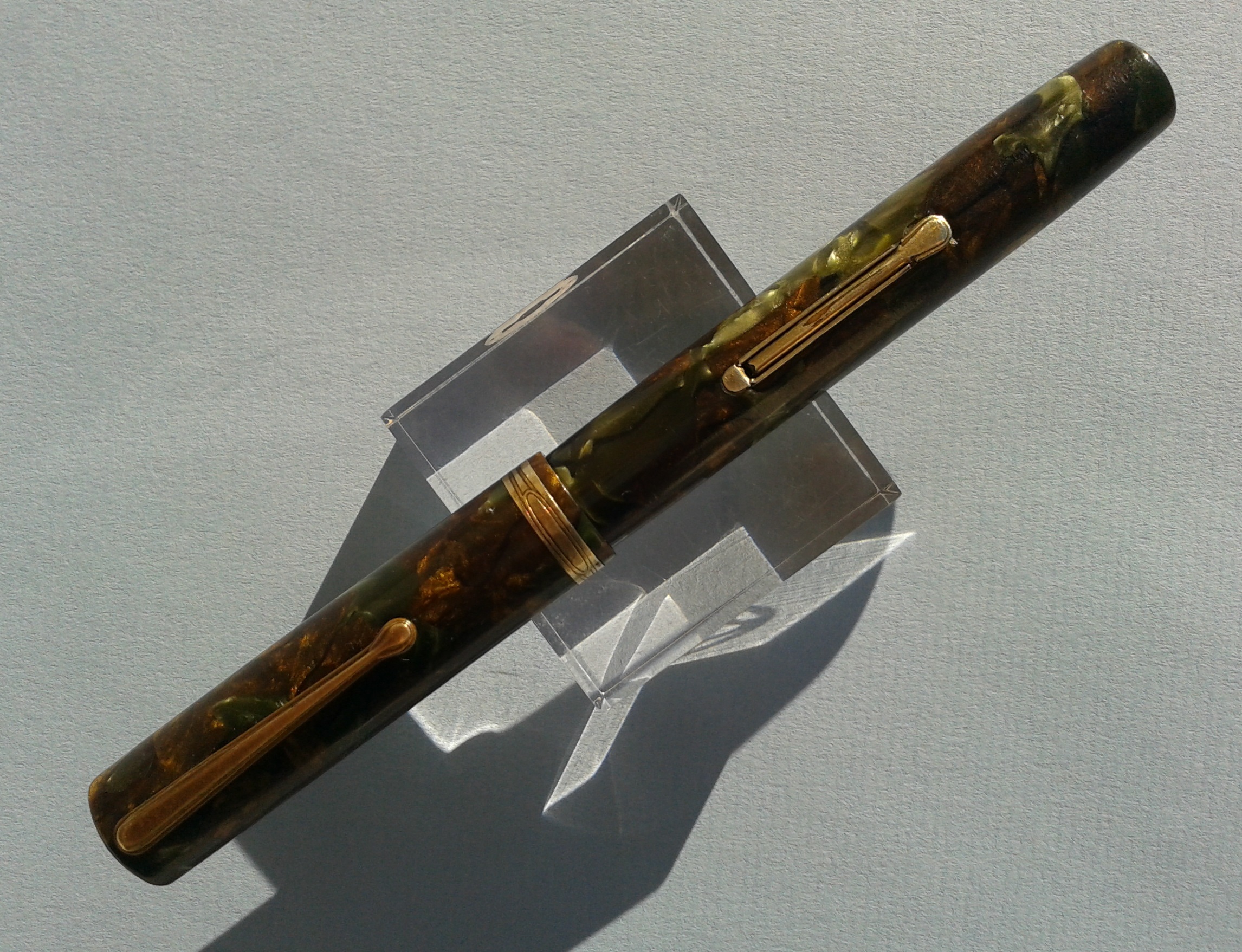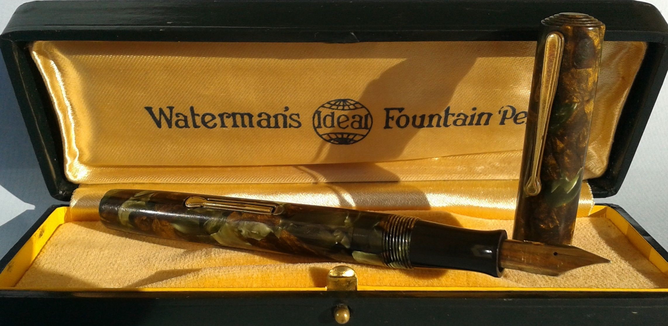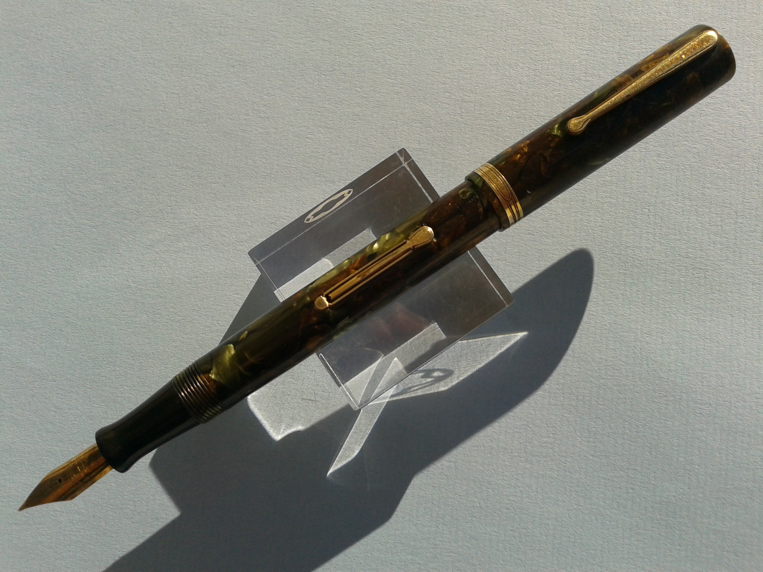 WATERMAN #94 in celluloide "moss agate" tornita da barra piena, minuterie metalliche laminate oro, pennino originale Waterman in oro 14 carati, caricamento a leva, produzione U.S.A. anno 1935. Le misure