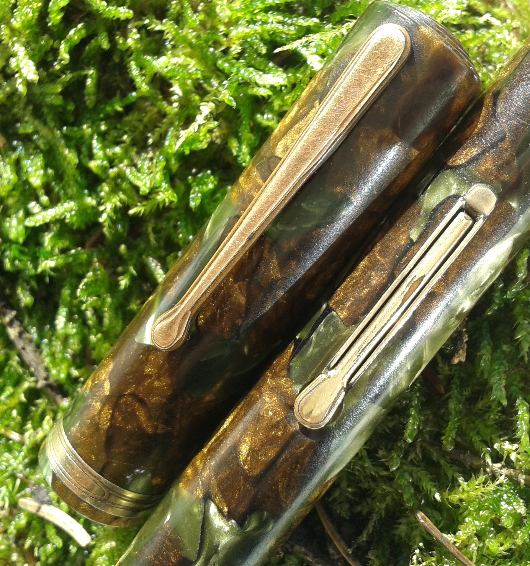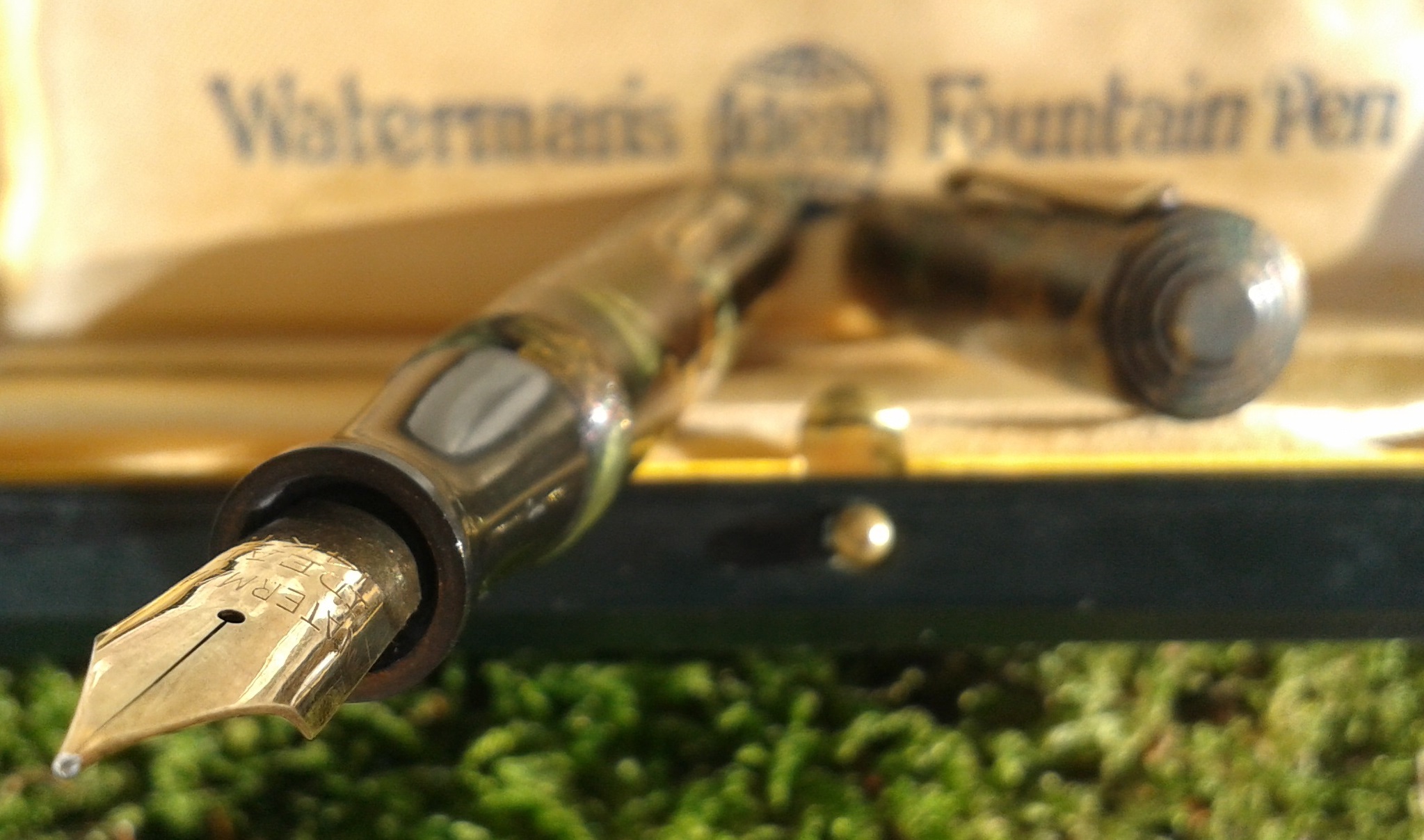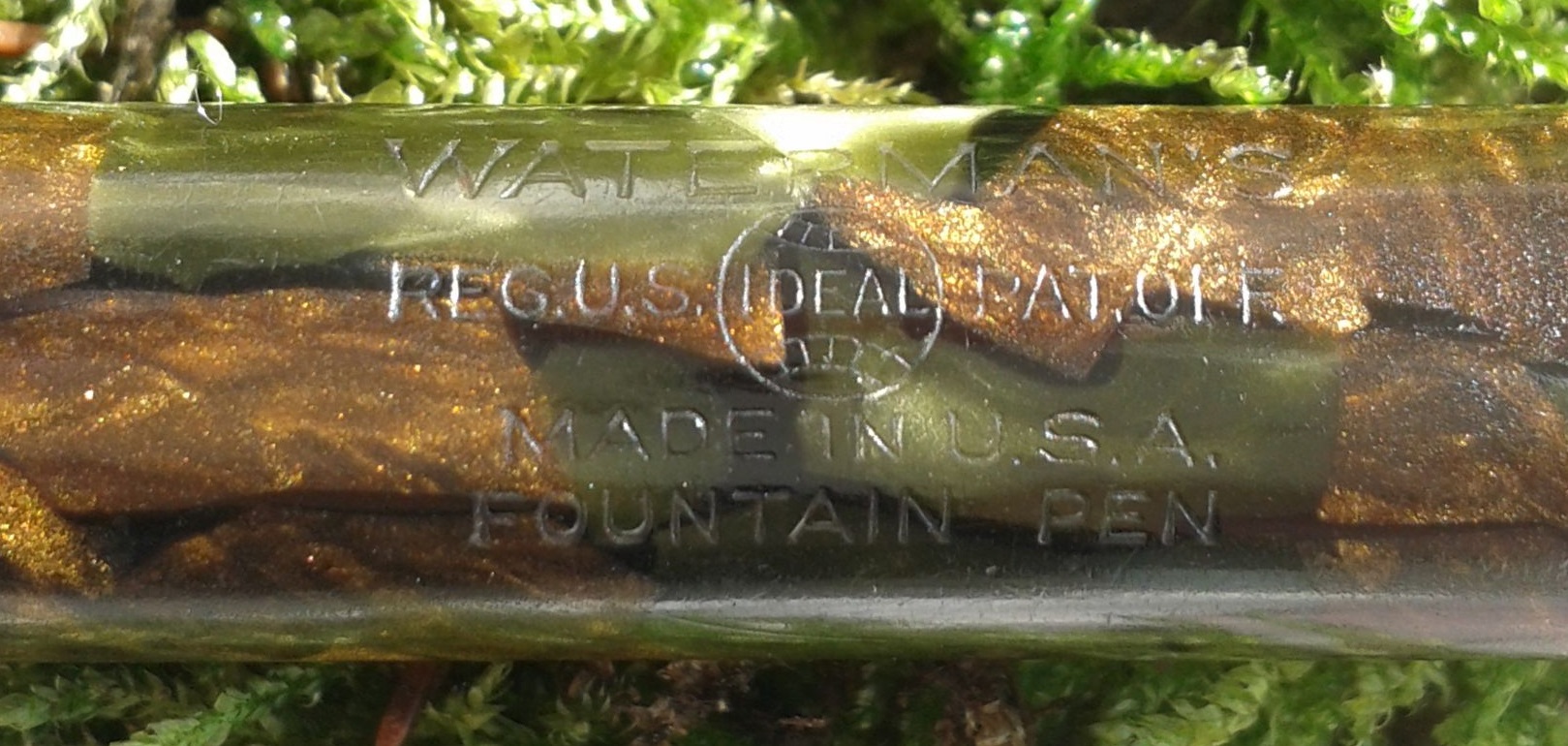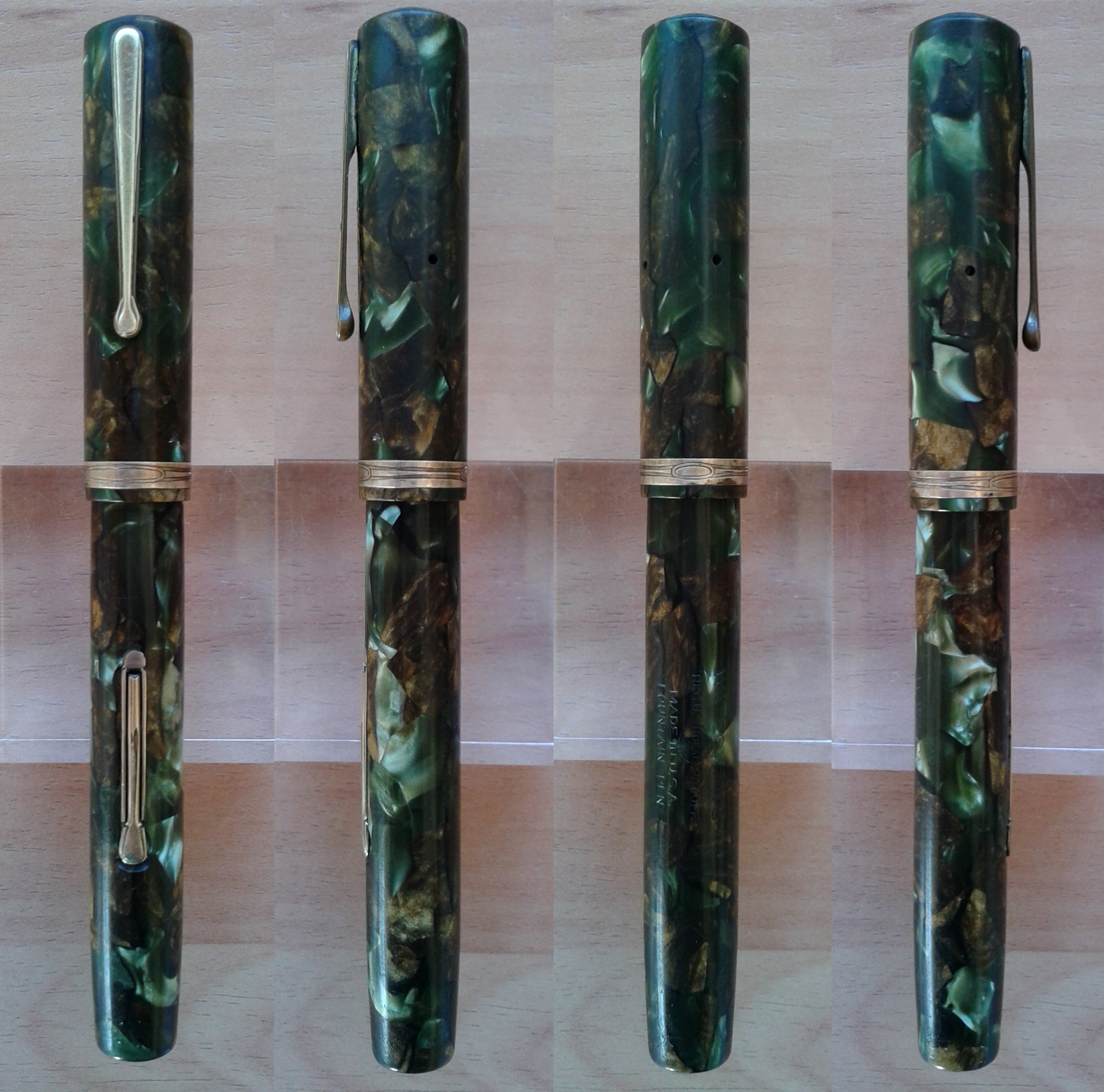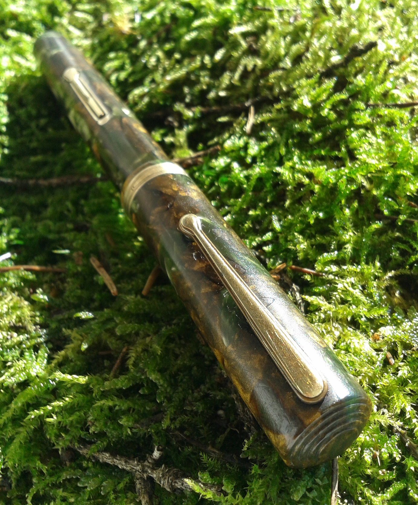 WATERMAN #94 in celluloide "moss agate" tornita da barra piena, minuterie metalliche laminate oro, pennino originale Waterman in oro 14 carati, caricamento a leva, produzione U.S.A. anno 1935. Le misure