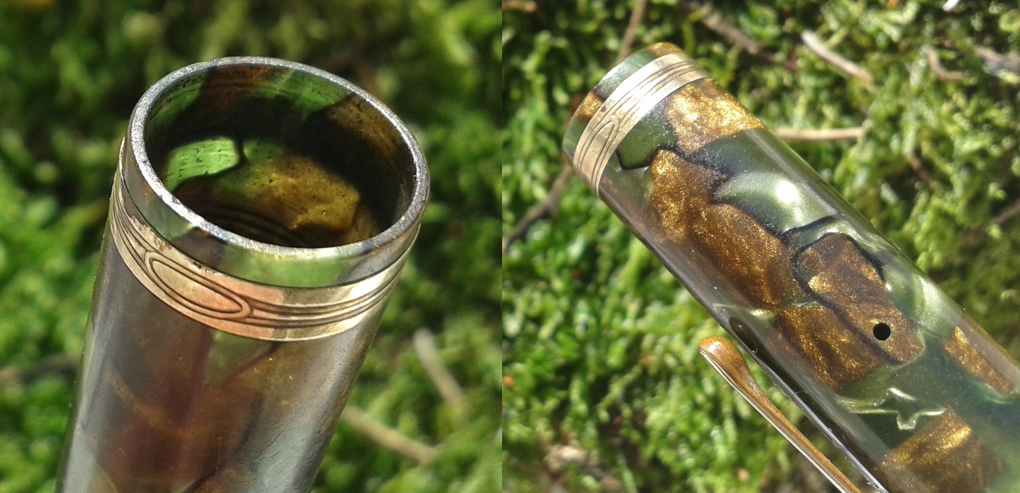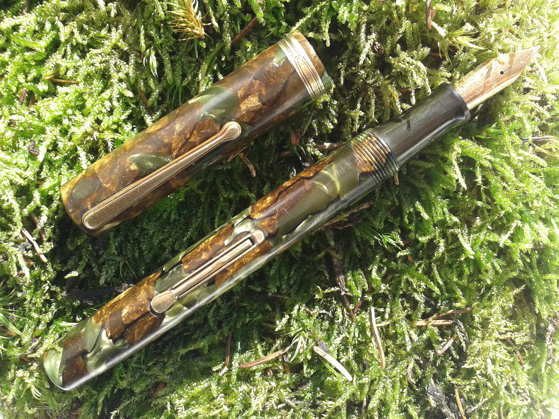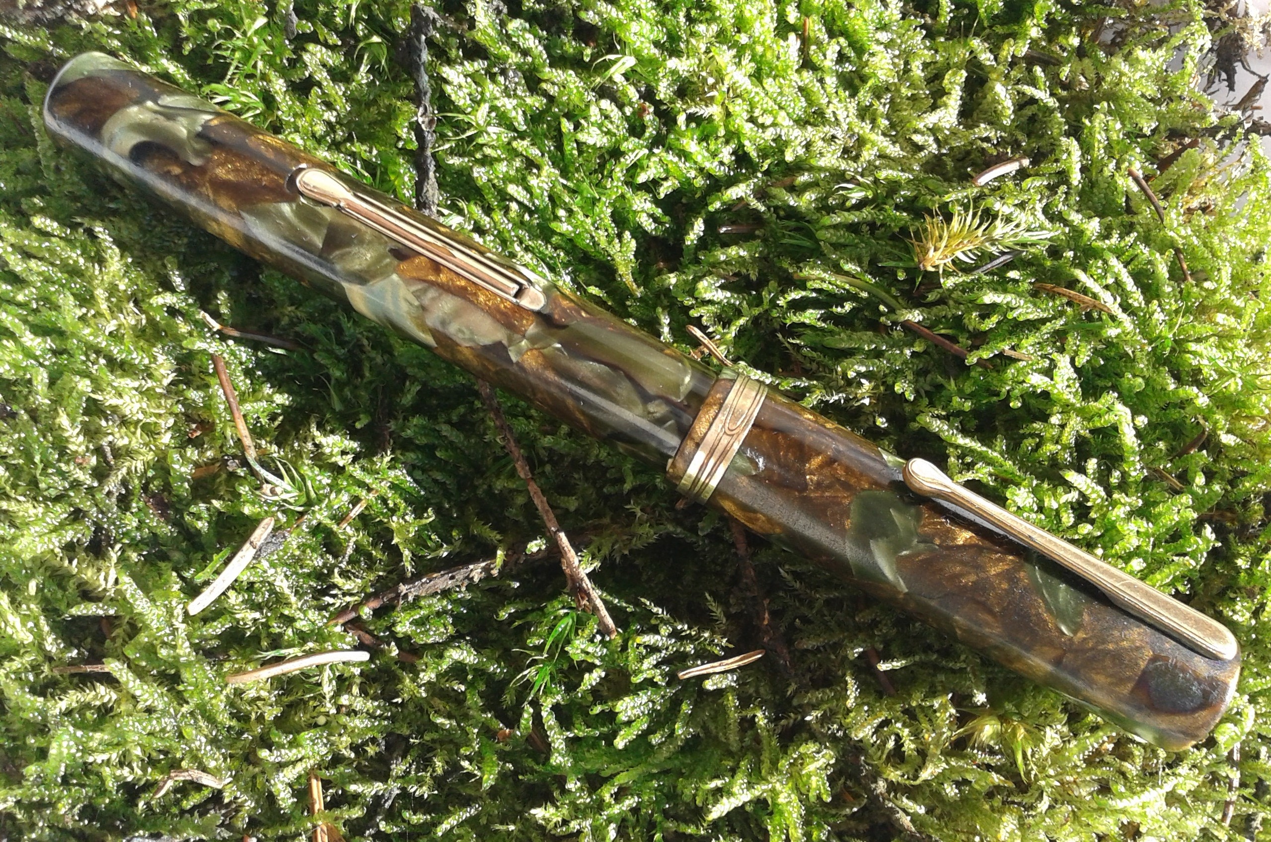 Partiamo dalla denominazione del colore della celluloide: "moss agate", ovvero "agata muschiata" in Italiano. Prendendo spunto dalle caratteristiche inclusioni che danno il nome al minerale, una volta tornato a casa ho preso un poco di muschio per il presepe ed ho fotografato la penna e la sua bella scatolina verde nel loro ambiente naturale...