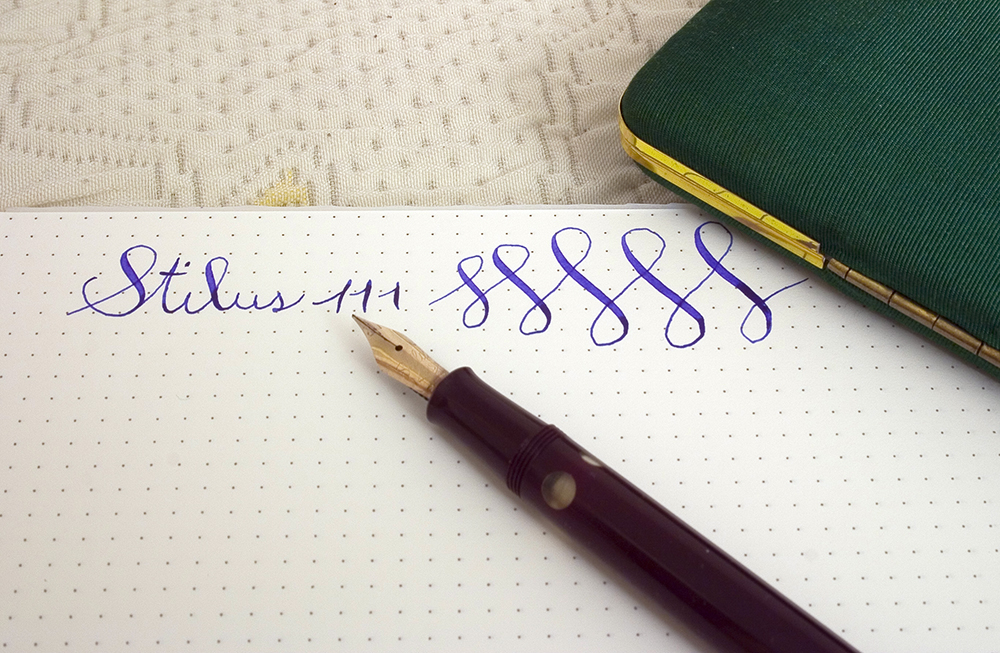 La 111 ha la carica a stantuffo (simpatici gli oblò) ed il pennino in oro 14K. con una buona flessibilità, ma con un tratto molto fine se si evita qualsiasi pressione.