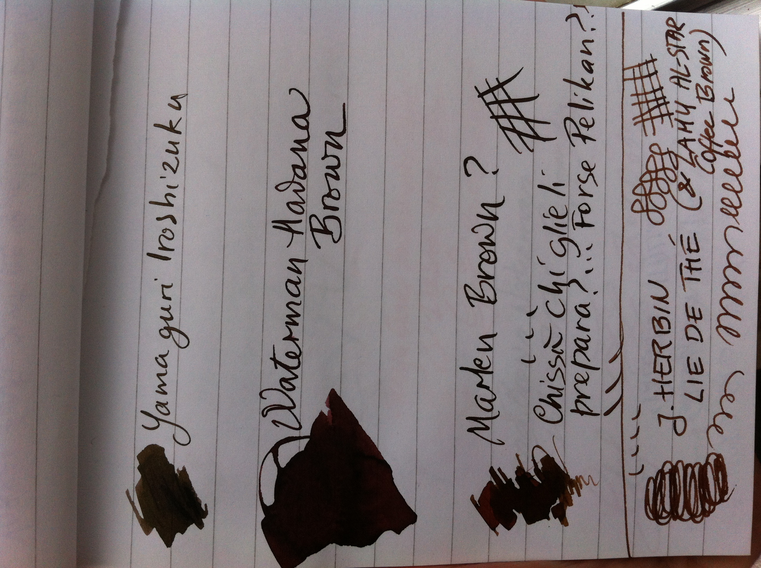Nella foto trovi anche una prova del Marlen Brown. Questo inchiostro mi è stato regalato all'acquisto di una stilografica Marlen (la Aleph del forum ;) ). Non saprei dirti se viene commercializzato. Sembra comunque molto, molto simile al Pelikan Brilliant Brown.