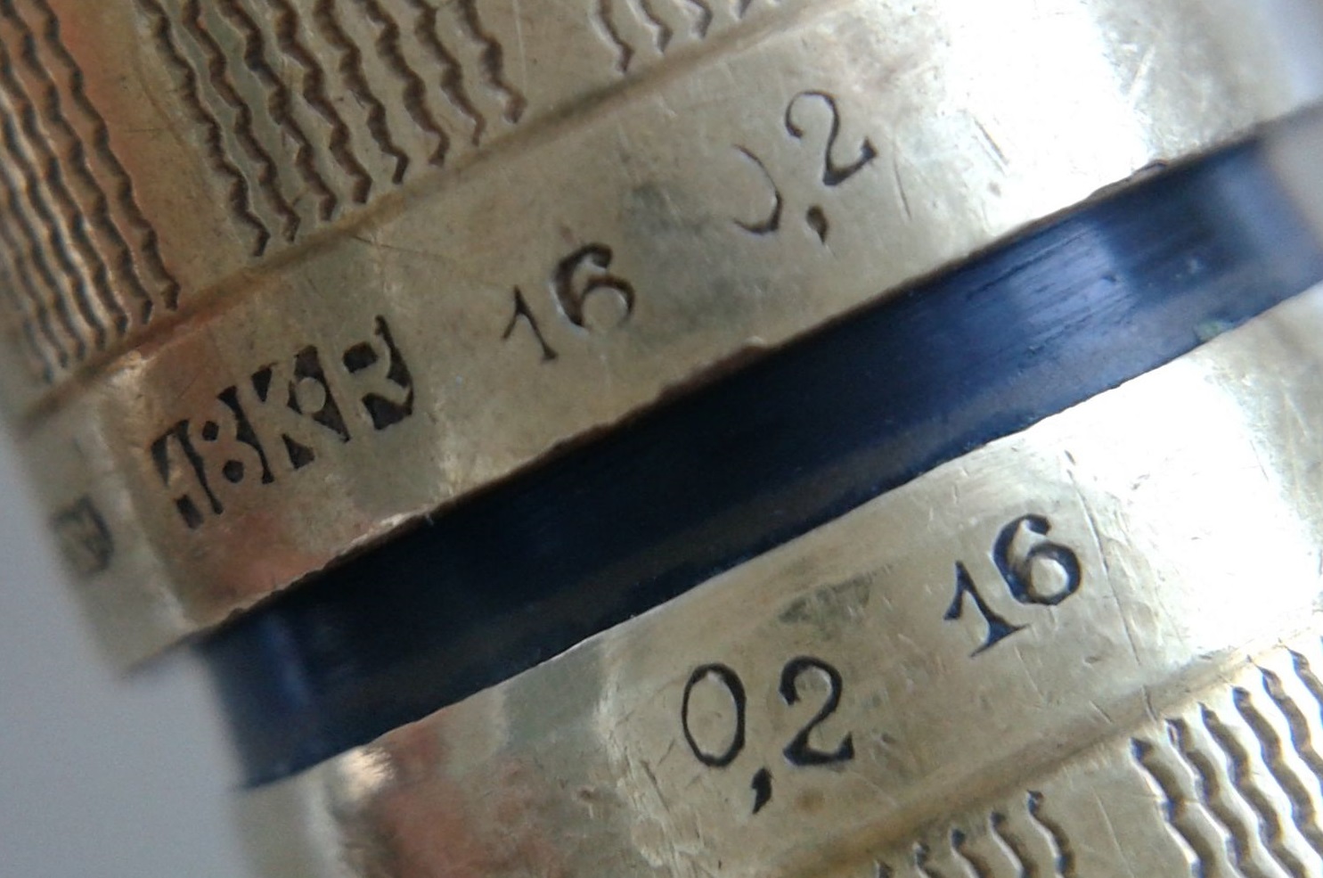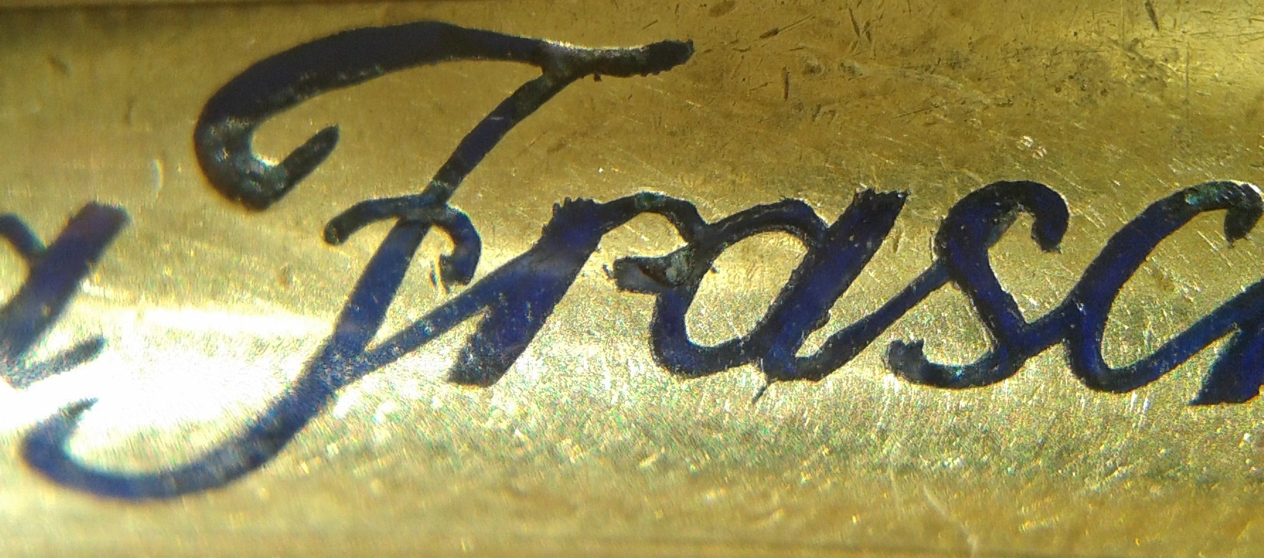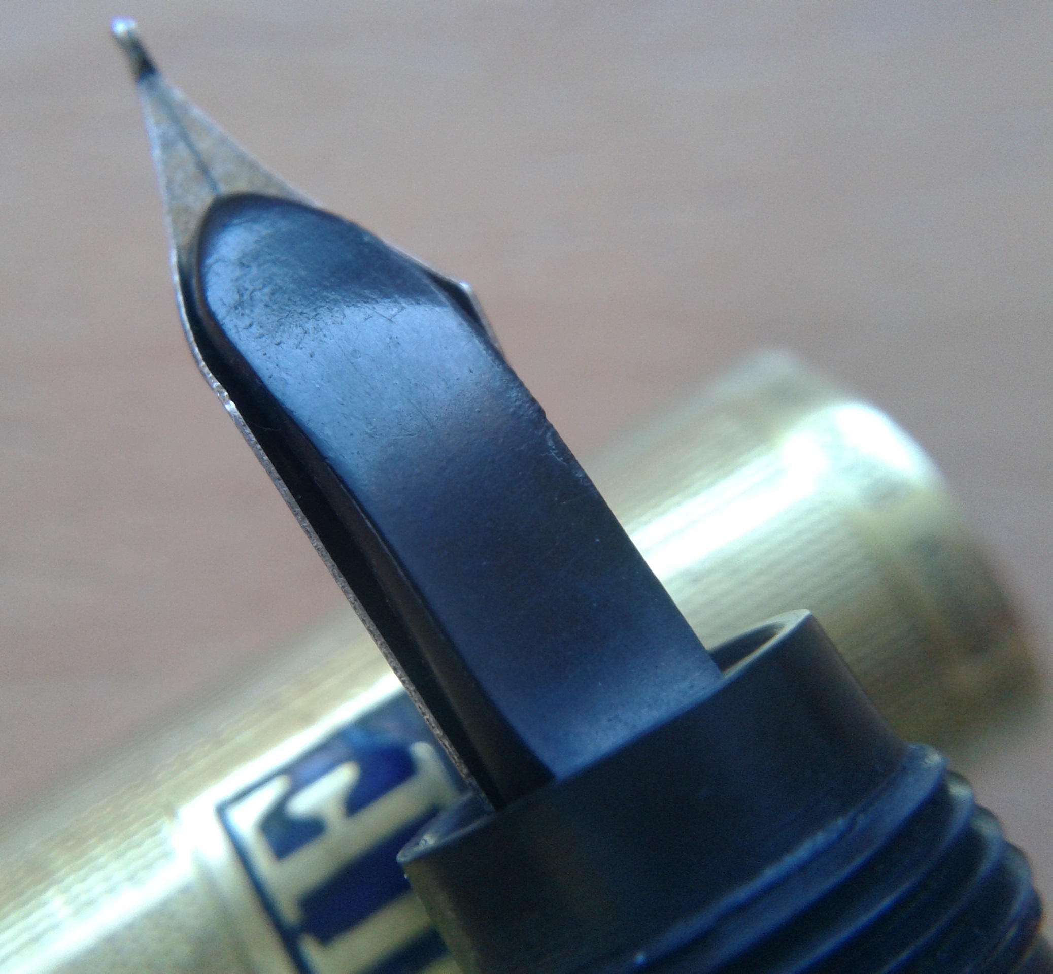Dovremo (solo per il momento, perchè non è troppo difficile trovarlo) rinunciare a mostrare l'iscrizione del pennino originale, mancante. Secondo il nostro Wiki deve essere punzonato oro 14k, avere foro di areazione circolare, essere marchiato con il logo ovoidale dell'azienda contenente la scritta "Aurora Torino" ed il numero relativo alla misura: nel caso di una RA2 dovrebbe ovviamente essere il #2, ma anche il # 2 e 1/2 è a volte presente (terzo aiuto!