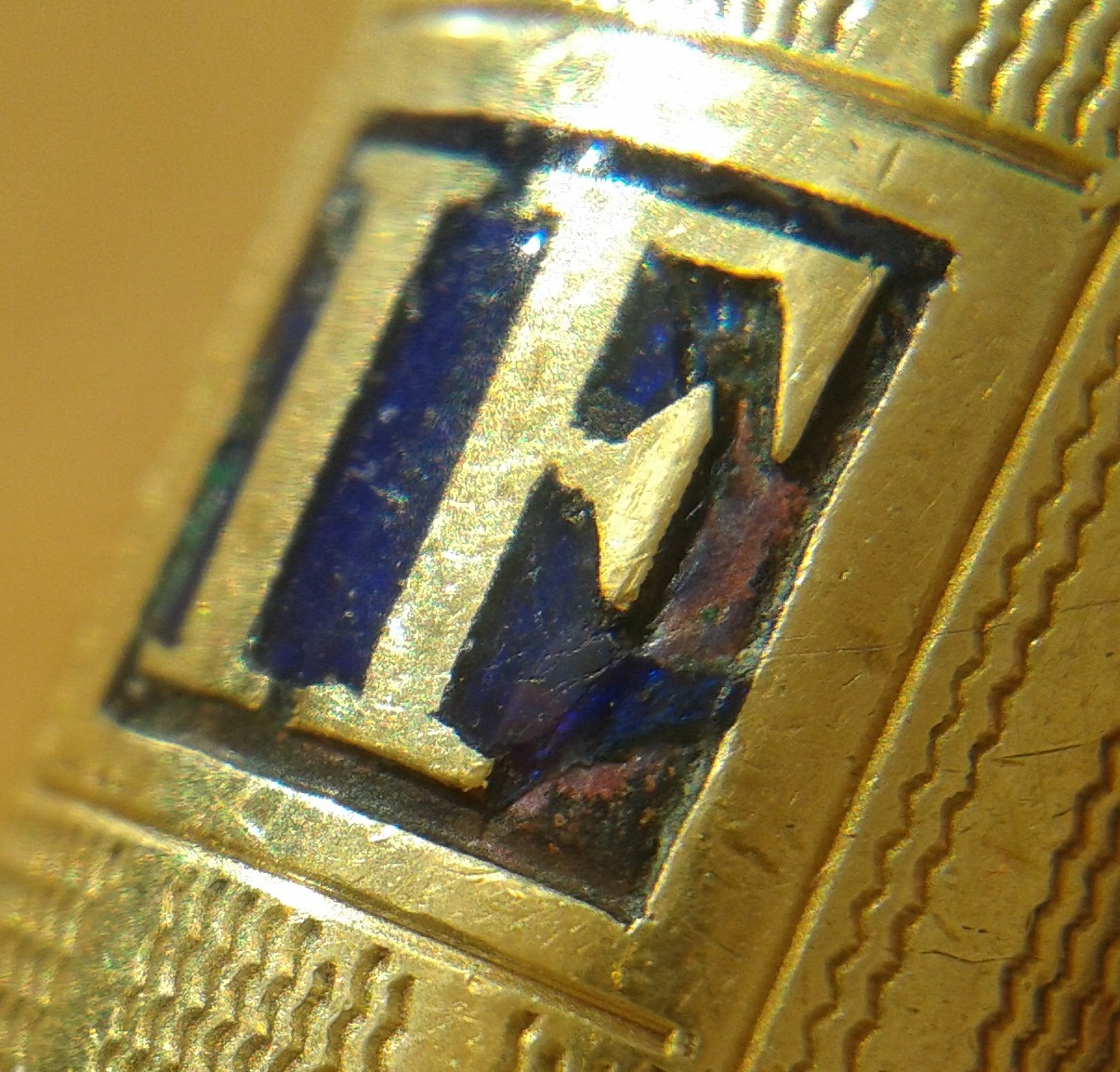 Il rivestimento perfettamente cilindrico in lamina d'oro 18 K.R. di fusto e cappuccio è suddiviso in 12 bande maggiori lavorate a guilloché (con effetto a "grana di riso") intervallate da altrettante bande, sensibilmente più piccole, dalla superficie liscia: l'abilità della lavorazione si giudica dalla capacità di raccordare otticamente a penna avvitata i diametri leggermente differenti delle sezioni. Le estremità di fusto e cappuccio sono lisce, così come i cartigli, rispettivamente rettangolare e quadrato, sui quali insiste la lavorazione a smalto.