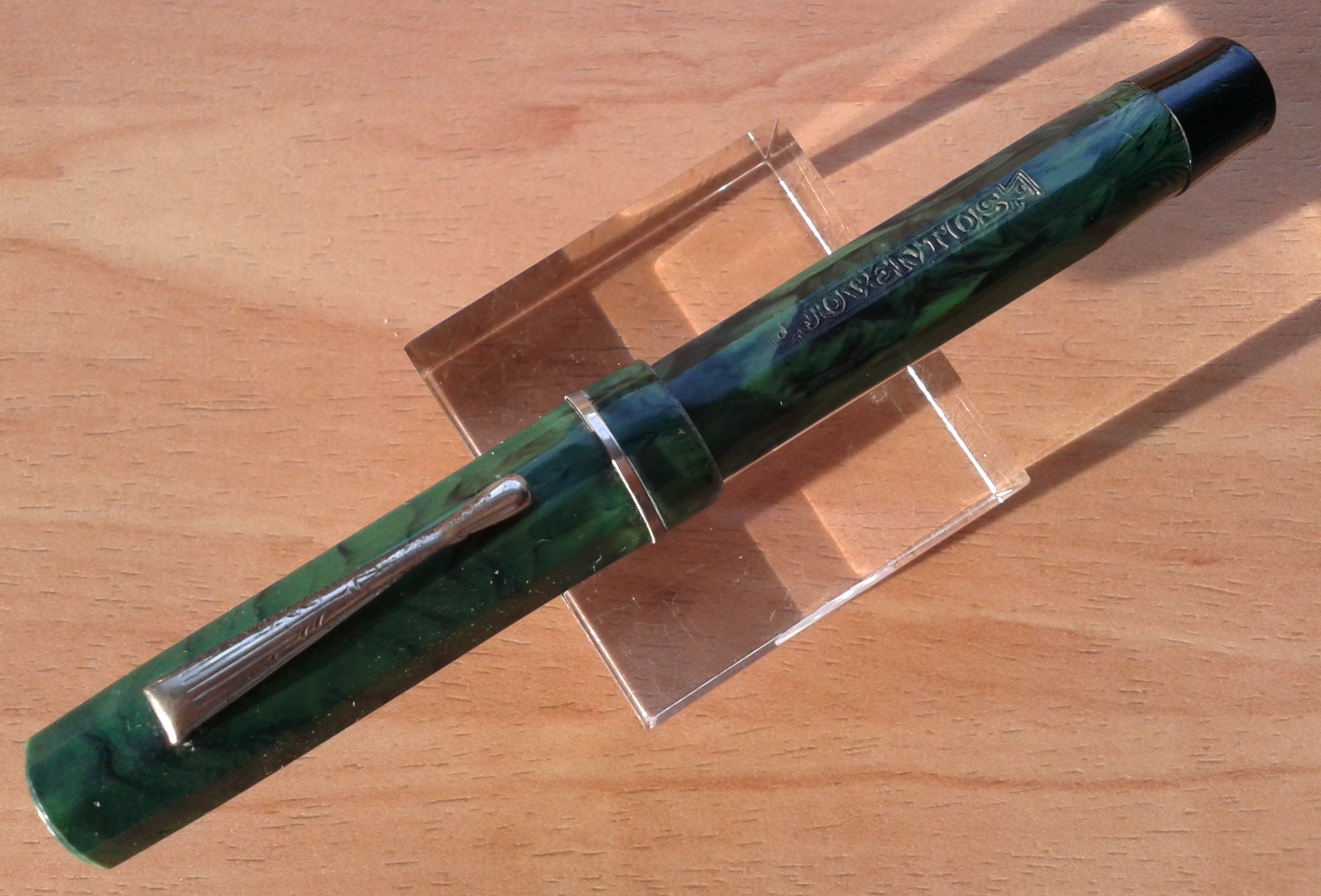 La (seconda ) penna JUVENTUS in galalite variegata verde-nera sfaccettata, lunga circa 11,5 cm., con pennino in acciaio, parti metalliche a vista cromate, caricamento a pulsante di fondo, produzione Italia fine anni 1930.