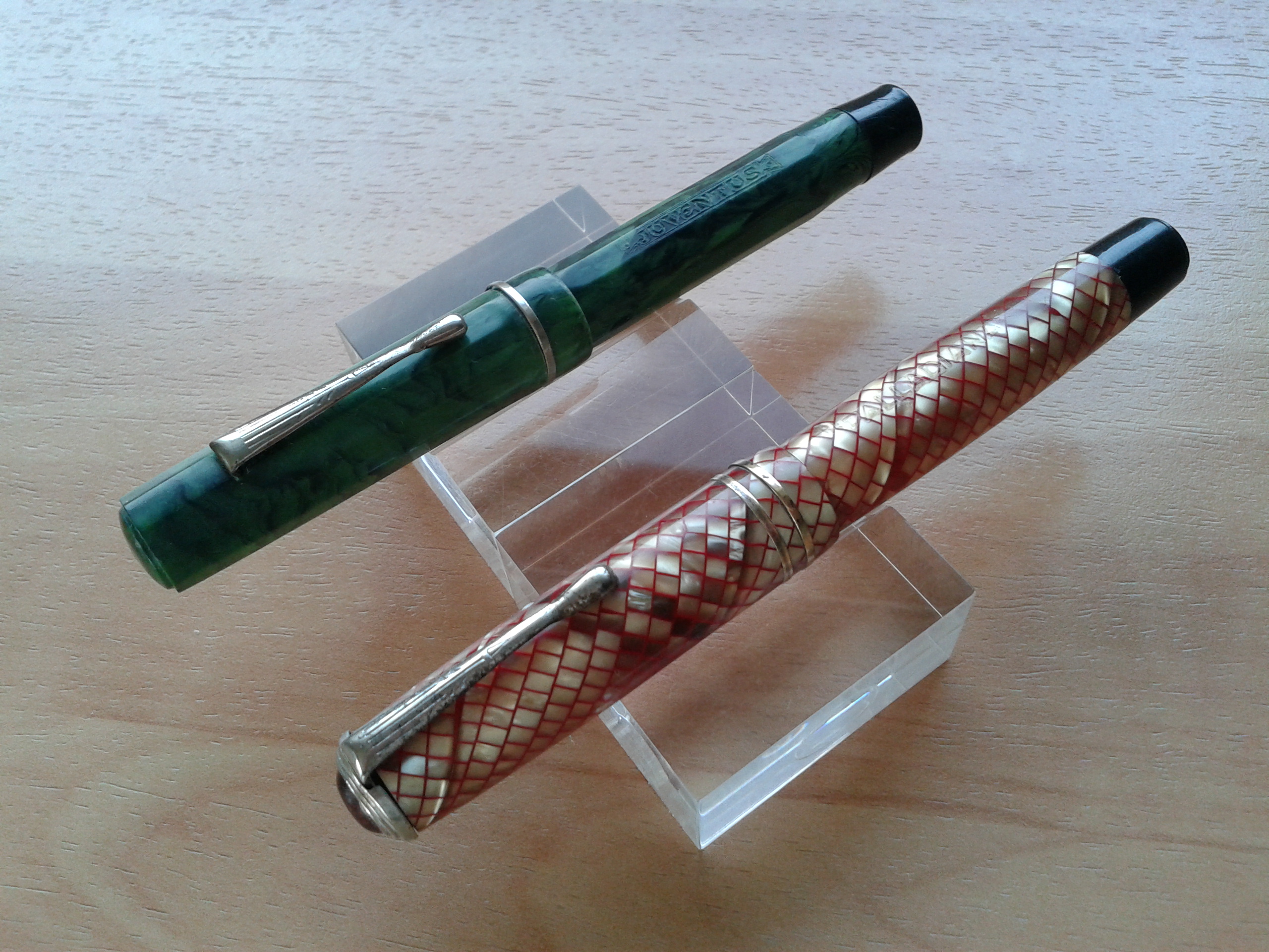 - sulla imprescindibile Enciclopedia di Letizia Jacopini (La Storia della Stilografica in Italia 1900-1950) a pag.106 compare una penna in galalite praticamente identica alla mia "Juventus" ma marchiata "ITALO FRV", mentre a pag.109 è fotografata una "Palladiana" in celluloide pelle di serpente ma senza la testina con jewel.