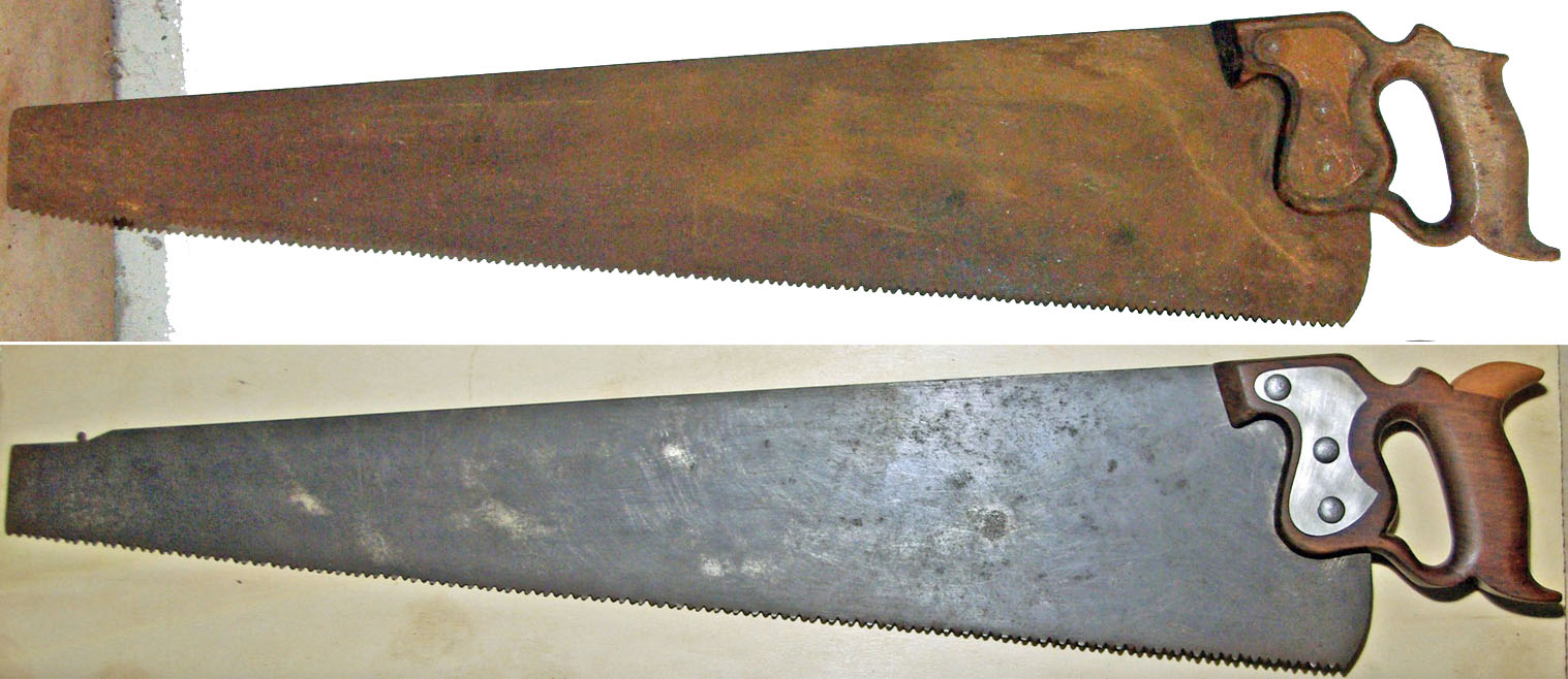 Si tratta di un segaccio, abbastanza grande, che probabilmente ha passato diverso tempo all'aperto, sbattuto di qua e di la senza nessuna attenzione in attesa di finire in discarica. Aveva il manico danneggiato (e qui un collezionista avrebbe già storto il naso), una guancetta di metallo mancante sul retro del manico,(colpo di tosse dal collezionista), la ruggine sulla lama non consente di risalire al produttore (il collezionista guarda le montagne).