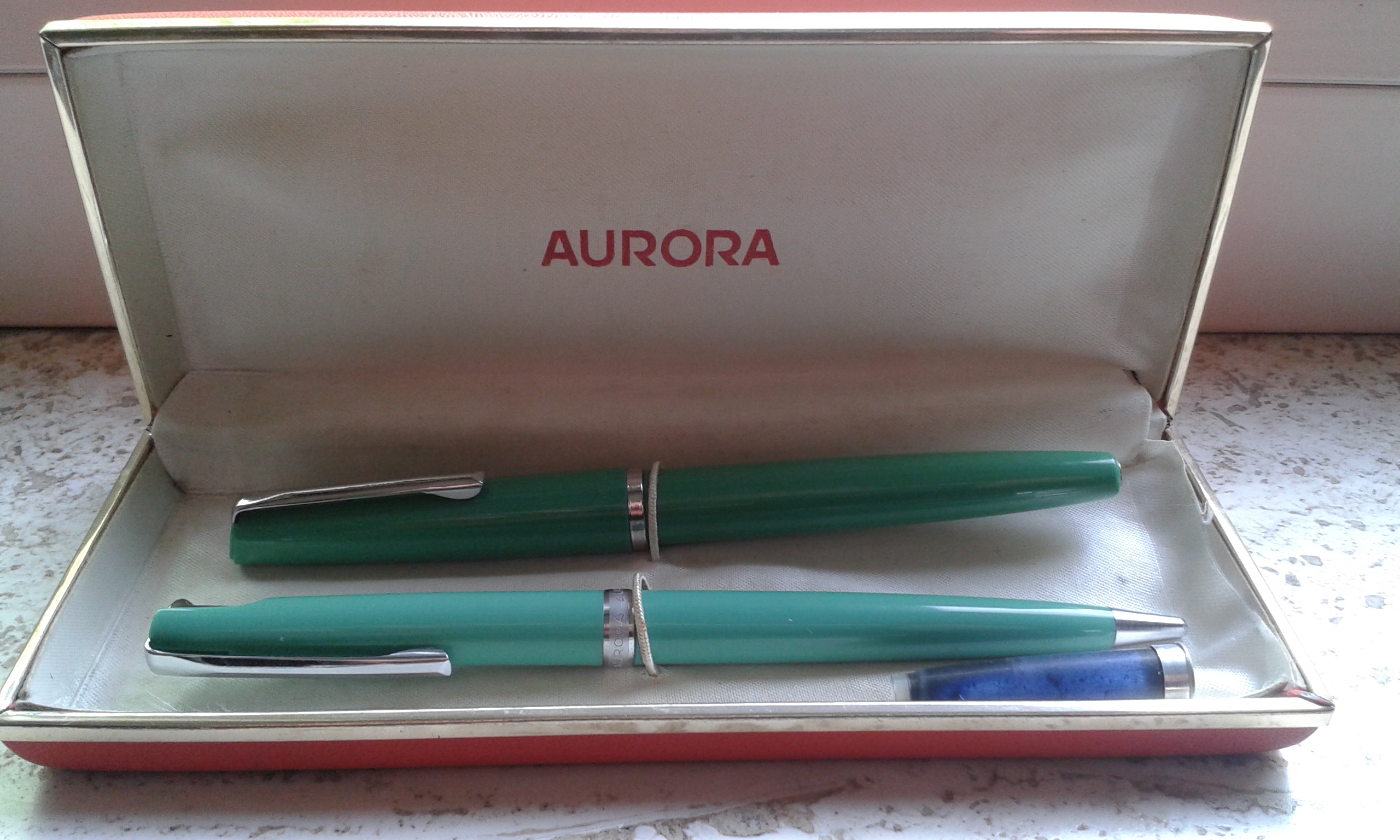 Scovata in un mercatino una parure Aurora composta da stilo e biro ( modello Auretta) con annesse cartucce, il tutto con scatola d'epoca.