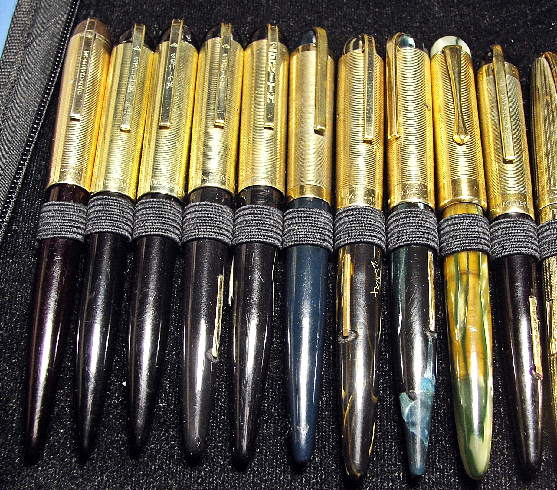 Da sx: Eversharp Skyline, 4 Zenith Montegrappa, di cui 3 stilografiche ed una biro; anonima; 2 Zemax; Aurea con strana clip ed una Everckat (sic)