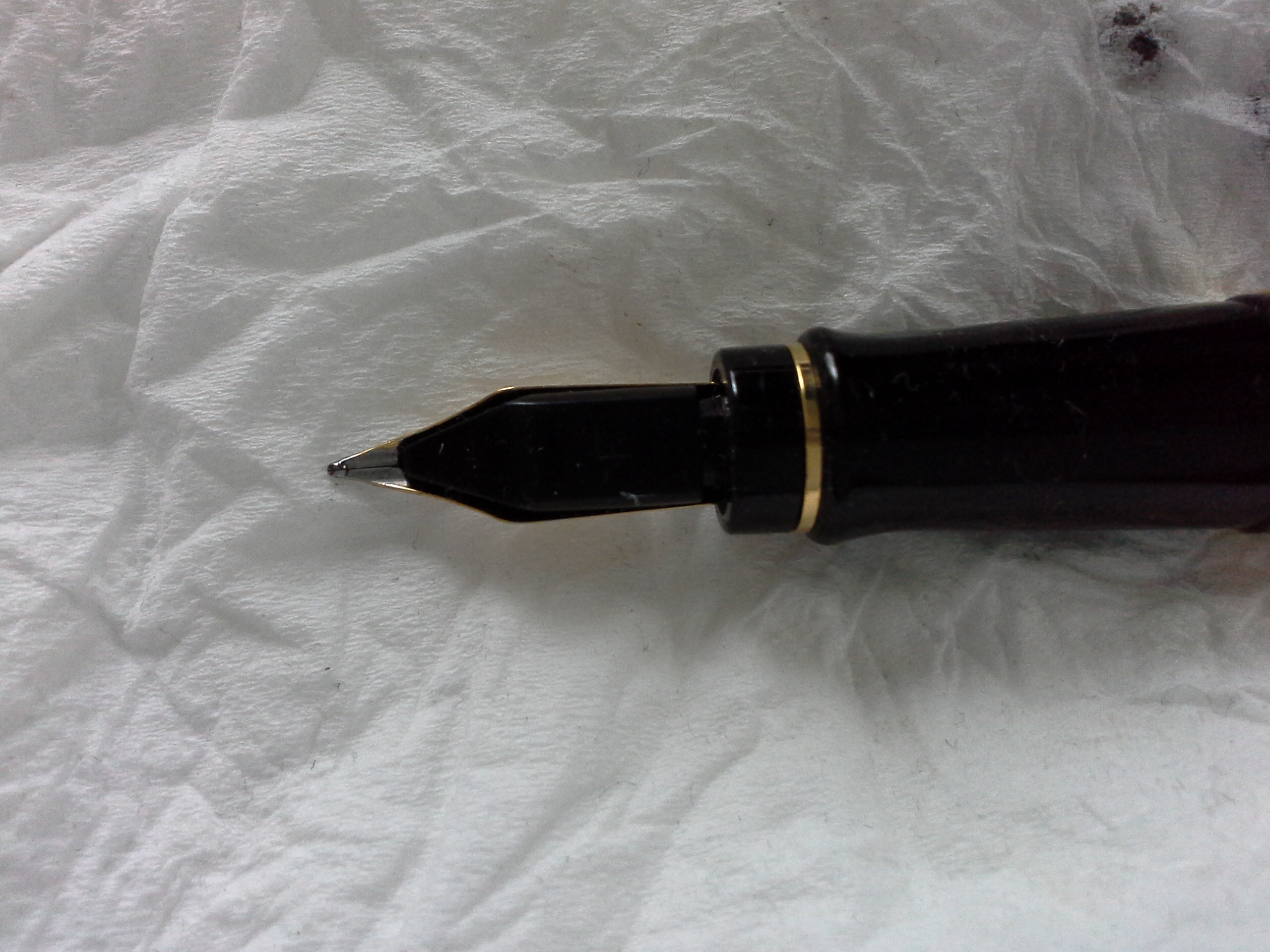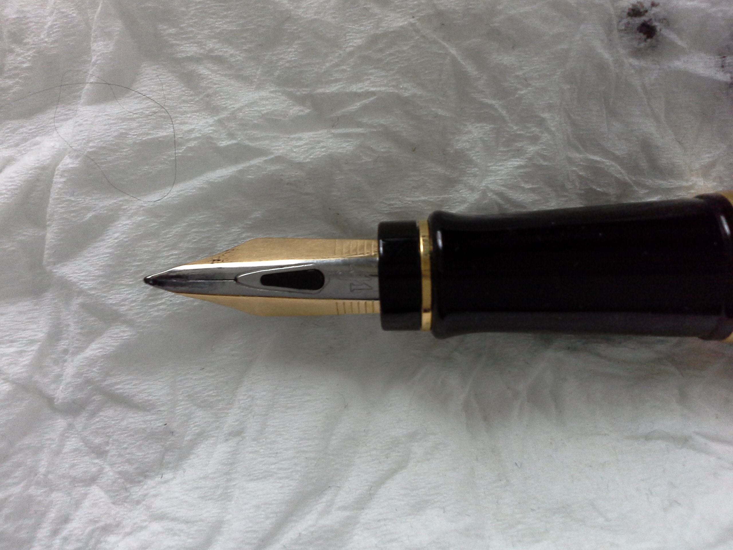 Ho da poco ricevuto una Waterman Expert prima generazione, praticamente nuova. Il pennino non è scorrevole come quello dell'altra Expert in mio possesso e ha un tratto molto più fine. Ciò potrebbe essere dovuto al fatto che è nuova, ma non vorrei che potesse influire la posizione del pennino, che devia leggermente verso destra (guardando dall'alto):