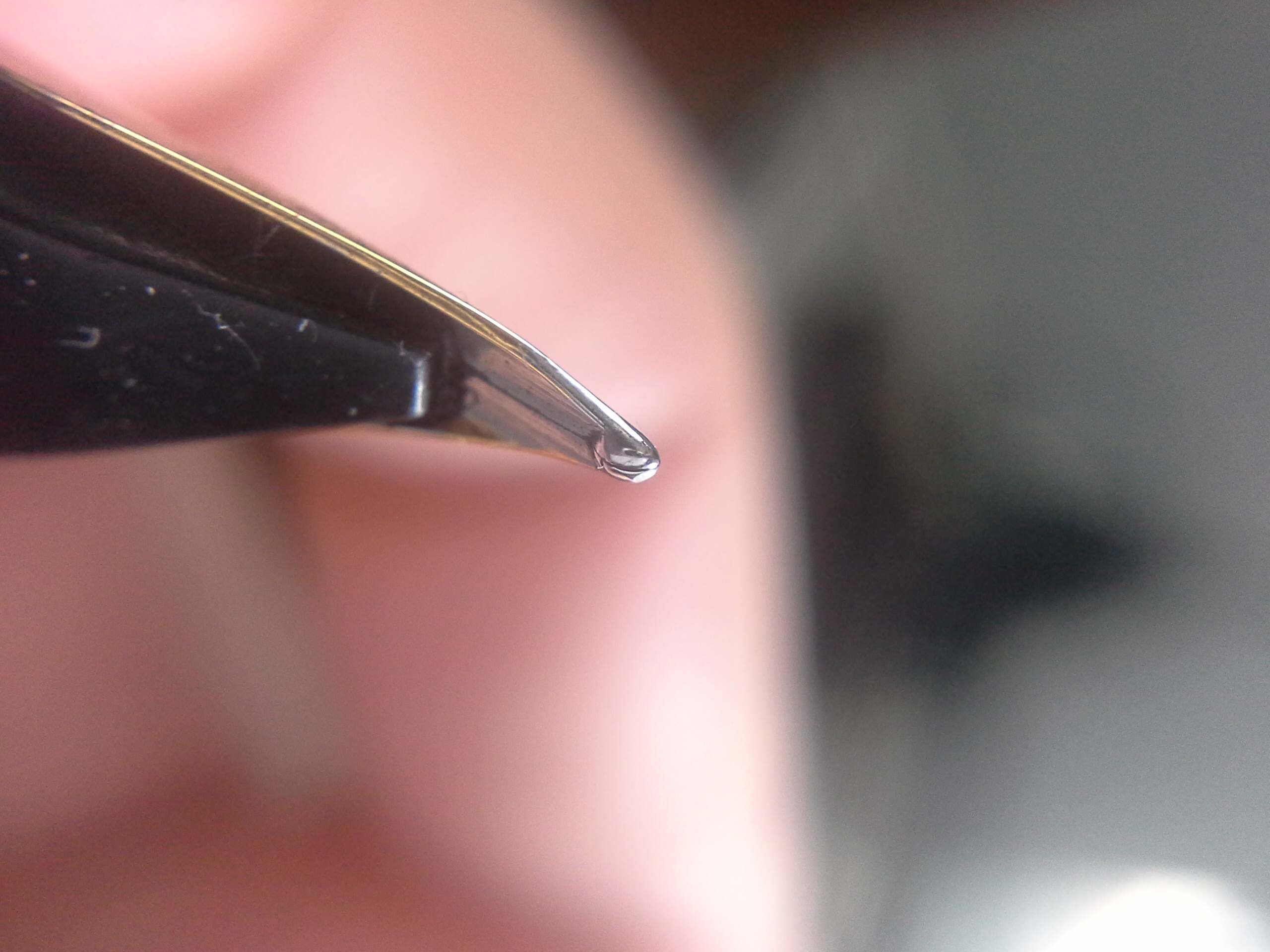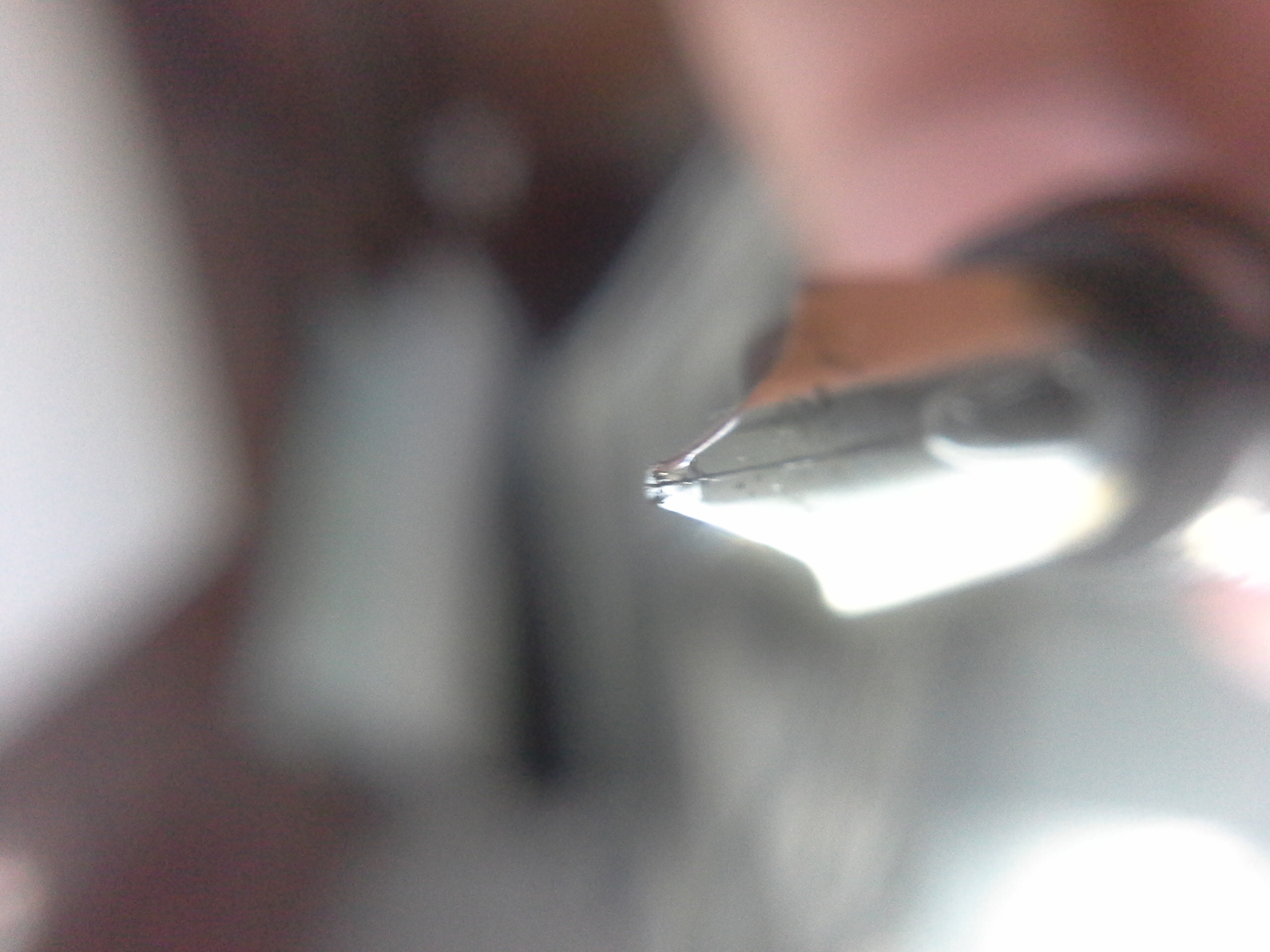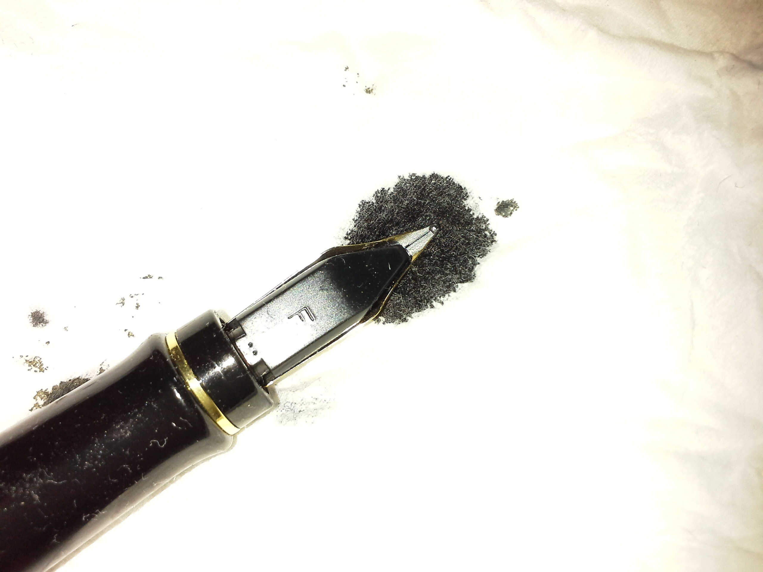 Però però... non potrebbe essere semplicemente un piccolo difetto di fabbrica, col rebbio di destra leggermente più alto? Mi sembra che tra i due rebbi ci sia uno stacco di lieve entità ma piuttosto netto, differente dal tipico modellamento da utilizzo. Ho provato a scrivere ruotando leggermente il pennino nella posizione in cui un ipotetico utilizzatore precedente avrebbe potuto utilizzarlo, ma non ho riscontrato differenze apprezzabili. La levigatura sulla punta nella prima foto potrebbe essere un effetto dovuto al riflesso della luce?
