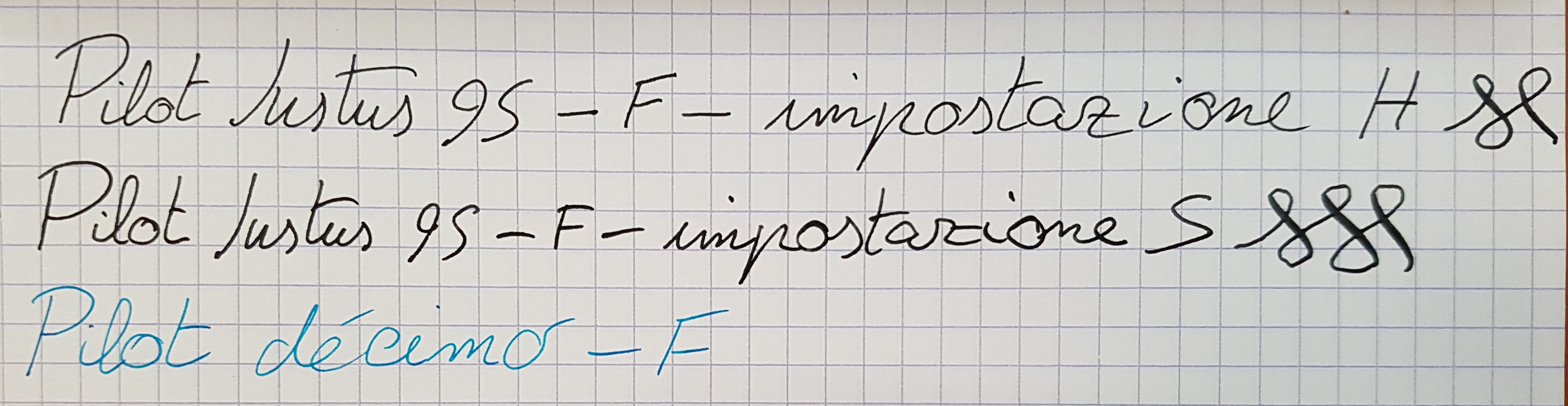 Dunque, a mio avviso e a parità di dimensione (io mi riferisco al tratto Fine, quello a me noto), direi che i più fini siano i pennini in acciaio della 78G (a cui mi riferisco per esperienza personale), Prera, Metropolitan/MR e Kakuno. Appena sopra direi i pennini 14k delle serie Custom e Custom Heritage, con i pennini Soft forse un pelino più larghi di tratto se usati con pressione "normale" sulla punta. Ho provato solo una volta un pennino F dimensione #10 (penso su una Custom Heritage 912), e mi sembrava un filino più soggetto a flessione e quindi potenzialmente una virgola più largo durante l'uso. Non ho esperienza di pennini #15 della Custom 743 o 823 e di quelli #20 della 845. Riguardo le Capless, i pennini nella cosiddetta "special alloy" (leggasi acciaio) disponibili solo in Giappone dovrebbero essere più rigidi dei 18k delle normali Capless, ma già questi ultimi sono piuttosto rigidi, e nella mia esperienza hanno un tratto tendenzialmente un pochino superiore a quelli 14k delle Custom (confronto tra la mia Décimo e la Custom Heritage 91). Il pennino della Justus 95 fa parte di una categoria un po' a sé stante, lo trovo il più largo (ancora più se in impostazione Soft) tra i Pilot F che abbia mai provato, ma è anche indubbiamente il più scorrevole: non poca cosa per un pennino che comunque, a mio avviso, offre uno dei migliori rapporti tra usabilità quotidiana e morbidezza del pennino attualmente sul mercato. Perché adoro i pennini flessibili vintage, ma davvero non riuscirei a prenderci gli appunti. Il pennino FA è uno di quelli che mi ha sempre maggiormente incuriosito, e difatti è presente nella mia lista desideri. Pennino molto interessante, ma da quanto ho capito il suo essere indirizzato alla scrittura giapponese, fatta di tanti tratti brevi, lo rende problematico per il nostro corsivo. Il pennino di dimensione #15 della Custom 743 dovrebbe essere il meno peggio, ma se come me preferite il design flat top e rodio della serie Heritage, noterete che la 743 è la sorella maggiore della 742, ma la 912 è già la più grande delle sue sorelle :(